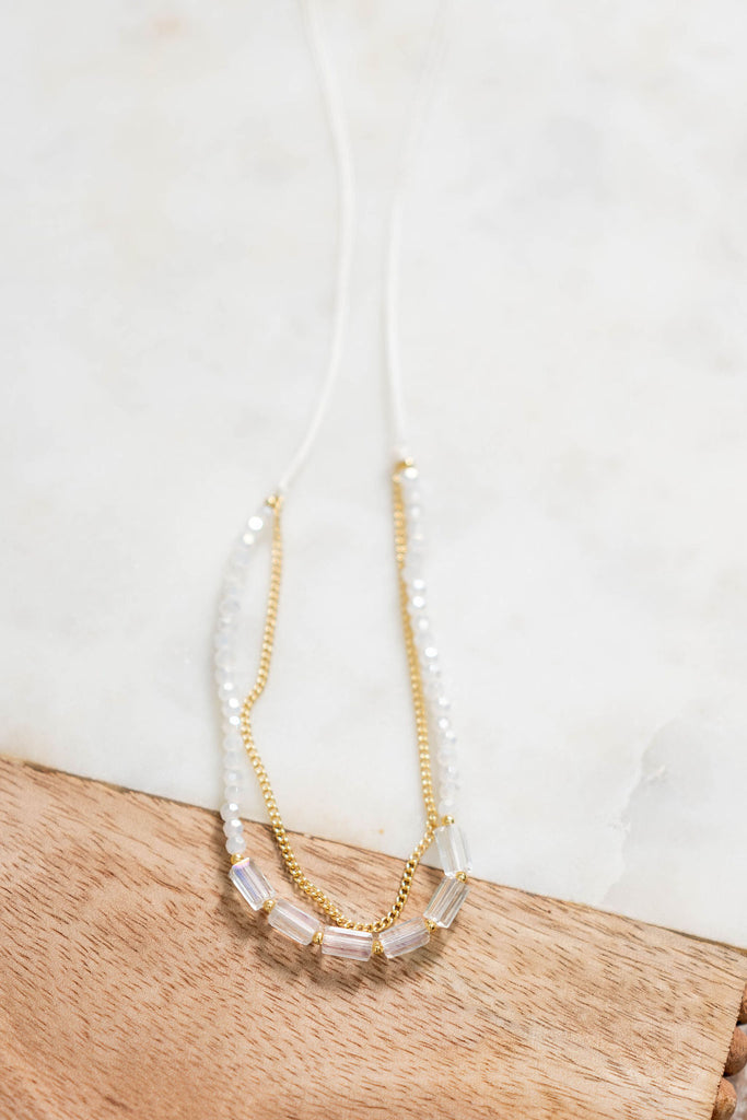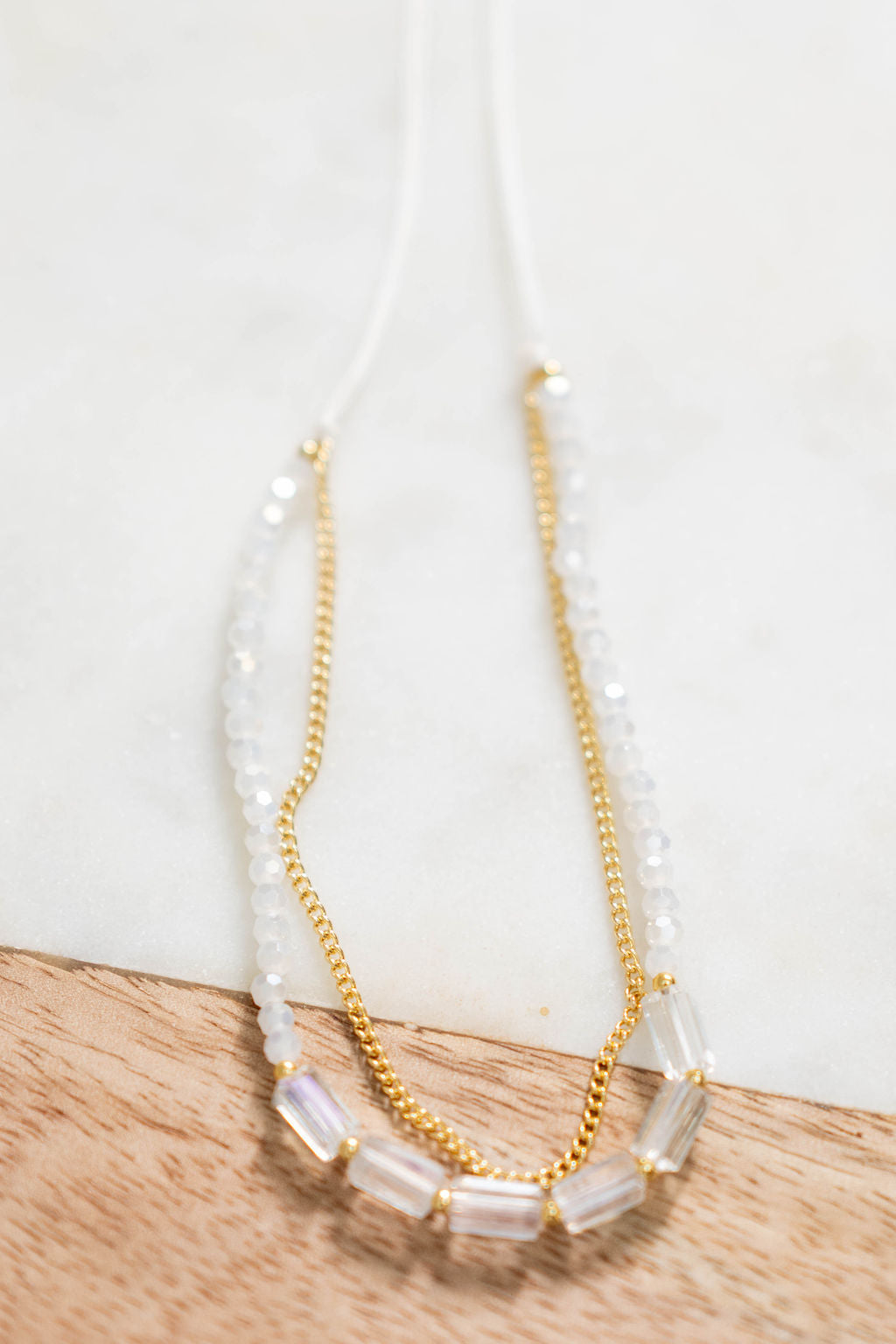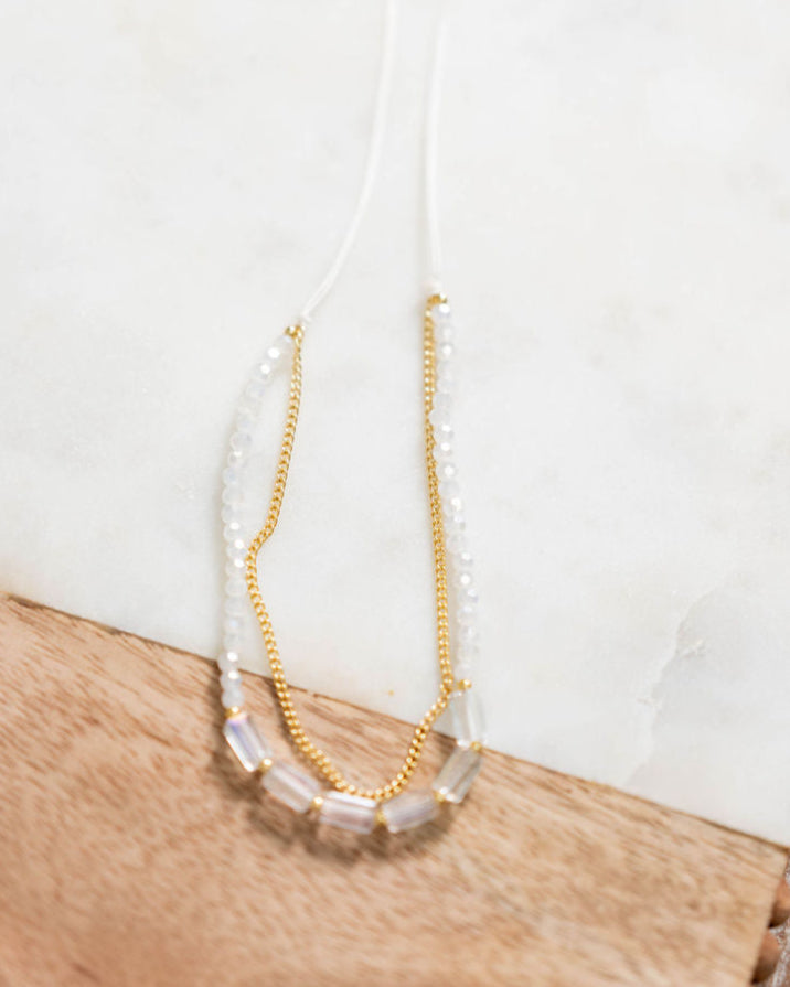 Delicate yet striking. This layered necklace pairs frosted white beads with luminous crystal accents and a sleek gold chain for a look that’s effortlessly ethereal. Whether you’re layering it with other pieces or letting it shine on its own, it’s the perfect touch for moonlit evenings and daytime glow alike.