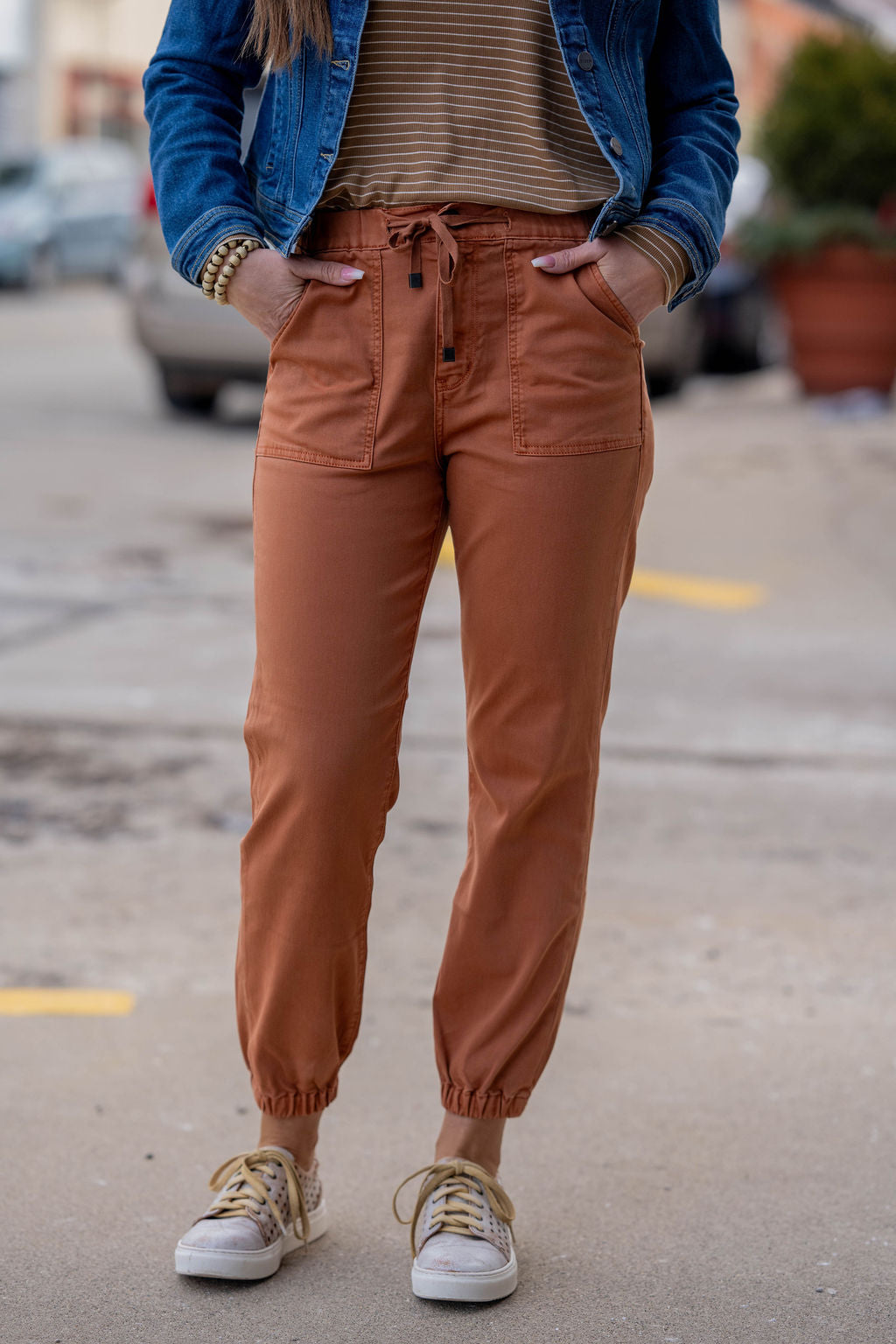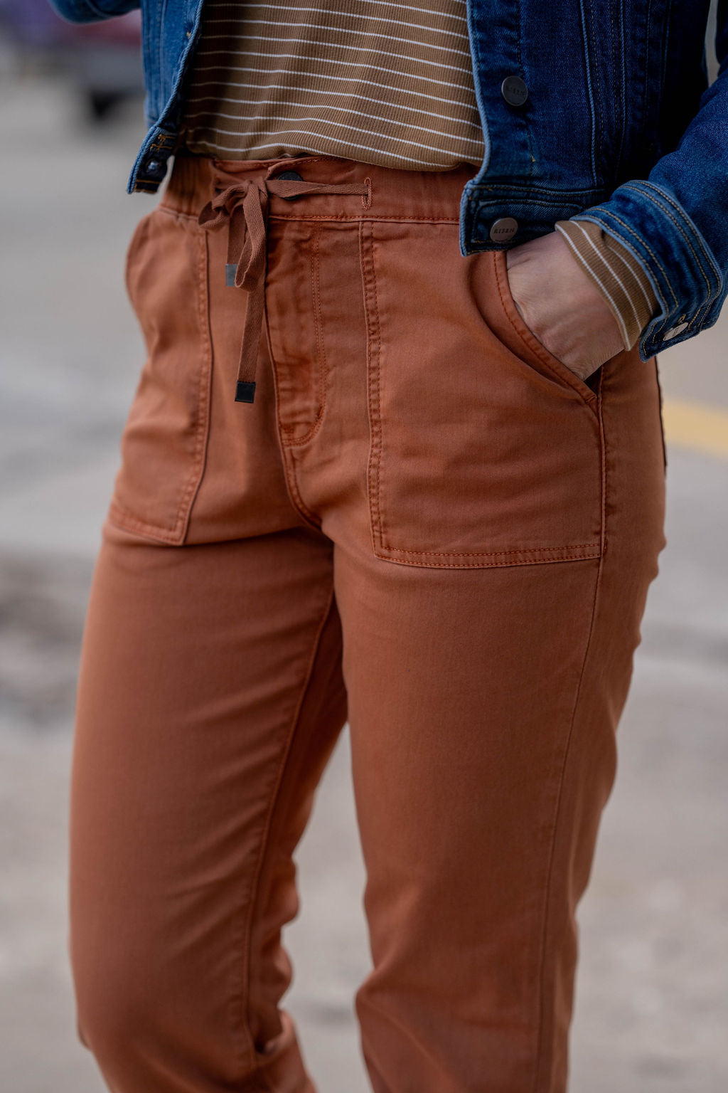 These jogger-style pants blend comfort with a modern, laid-back vibe. Designed with a relaxed fit, functional front patch pockets, and an adjustable drawstring waist, they’re perfect for everyday wear. The elastic cuff hem adds that flattering jogger shape, while the soft stretch fabric keeps them comfortable from morning to night.