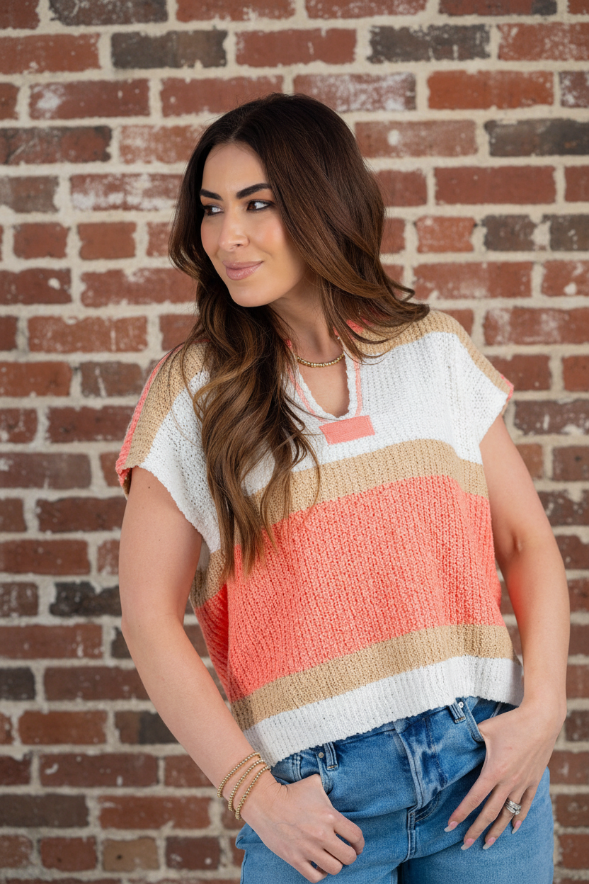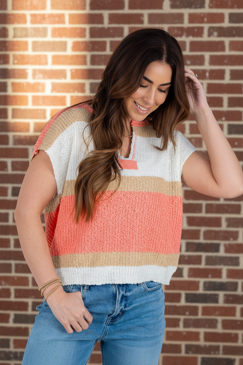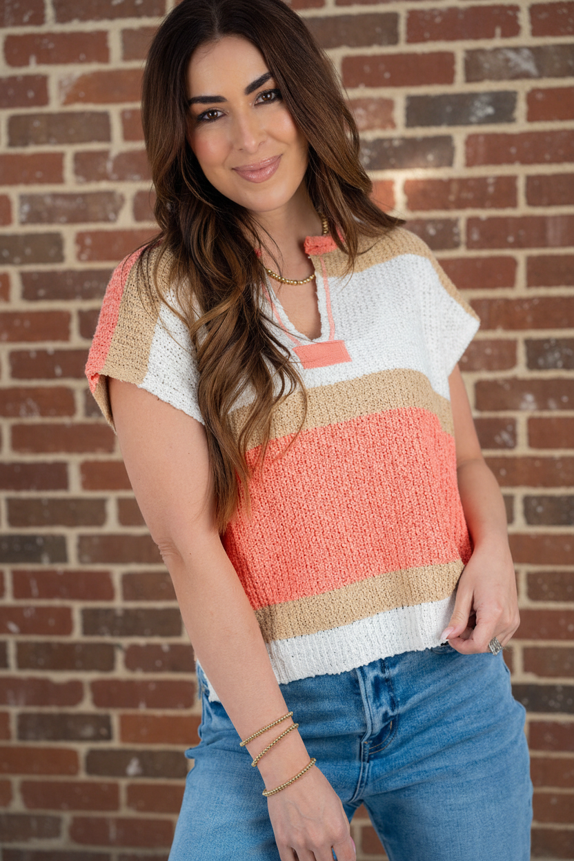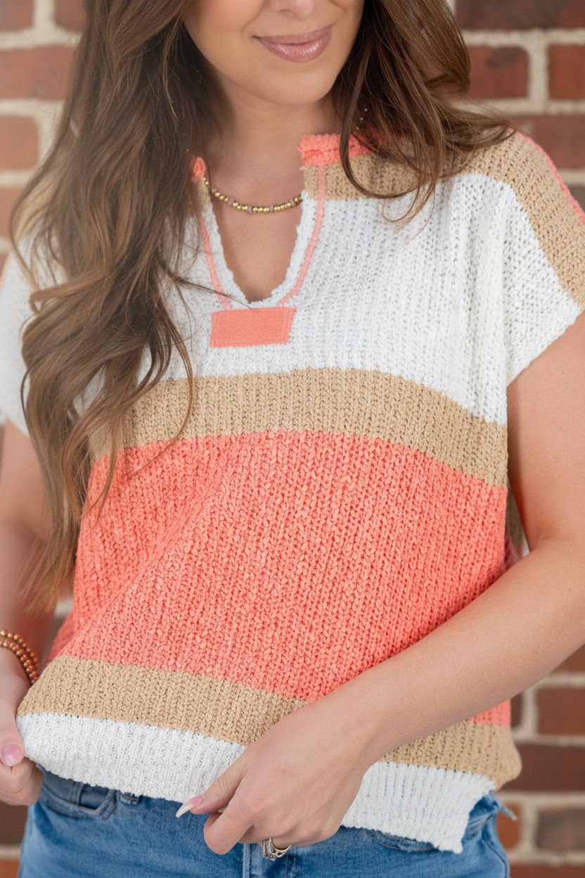 Bright, effortless, and full of personality—this textured knit top is your new warm-weather favorite. Designed with soft colorblock stripes and a relaxed, easy fit, it brings a fun pop of color without ever trying too hard.