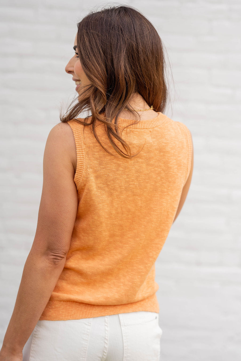 Simple, polished, and endlessly versatile—this sweater tank is the definition of effortless style. Designed with a soft, lightweight knit and a relaxed fit, it drapes beautifully while keeping you comfortable all day long. The clean silhouette and classic crew neckline make it perfect for layering or wearing on its own, whether you're pairing it with denim for a casual look or dressing it up with tailored pieces.