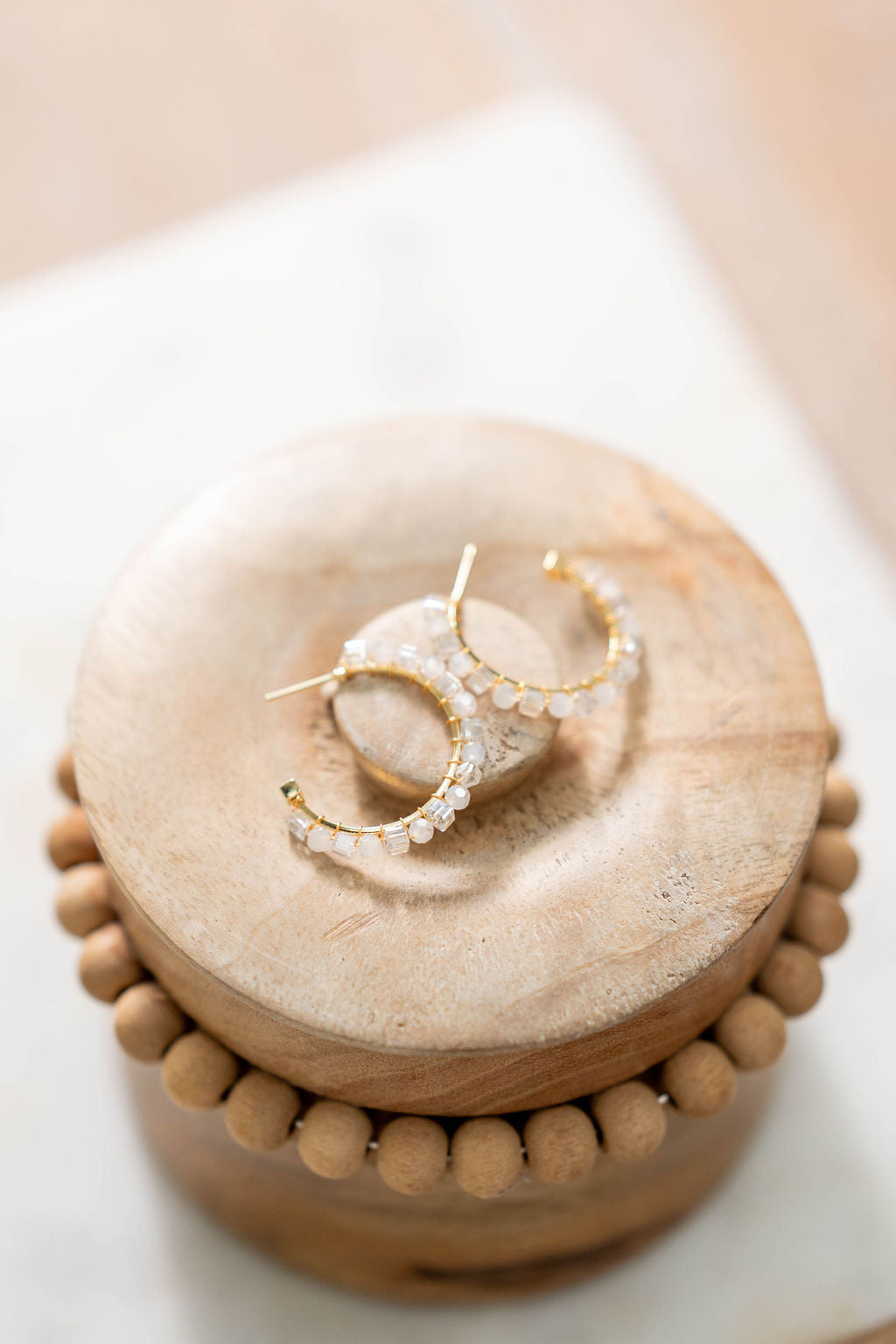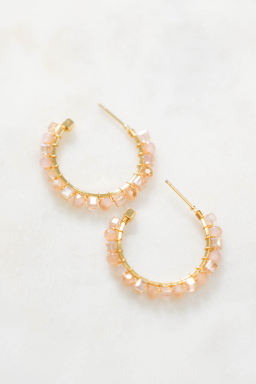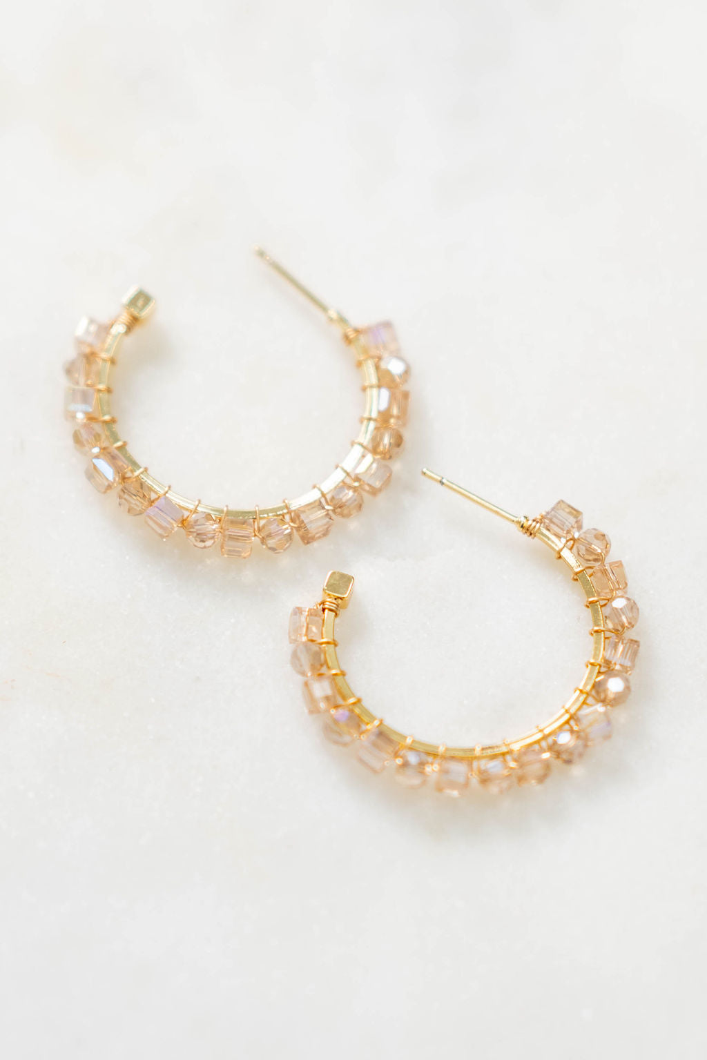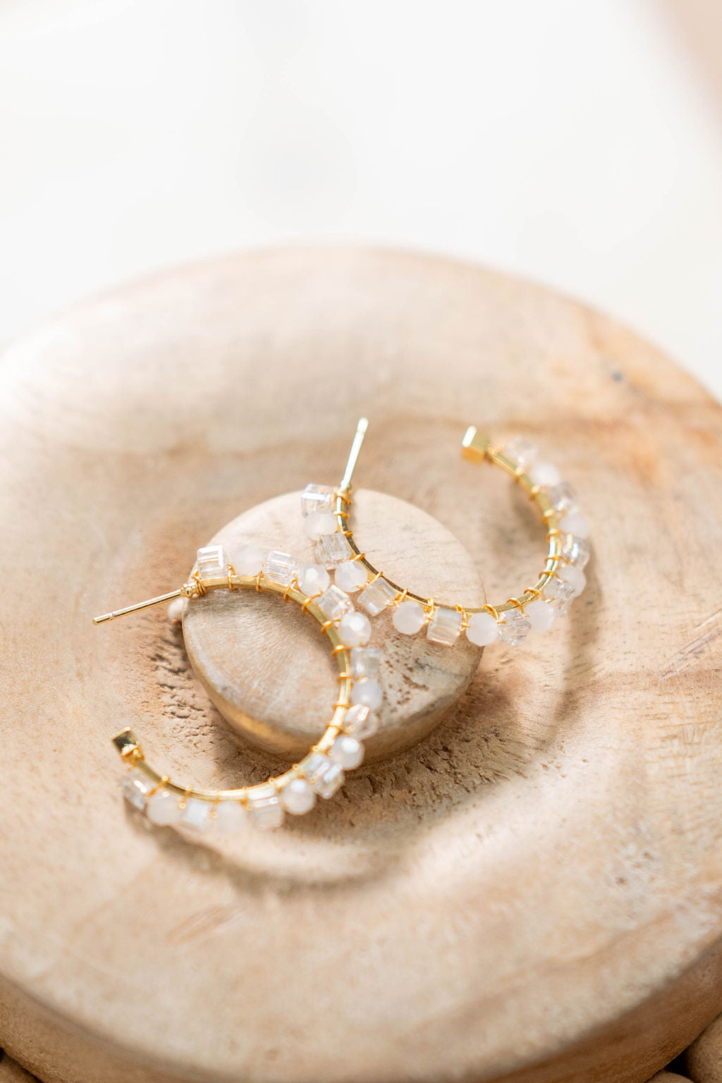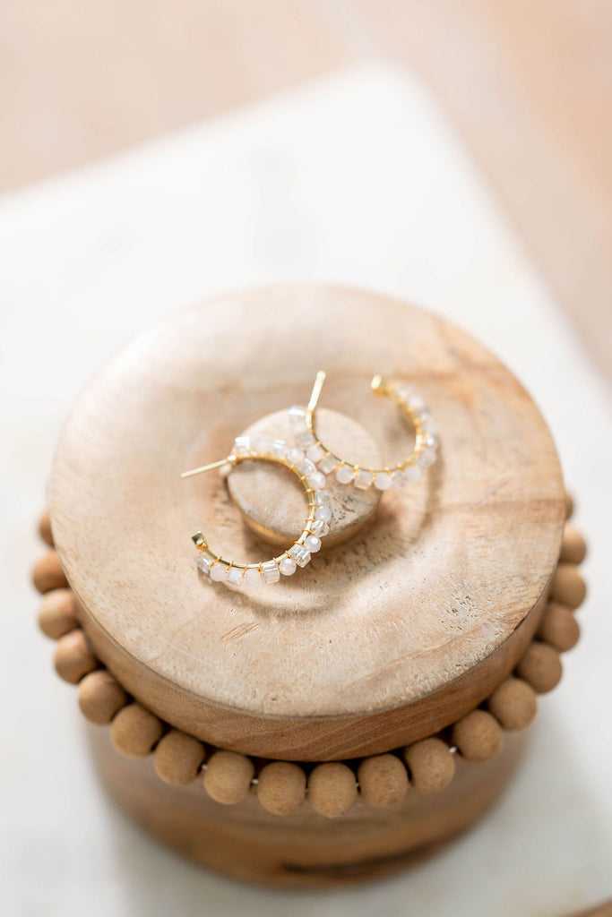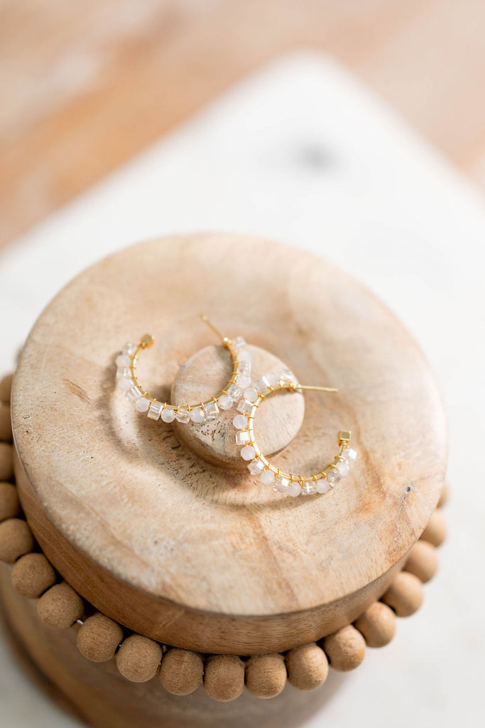 Fresh and luminous. These golden hoops are adorned with faceted crystal-clear beads and frosted white accents, giving them a radiant shimmer that catches the light effortlessly. Lightweight and versatile, they’re the kind of hoops that go from day to night with ease, adding a touch of glow to any look.