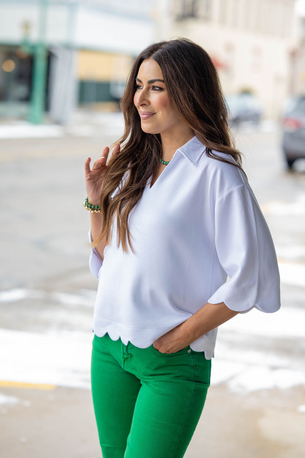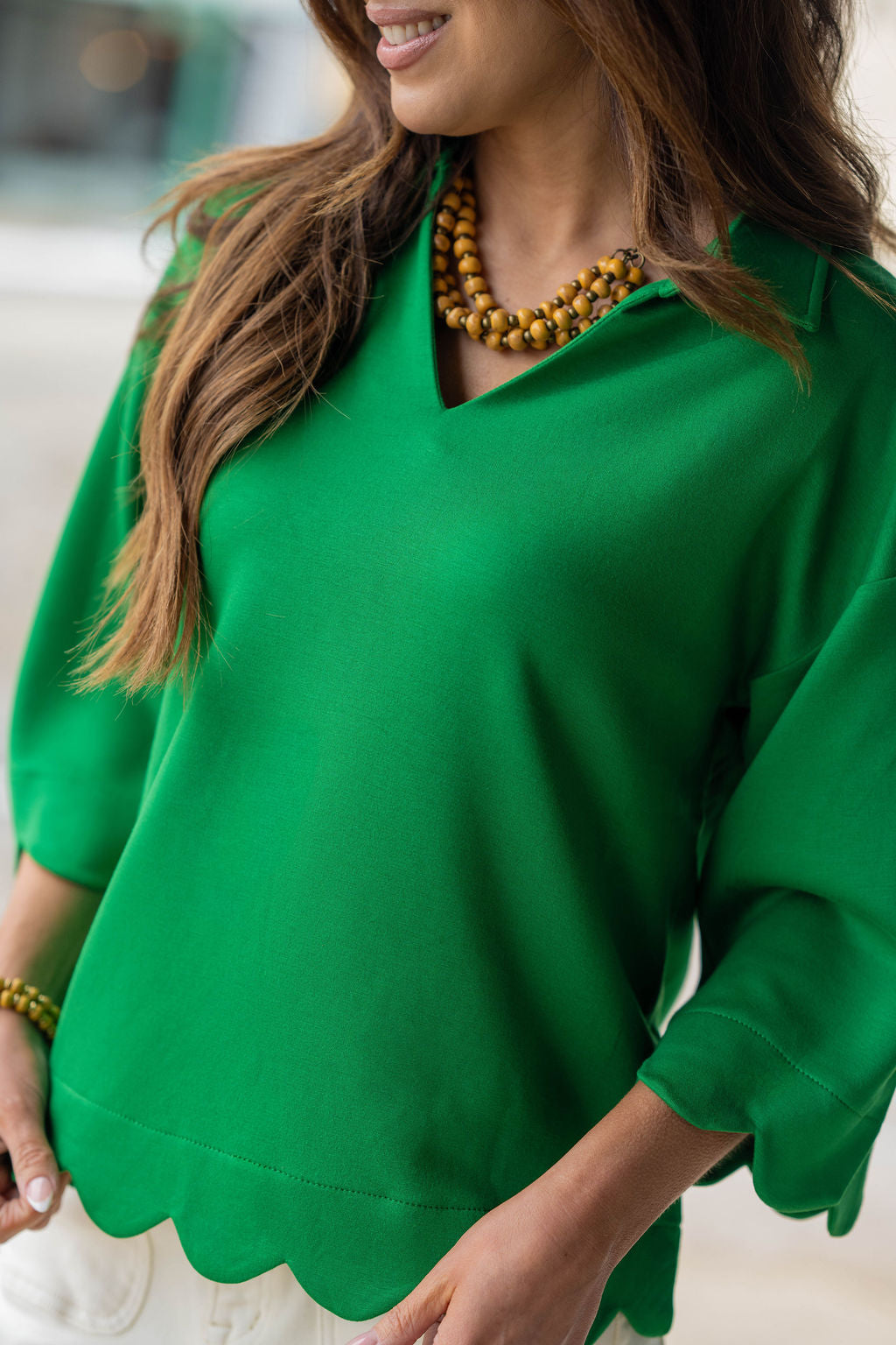 This top is all about feminine details and effortless charm. Designed with a soft, flowy fit and finished with a sweet scalloped hem, it’s the perfect way to elevate your everyday look. The V-neckline and relaxed sleeves create a flattering silhouette that pairs beautifully with denim, or skirts.