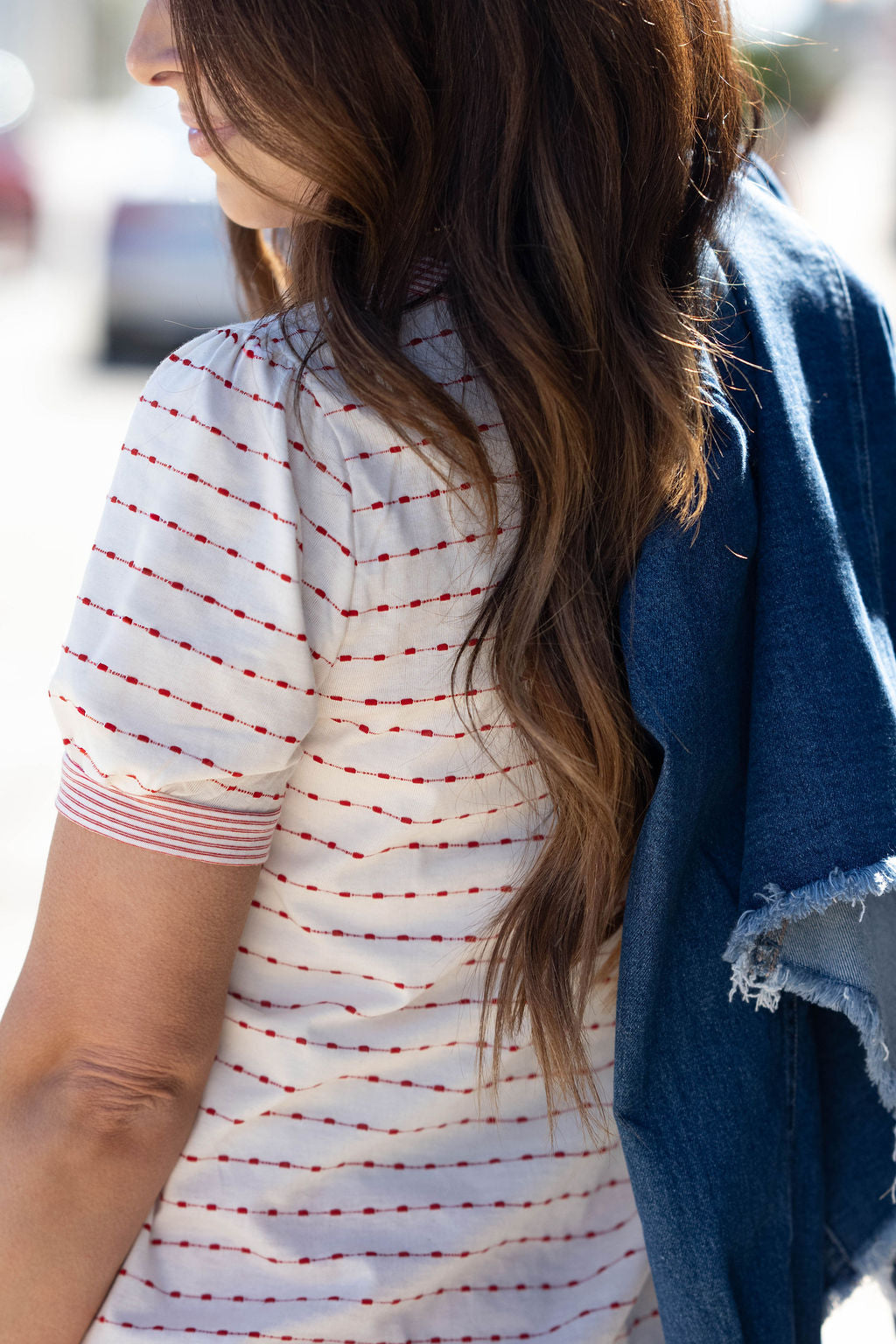 The mix of dashed lines on the body and the solid stripes on the sleeves and collar makes for a unique look! This lightweight and super soft tee can be dressed up or down with ease! Pair with shorts or a skirt in the warmer months or with denim, leggings, or joggers in the cooler ones!