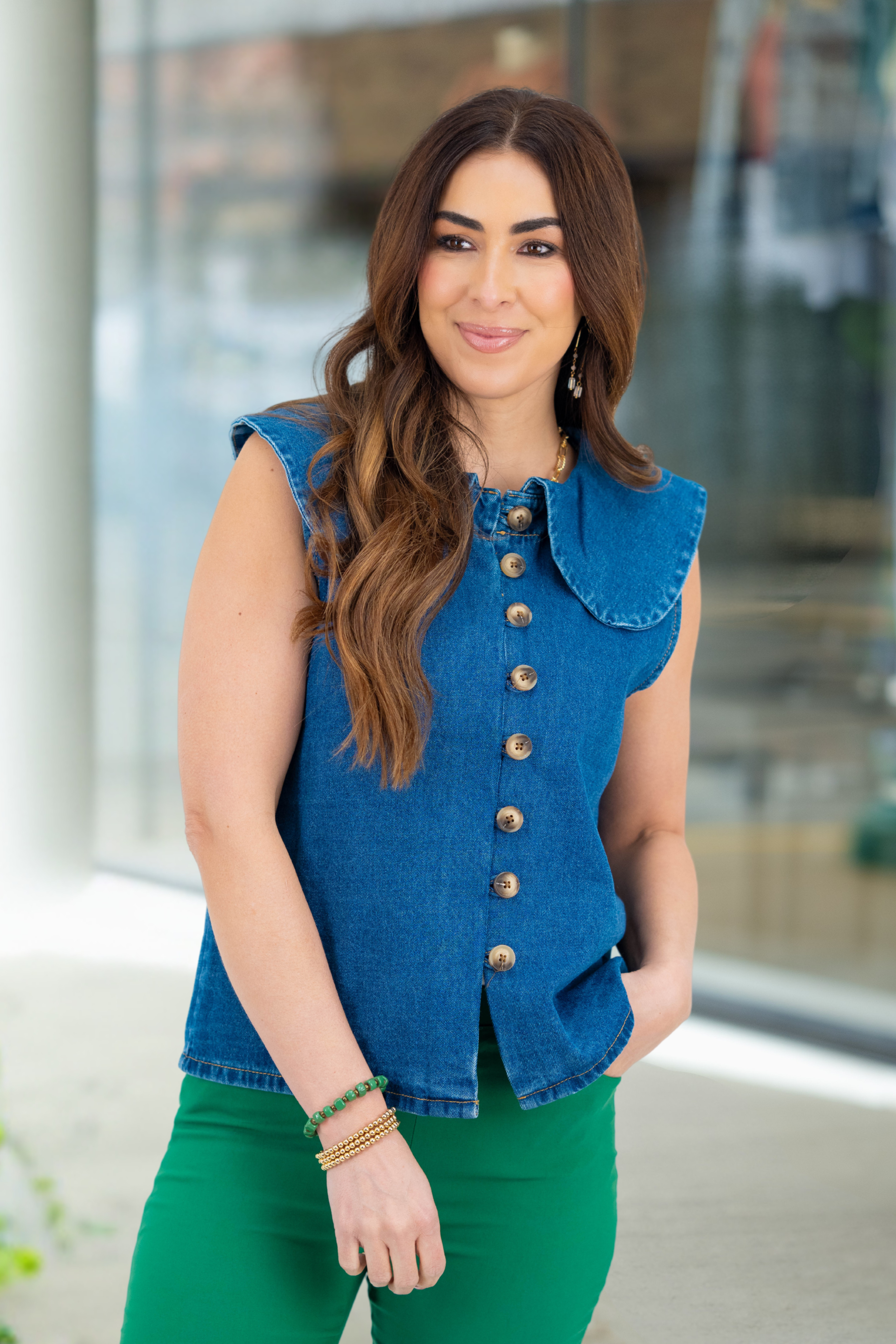A fresh, feminine twist on classic denim—this sleeveless top is a standout piece. The statement collar adds the cutest touch, while the full button-front design keeps it polished and easy to style.