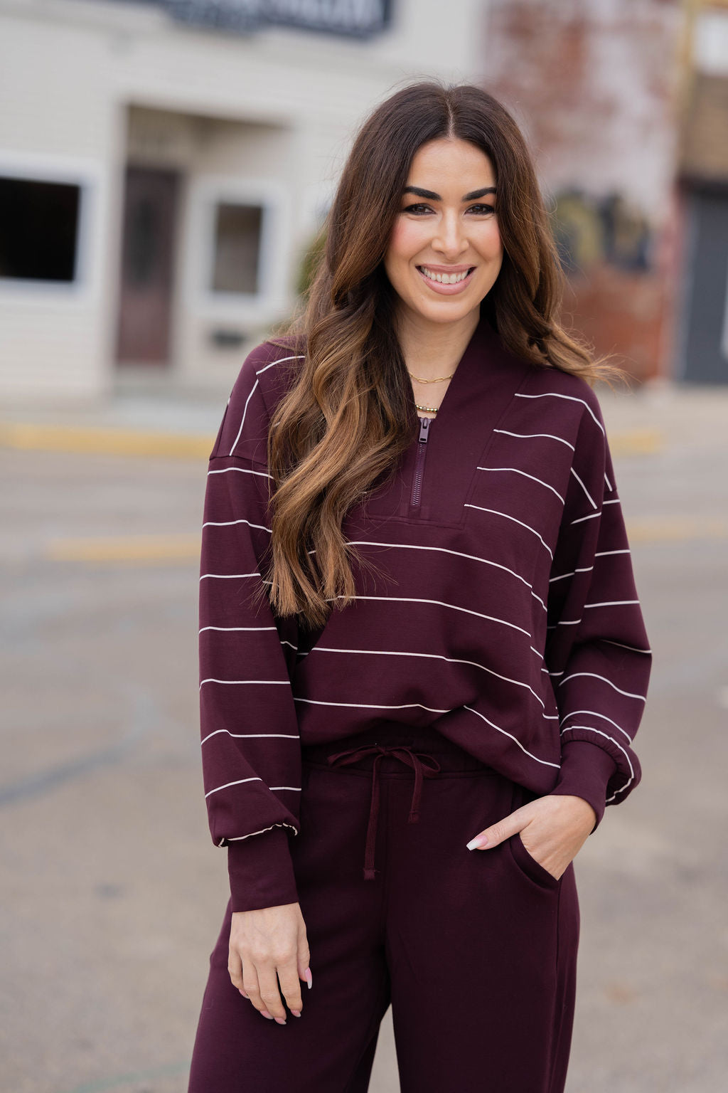 Your go-to pullover for casual days when you still want to feel put together. This quarter-zip top blends relaxed comfort with subtle stripe detailing for an effortlessly polished look.