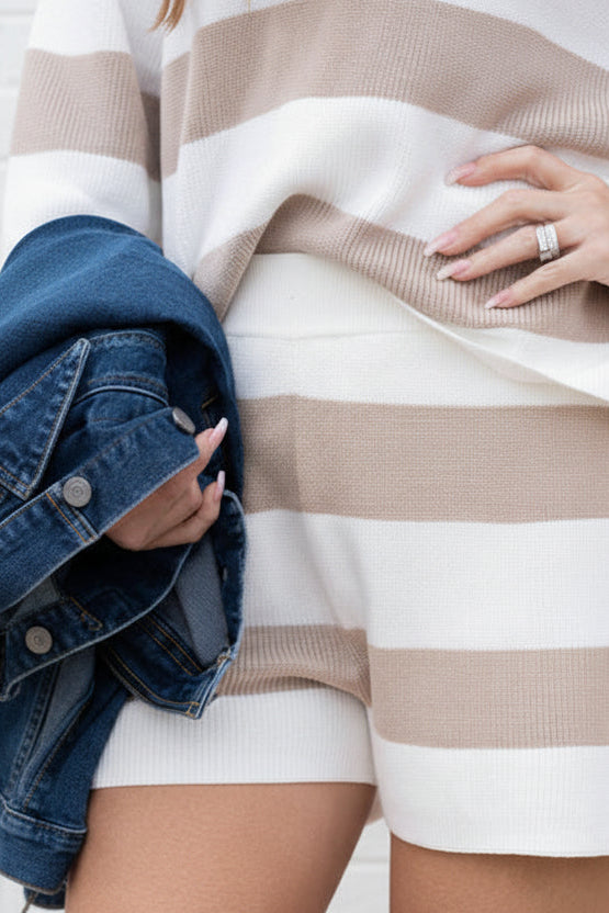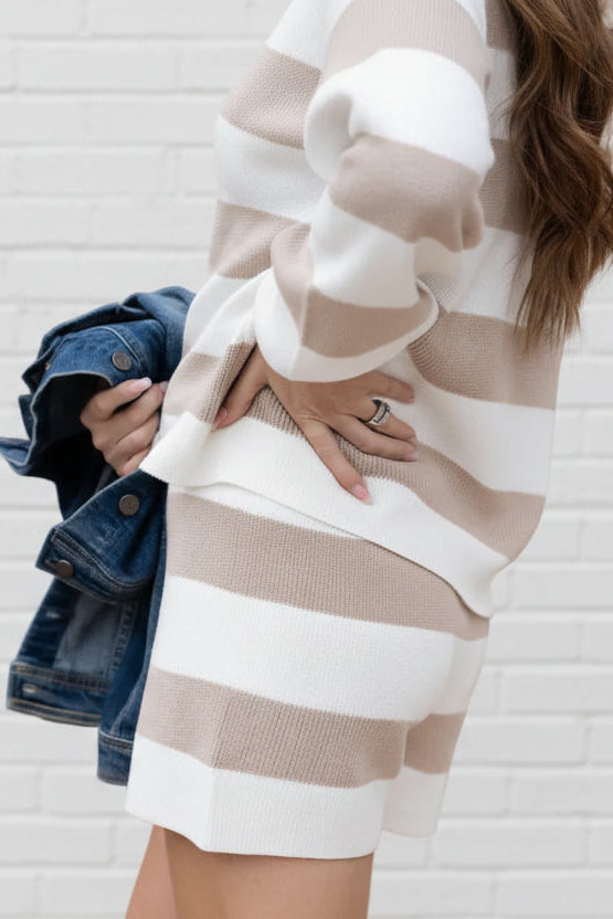 Easy, elevated, and endlessly wearable. This matching set features a relaxed striped sweater paired with comfortable pull-on shorts for a look that’s equal parts cozy and put-together.