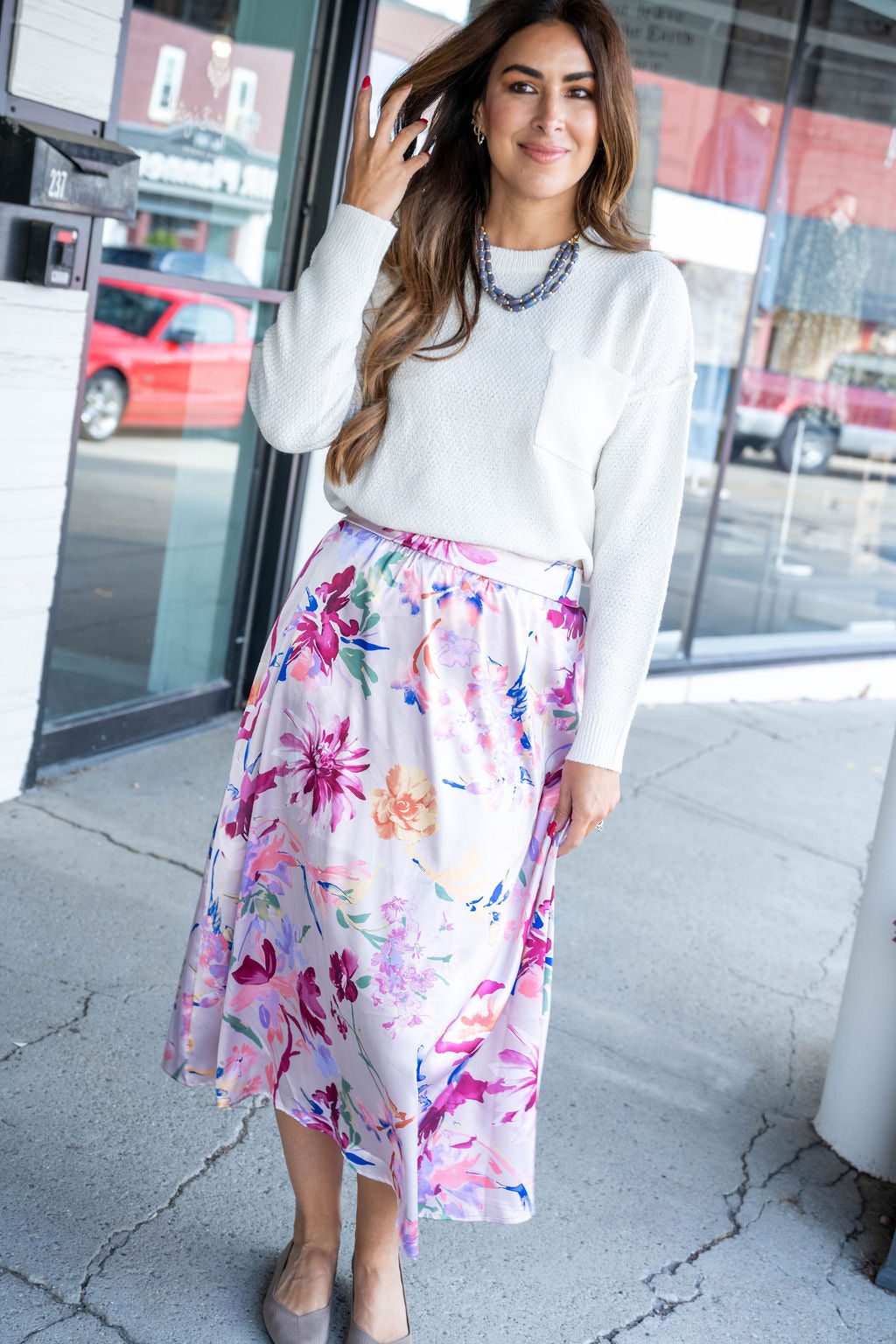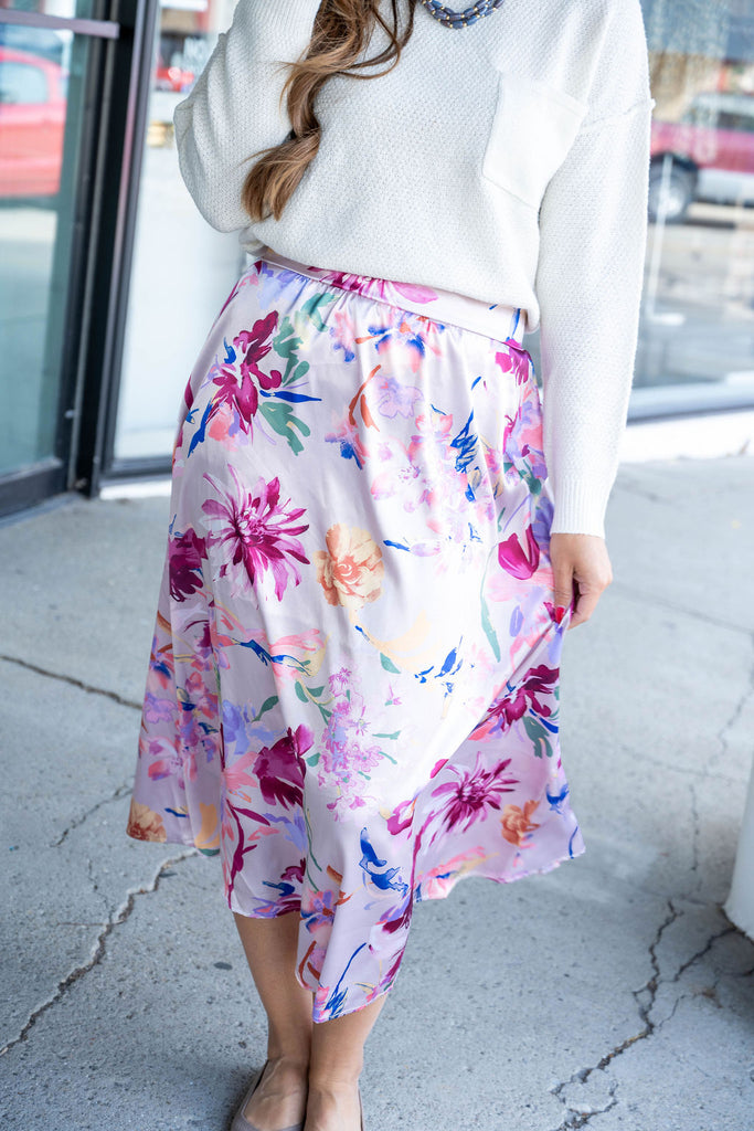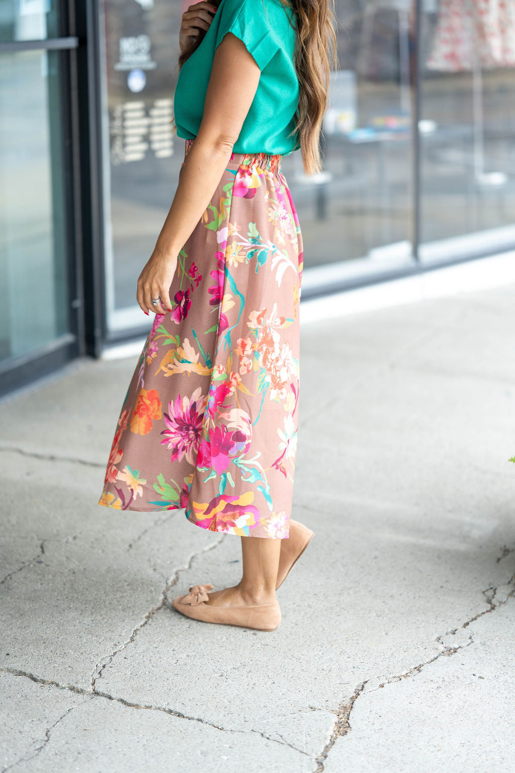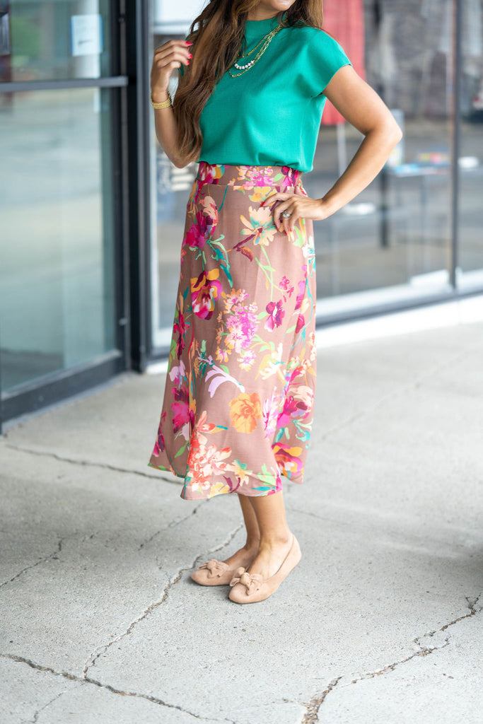 We cannot get over how stylish this skirt is! The colors and floral print paired together make such a cute, elegant look! Wear this skirt to any event and you are sure to receive compliments! Pair with a blouse for a more elevated look or even a basic or graphic tee for a trendy on-the-go look! Chilly? Pair with a sweater, cardigans, or jacket and booties!