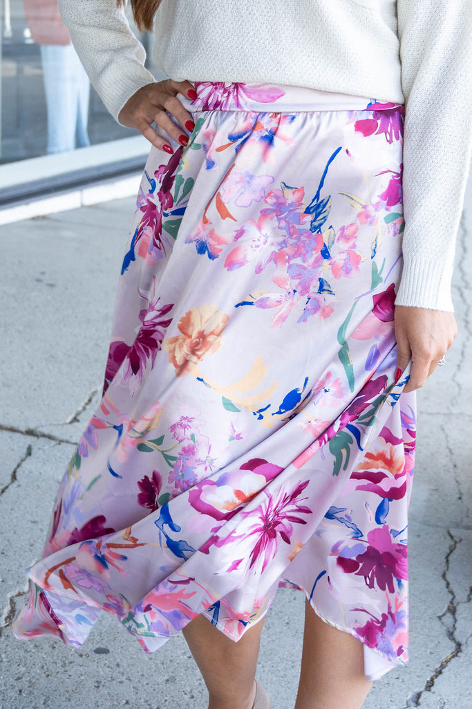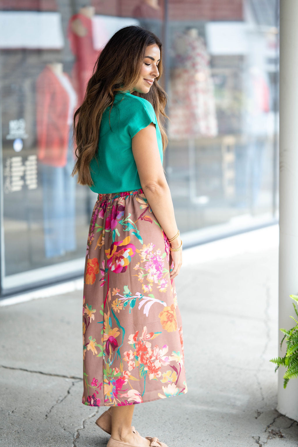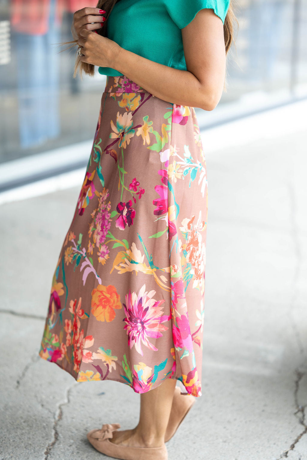 We cannot get over how stylish this skirt is! The colors and floral print paired together make such a cute, elegant look! Wear this skirt to any event and you are sure to receive compliments! Pair with a blouse for a more elevated look or even a basic or graphic tee for a trendy on-the-go look! Chilly? Pair with a sweater, cardigans, or jacket and booties!