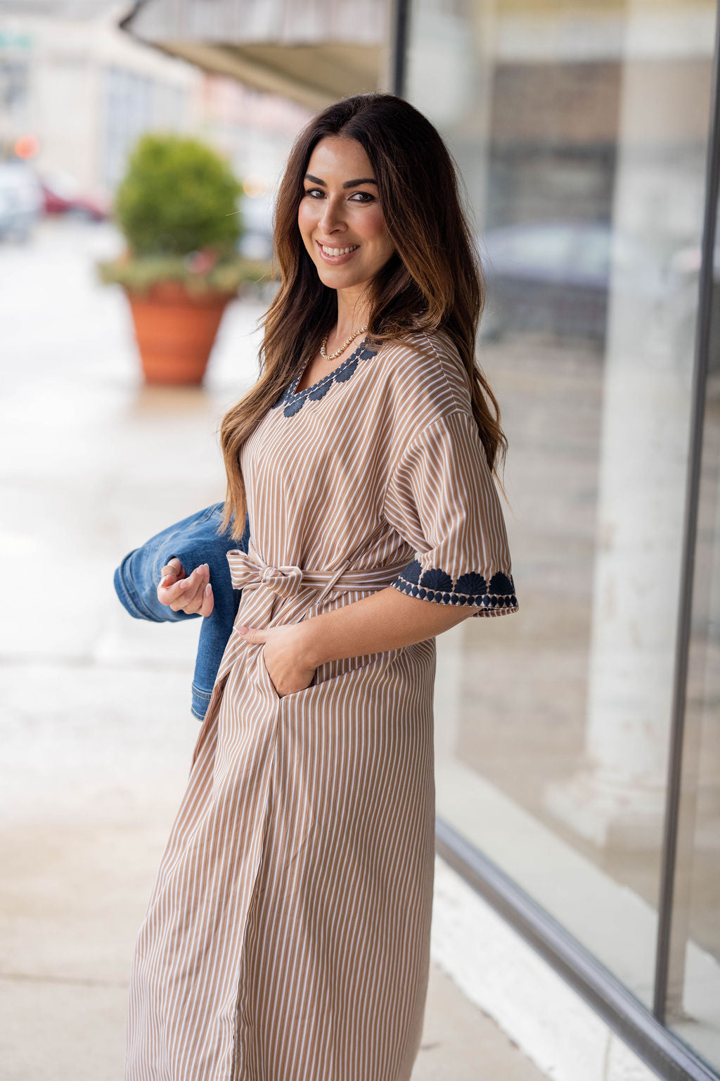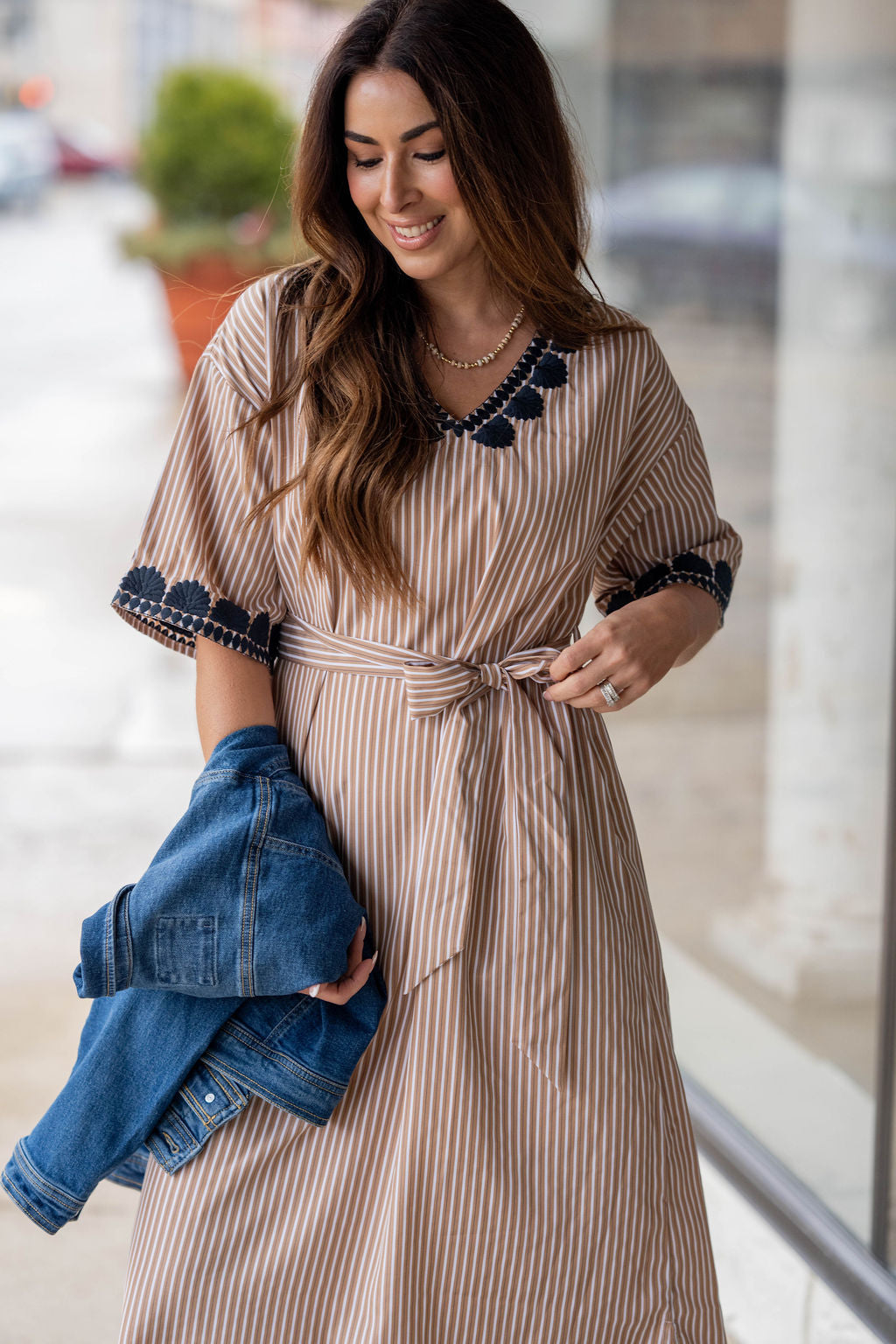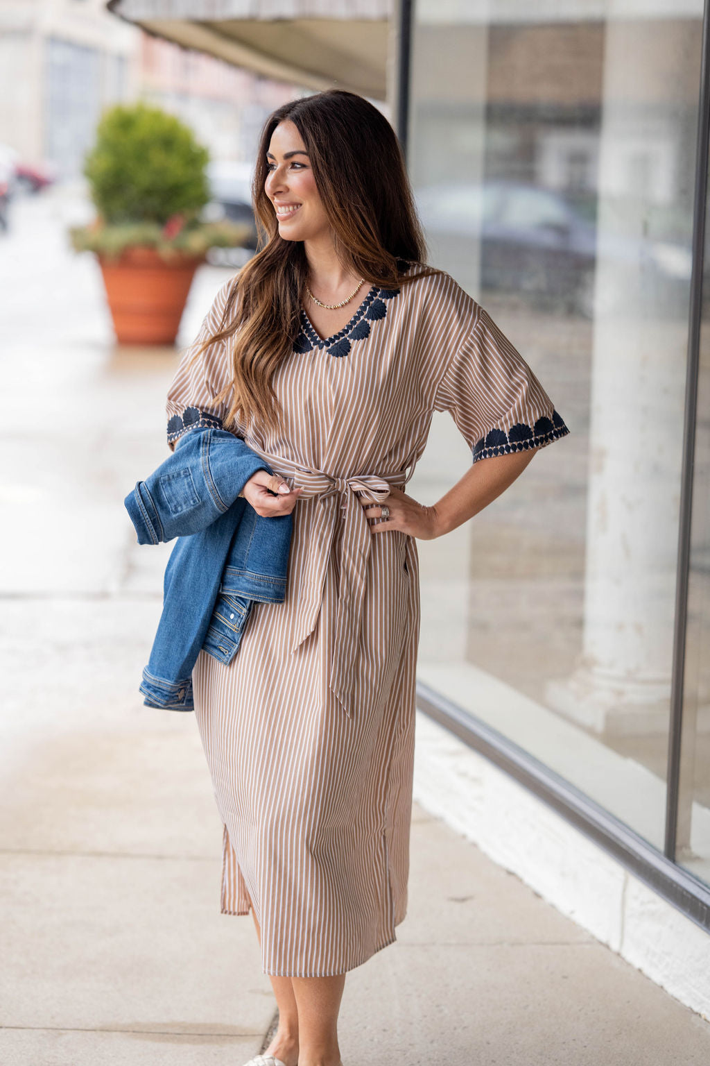 Effortless, polished, and perfectly detailed—this embroidered-trim midi dress is made for spring days and summer outings. The striped fabric keeps the look timeless, while the scalloped embroidery adds a bold, feminine touch.