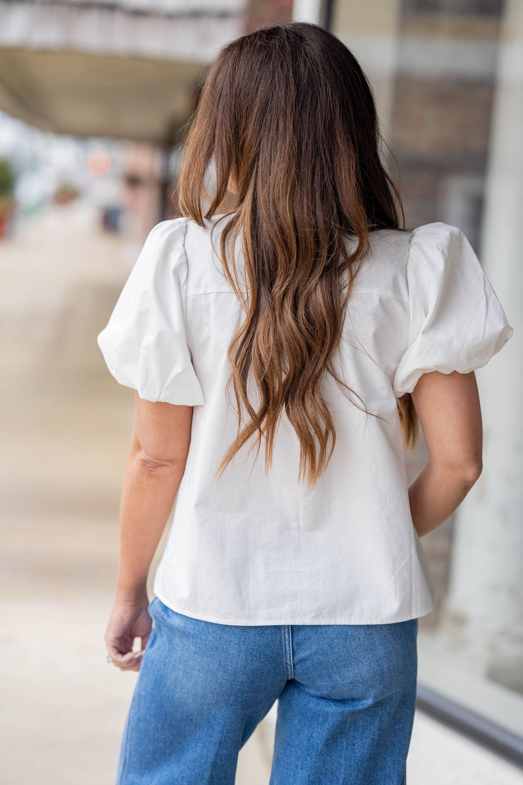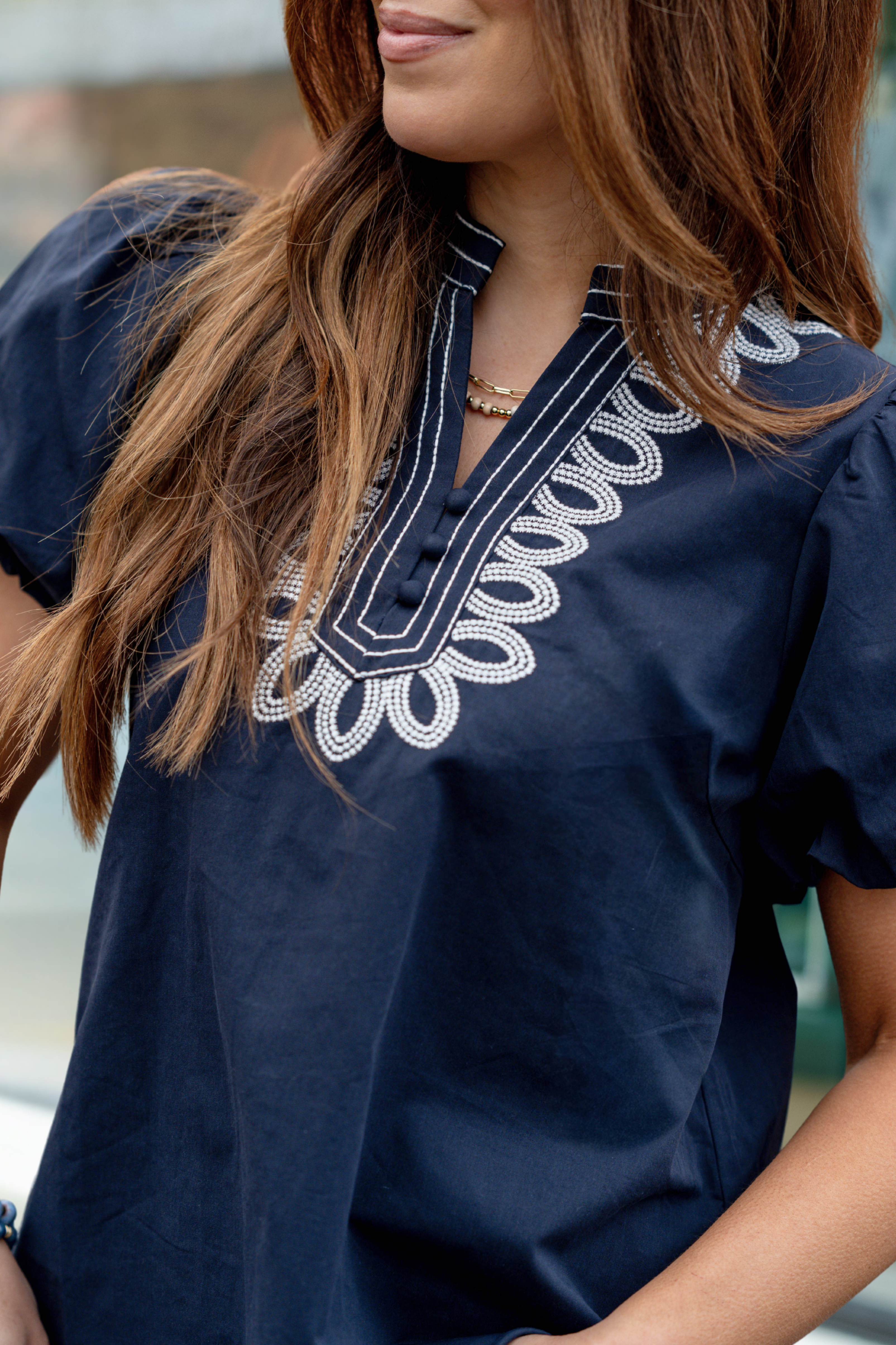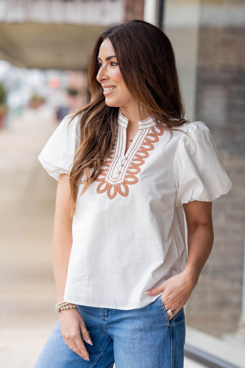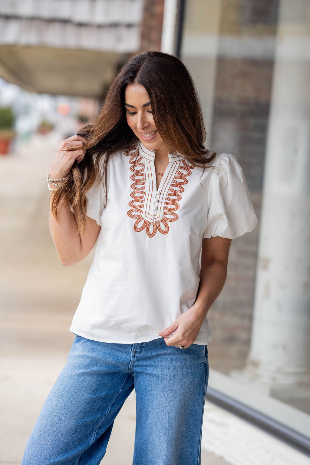 Chic, polished, and full of beautiful detail—this embroidered top is an instant outfit-maker. The puff sleeves add soft volume, while the ornate neckline embroidery creates a stunning focal point.