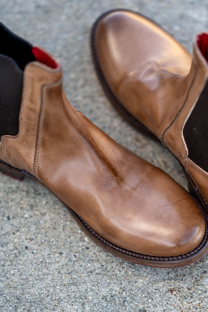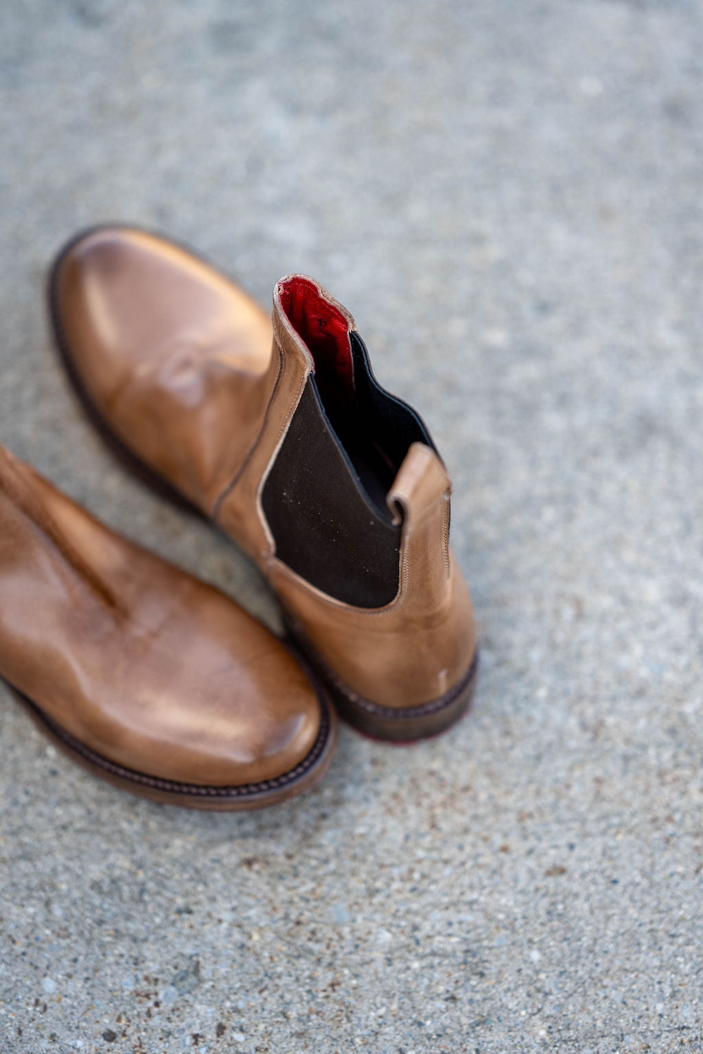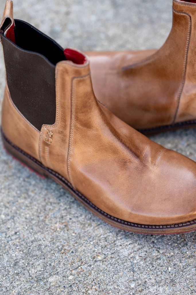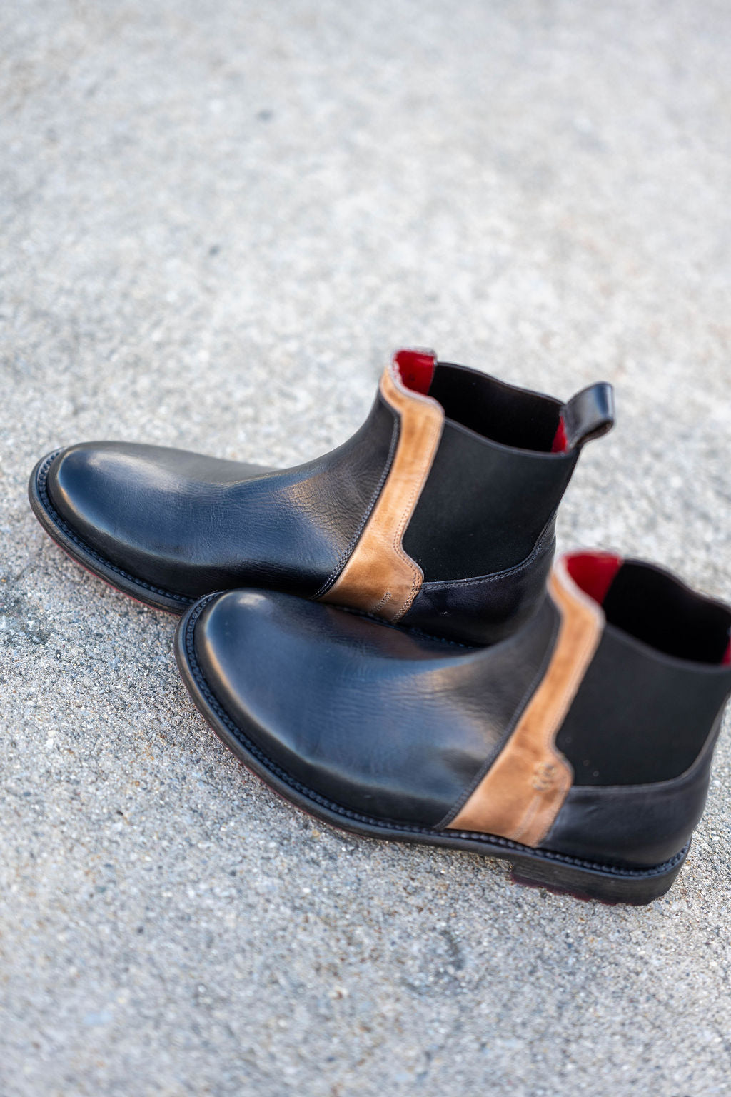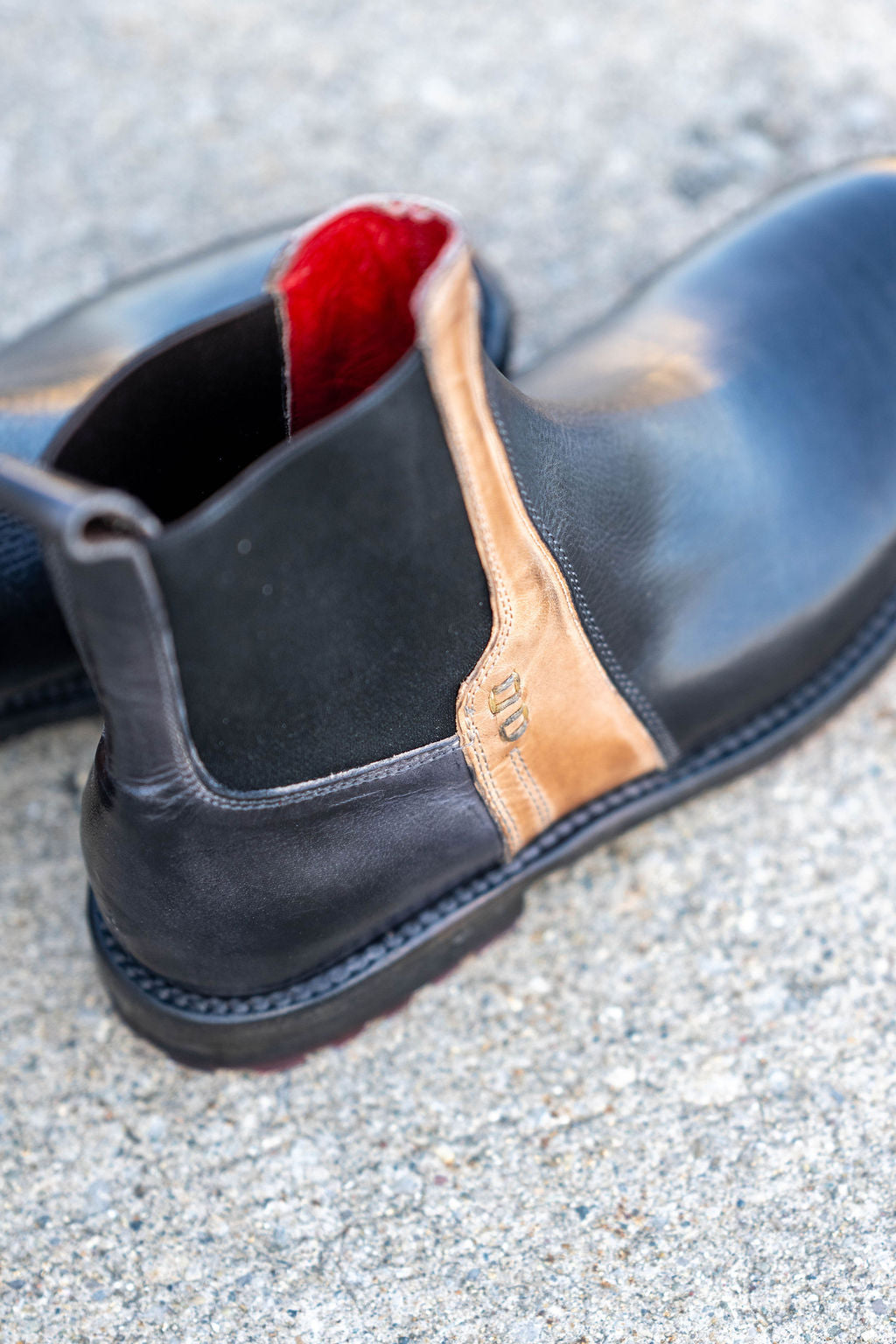 Ethic is for everyday versatility, this two-toned Chelsea boot features dual stretch side panels made from breathable mesh for flexibility and comfort. A vegetable-tanned leather lining ensures a natural, soft feel inside, while the back pull tab makes for easy on-and-off. Finished with a stacked leather heel and red Vibram sole for durable traction, it's a modern take on a timeless silhouette.