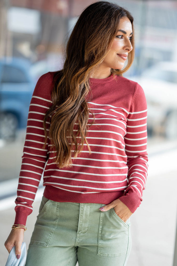 Effortless layering starts here—this look blends a timeless striped sweater with soft sage utility pants and a light wash denim jacket. Casual yet polished, it’s the kind of outfit you’ll reach for all season long.