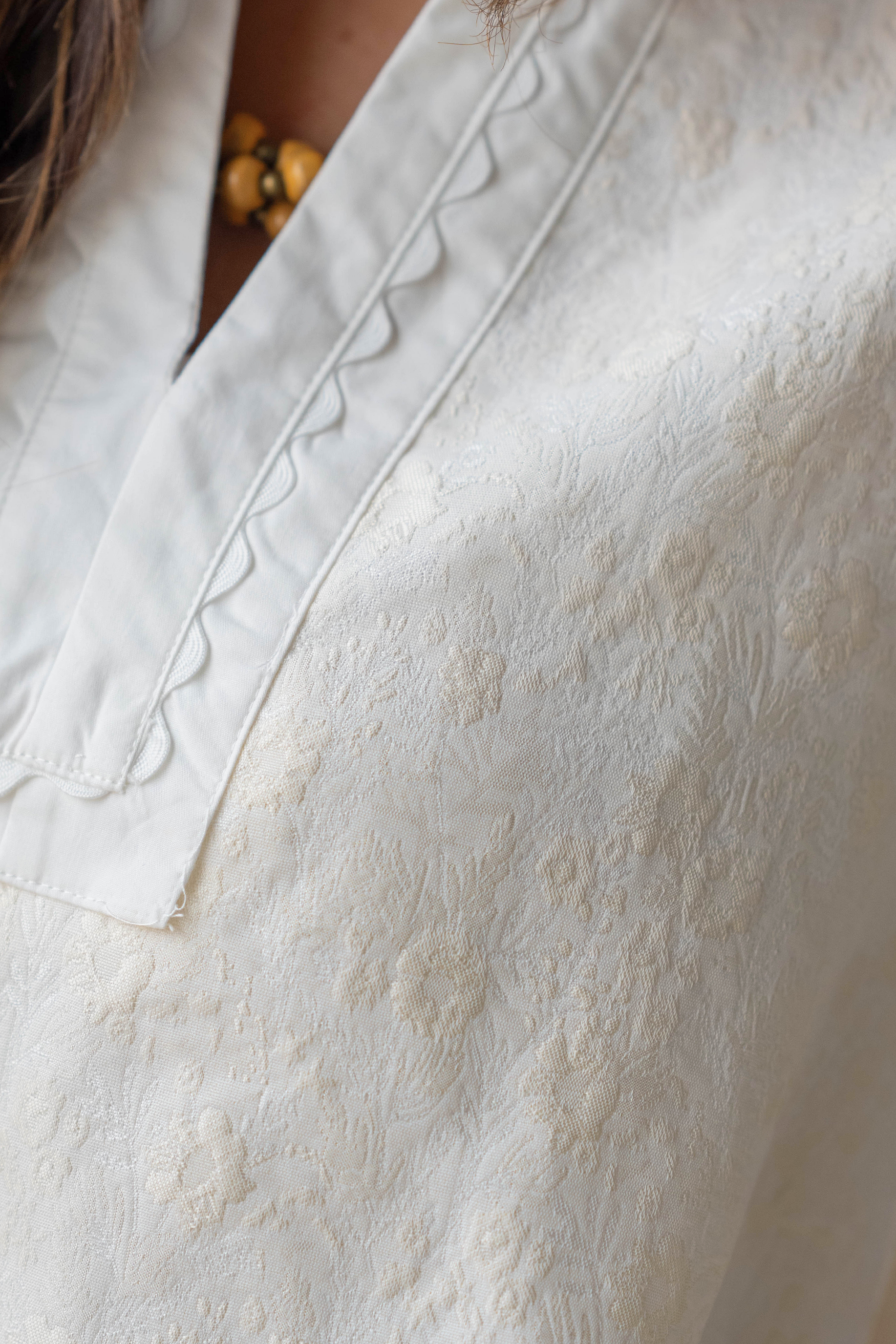 - Textured jacquard fabric with subtle floral detailing