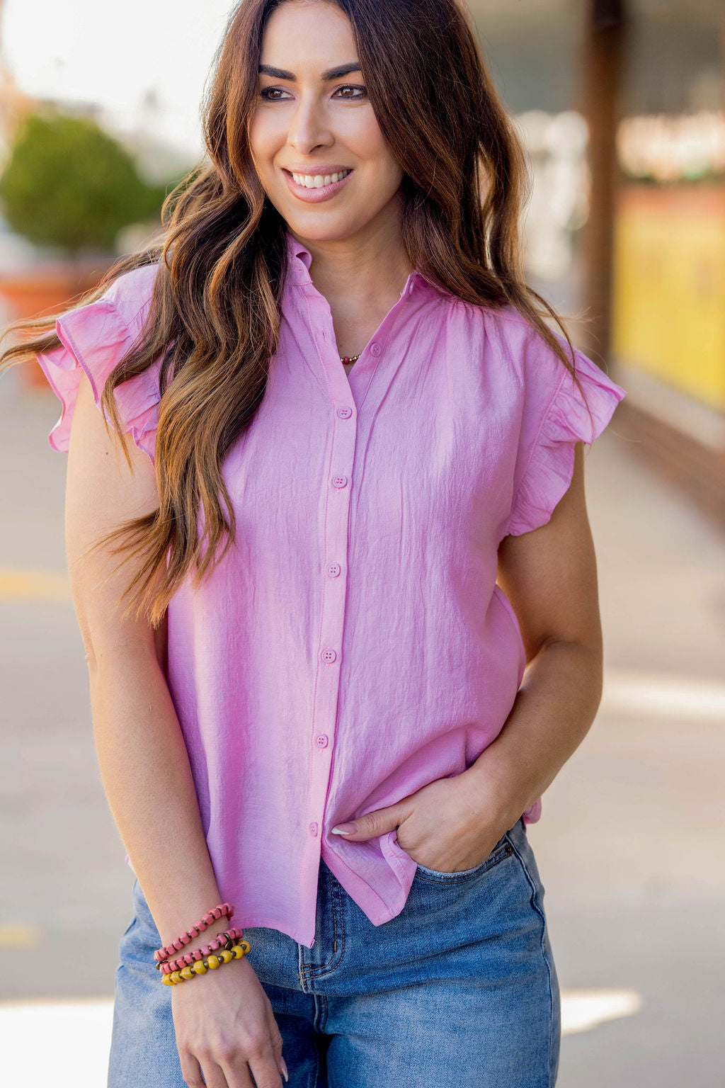 This blouse is perfect to transition you through any season! Wear alone with shorts or a skirt in the warmer months or with a cardigan, shacket, or blazer in the cooler ones! The flutter trim of this button up blouse sets it apart from the rest!