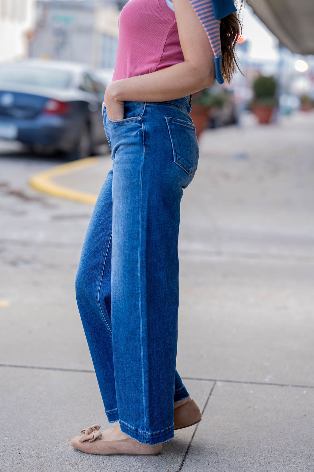 These wide-leg jeans are the perfect mix of comfort and effortless style. Designed with a flattering high rise and a relaxed fit through the leg, they create an easy, laid-back silhouette that still feels polished.