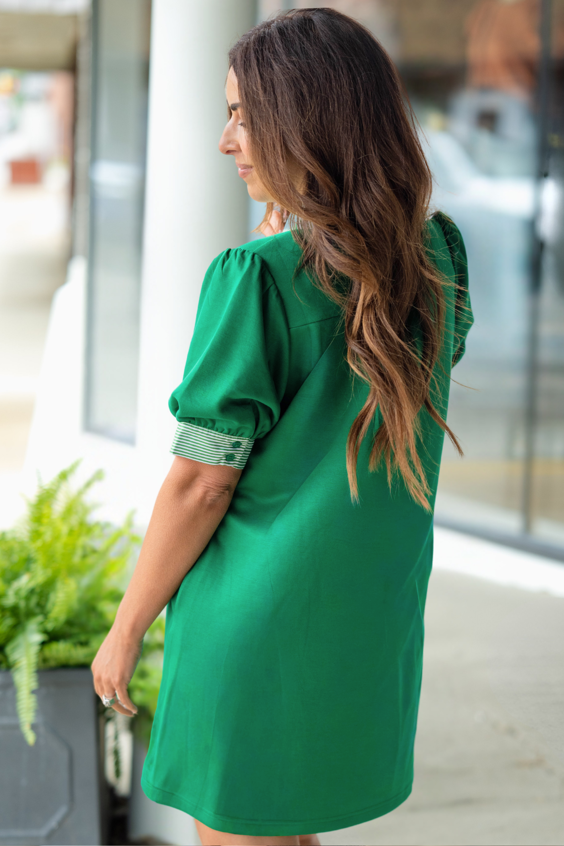 A fresh, feel-good dress designed for days when you want style without the effort. This easy shift silhouette pairs perfectly with a contrasting striped neckline and cuff detail—adding just the right amount of personality while keeping it polished.