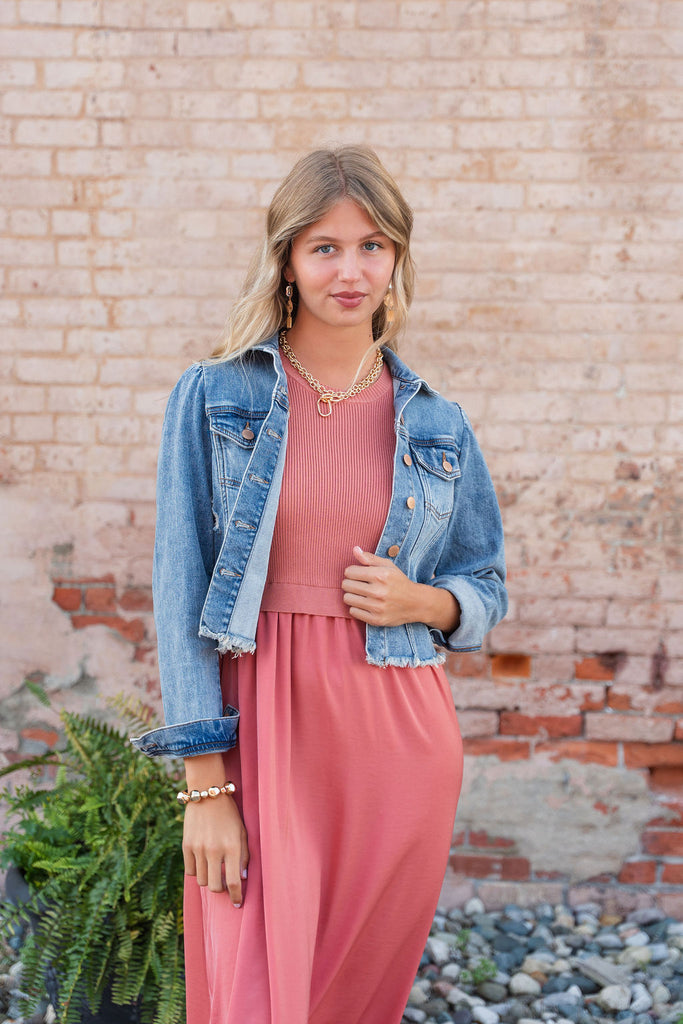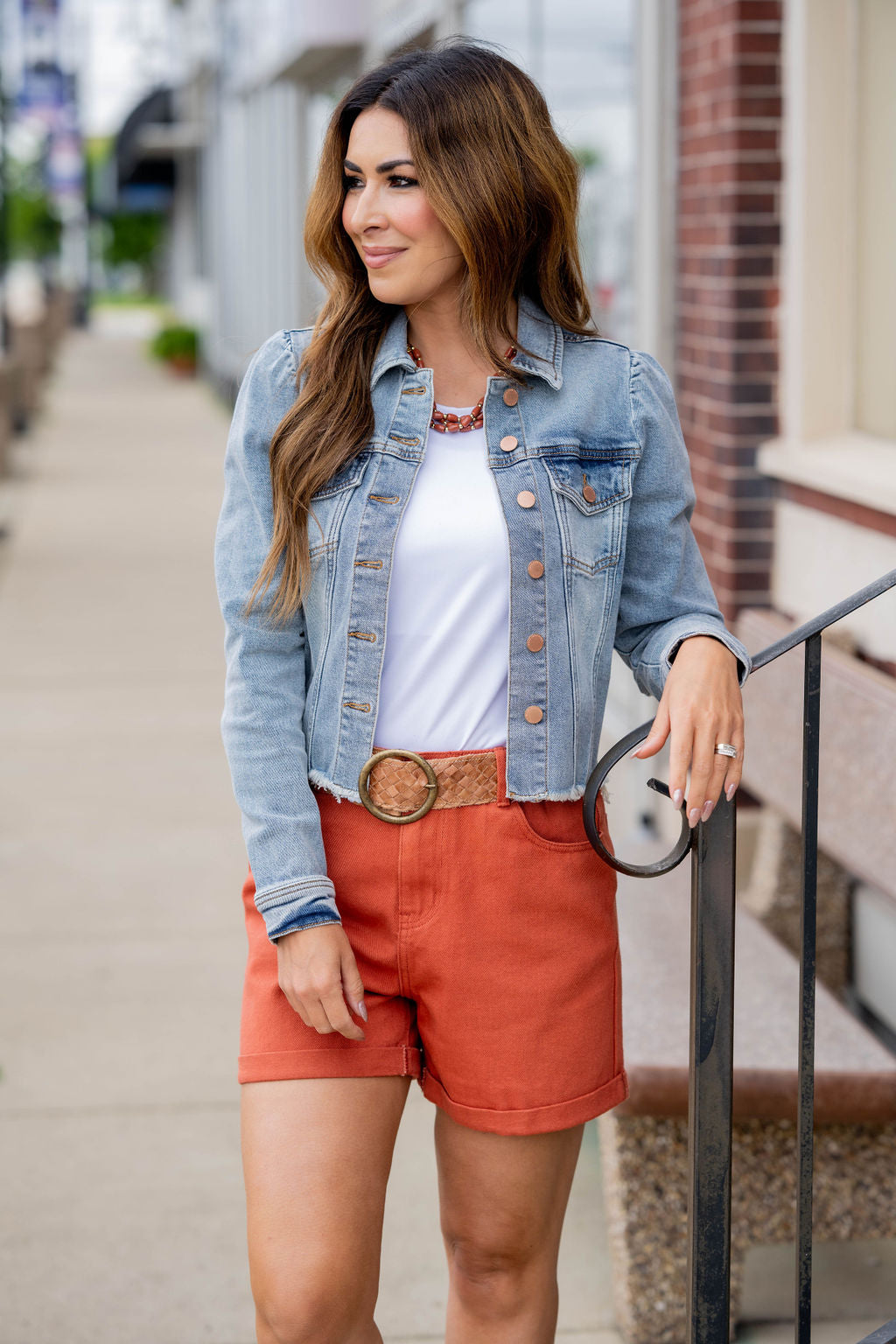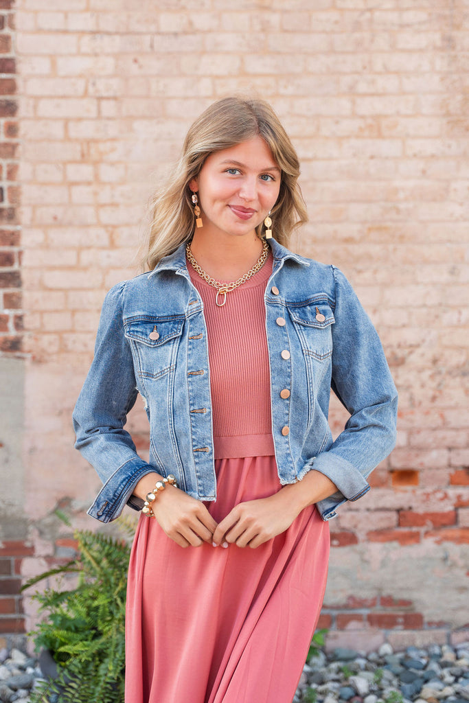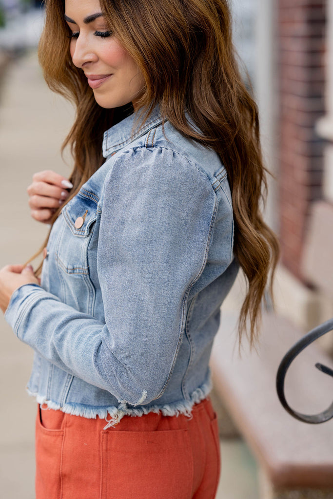 Denim jackets have always been a staple piece in your wardrobe but this one is a must have! The gathered shoulder gives this a feminine and flirty vibe but the frayed bottom and distressed look gives it that little bit of "edge"! With the perfect amount of stretch, this also makes this piece ideal for everyday wear. Pair with anything from a sundress, to a blouse, to a graphic tee and leggings combo! The possibilities are endless with this one!