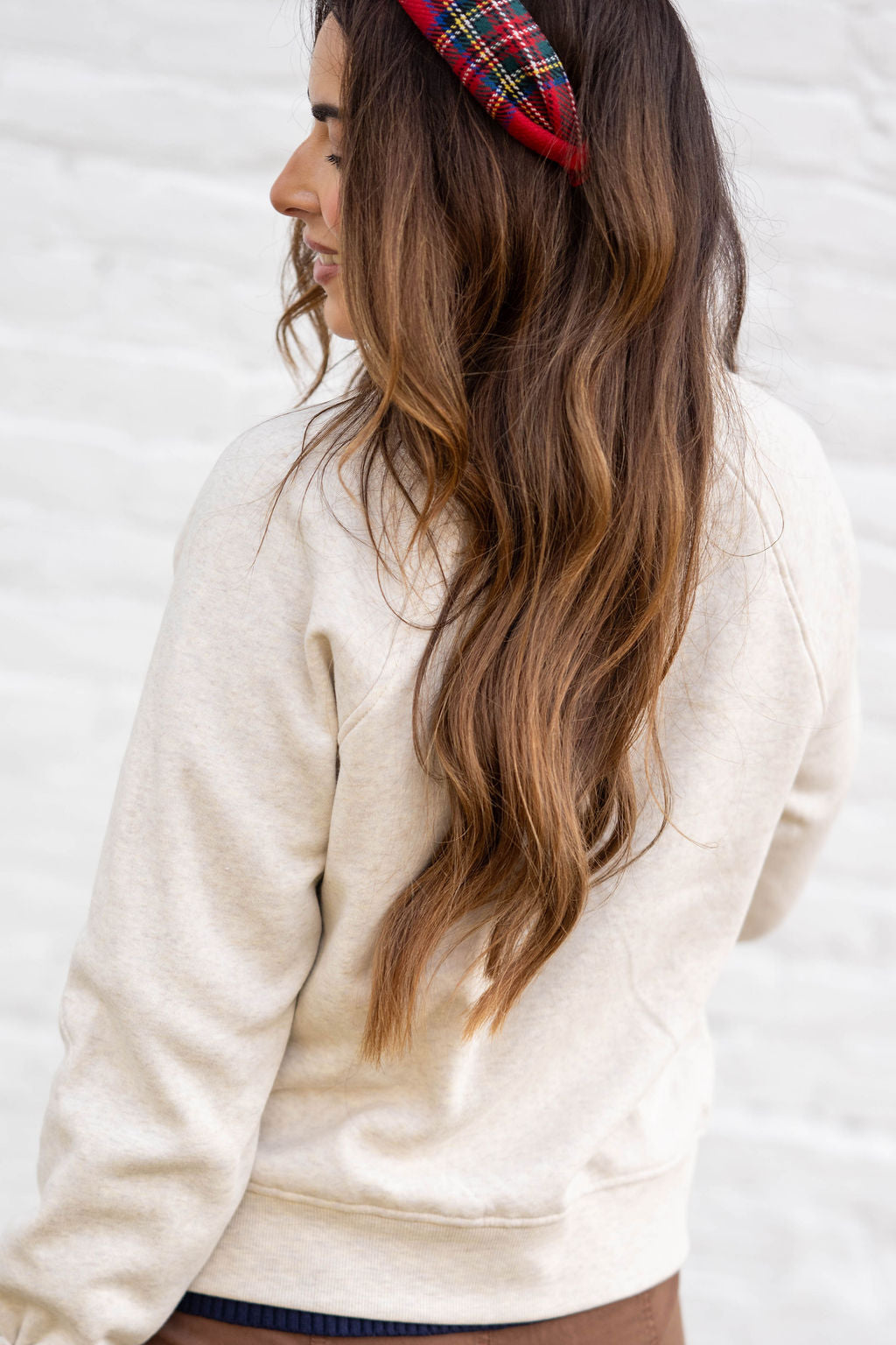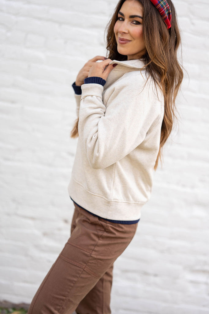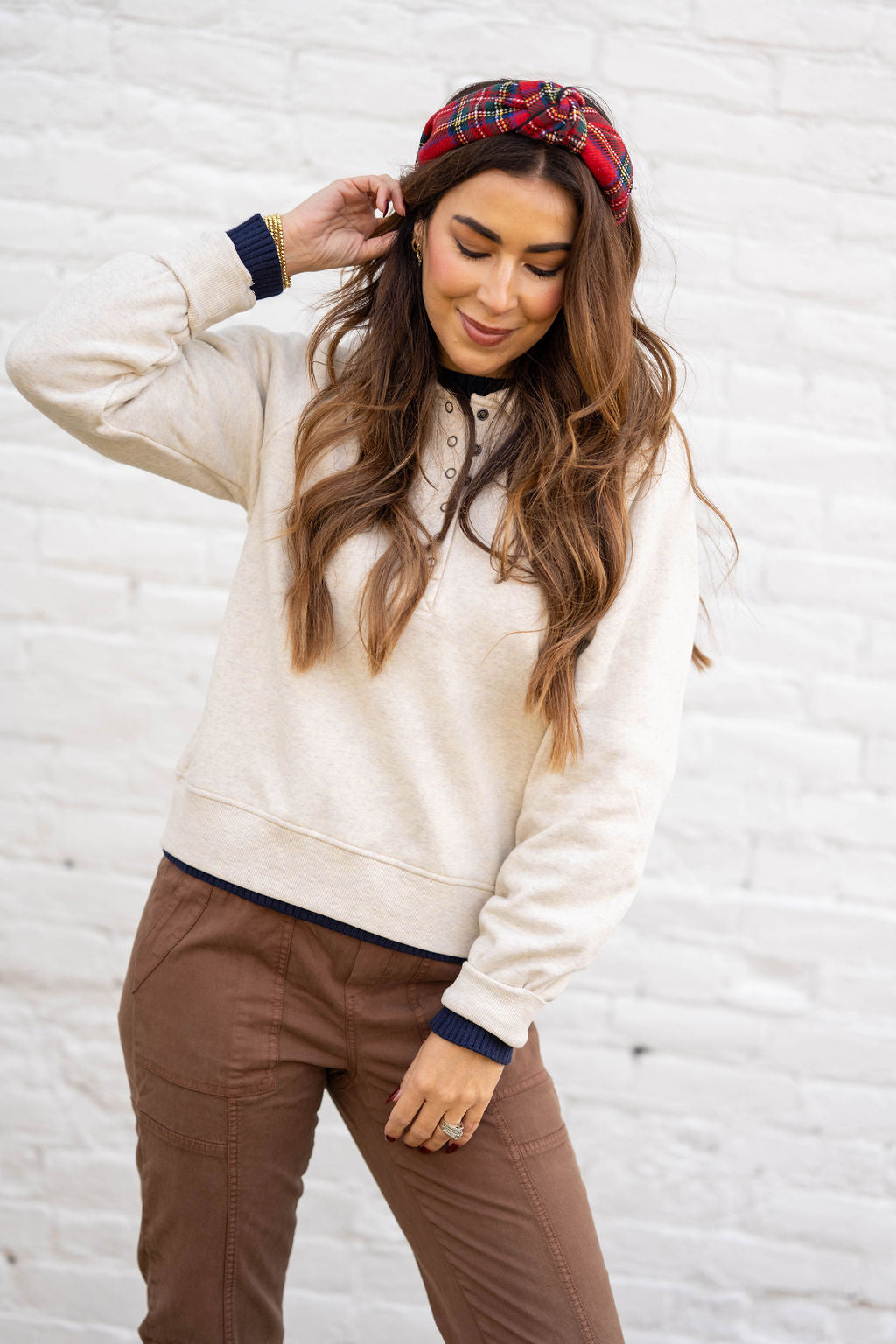 Casual, cozy, and effortlessly cute — this henley-trim pullover is the perfect throw-on-and-go style for cooler days. Designed with a soft fleece-feel fabric, contrast ribbed cuffs, and a henley button neckline peeking through for that layered look, it brings just the right amount of detail to a simple silhouette.