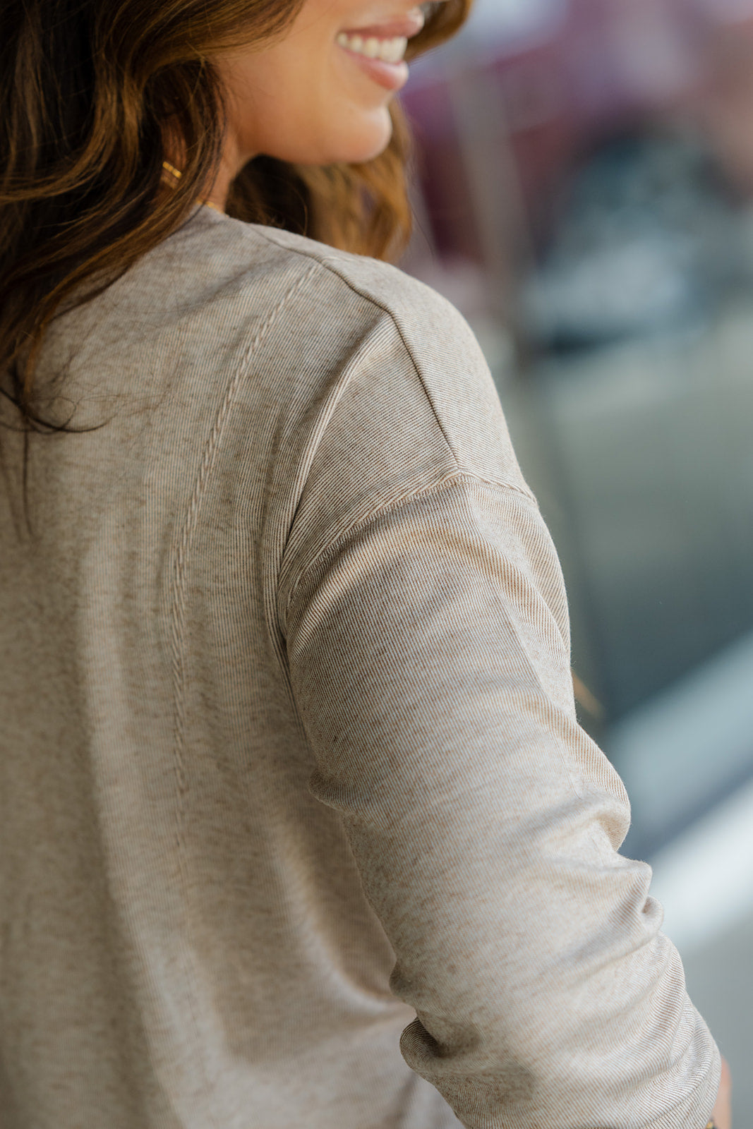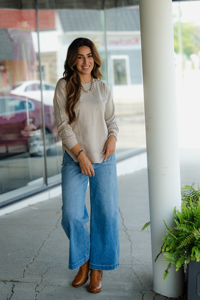 A heathered sweatshirt set apart from the rest with a fun seam detailing and side slit! Pair with denim and a statement necklace or cute pair of earrings for a more elevated look, or with joggers or leggings and a vest or shacket for a quick yet super cute on-the-go look!