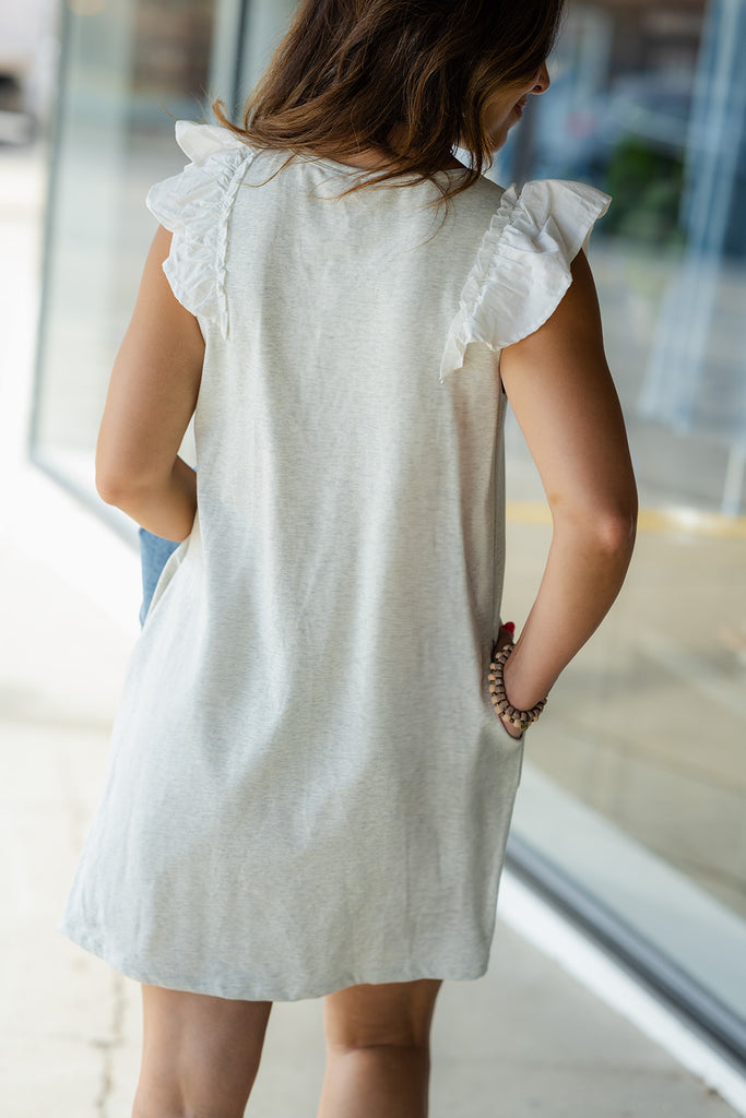 A soft and lightweight dress that can be dressed up or down with ease! The blouse-like ruffle addition to this dress really pops against the heathered body and of course we are loving the pockets! Wear alone in the warmer months or pair with leggings and boots in the cooler ones! Don't forget your favorite accessories for a complete Betsey's look!