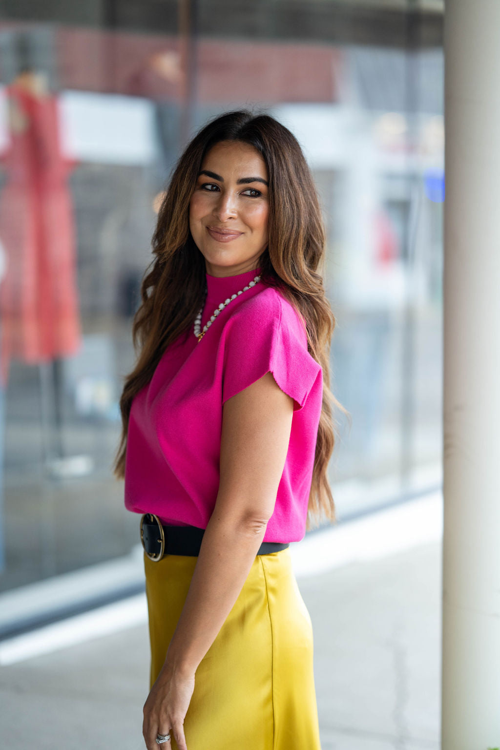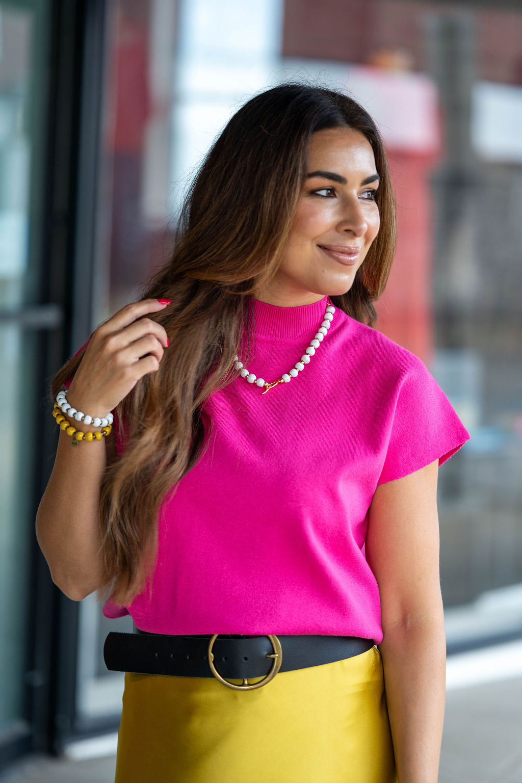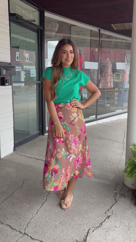 Knit sweaters aren’t just for the cooler months! This tee can easily be paired with shorts or a skirt for the warmer ones too! We love the soft material and mock neckline of this tee! Add a cardigan, blazer, or jacket for the cooler months.