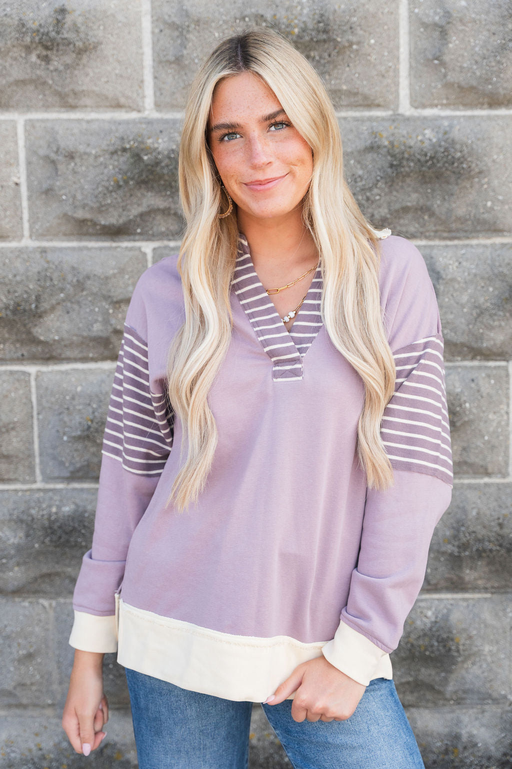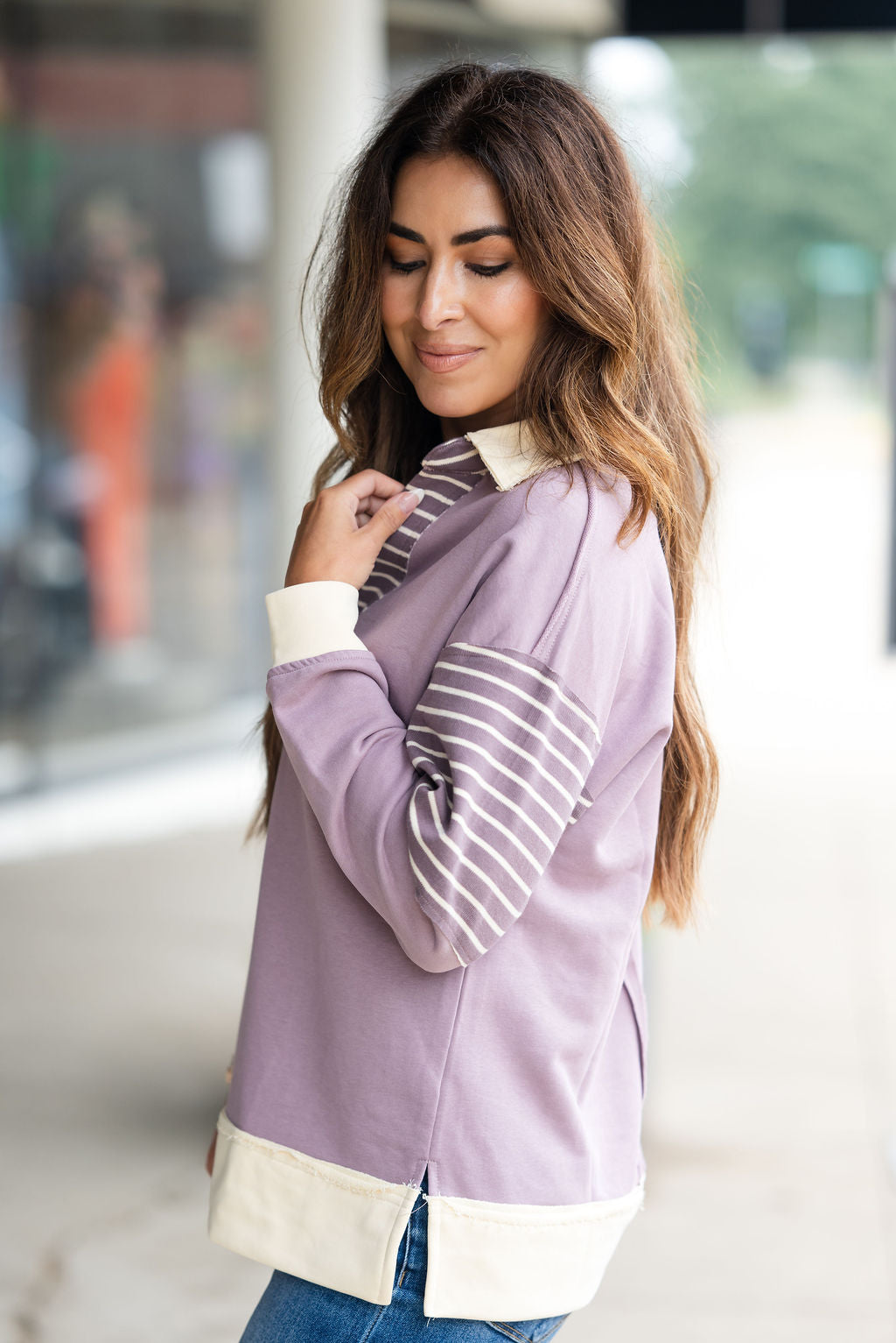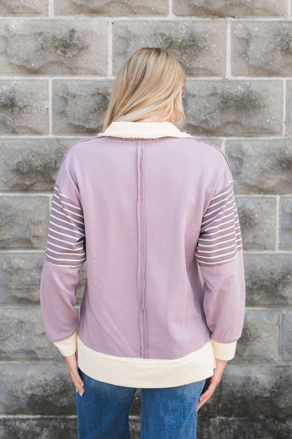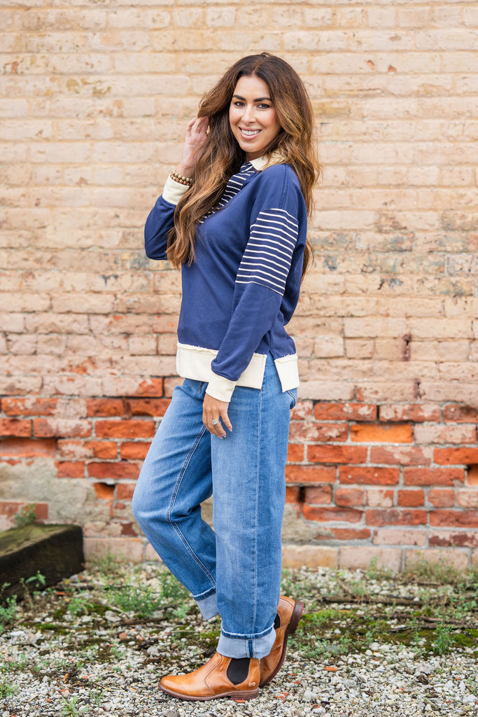 This is such a fun and unique sweatshirt! The raw stitched accents with the pop of stripes and a added collar gives this an edgy look! Pair with shorts in the warmer months or with your favorite denim, joggers, or leggings in the cooler ones! This can be worn more casually or dressed up with your favorite accessories!