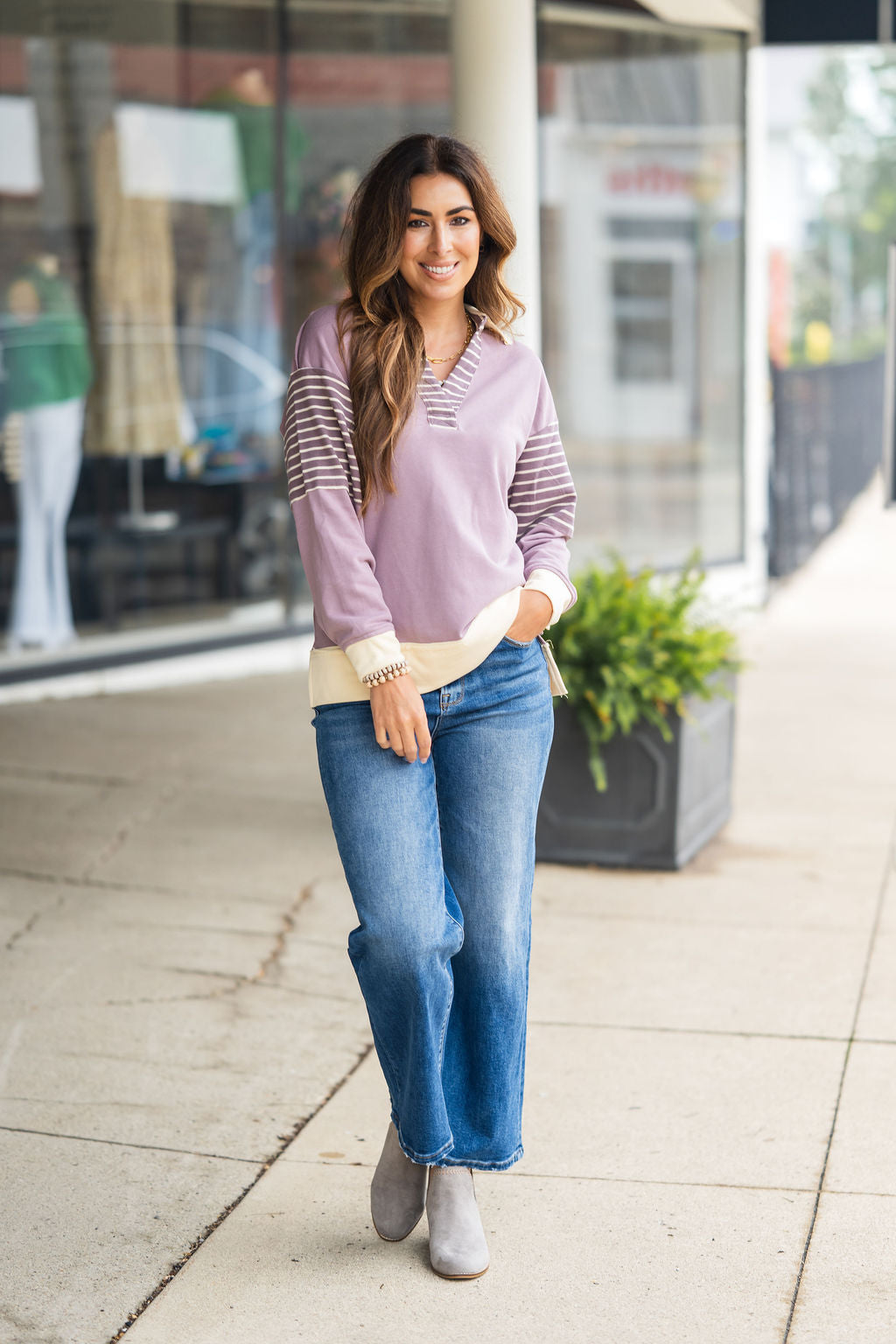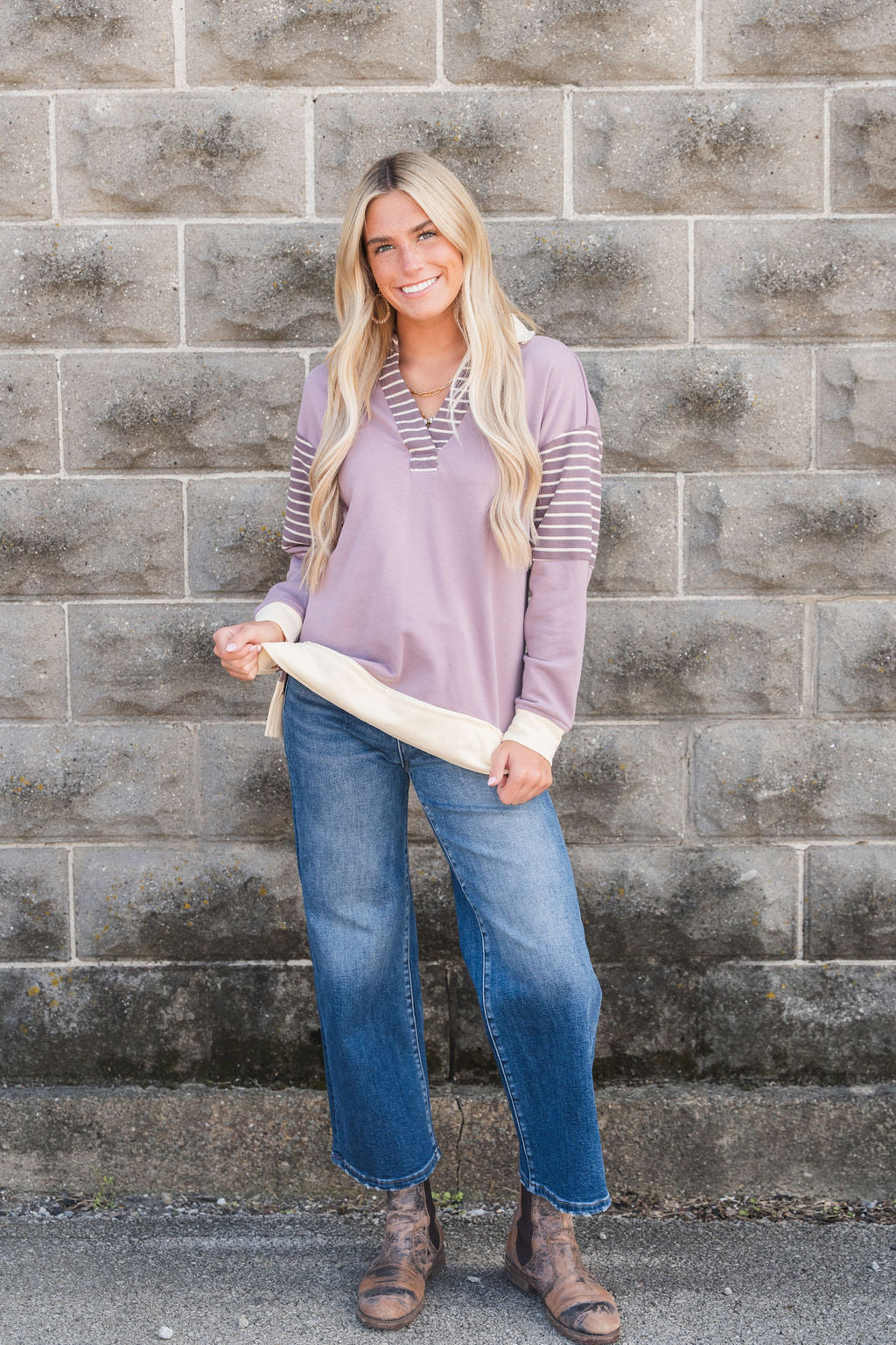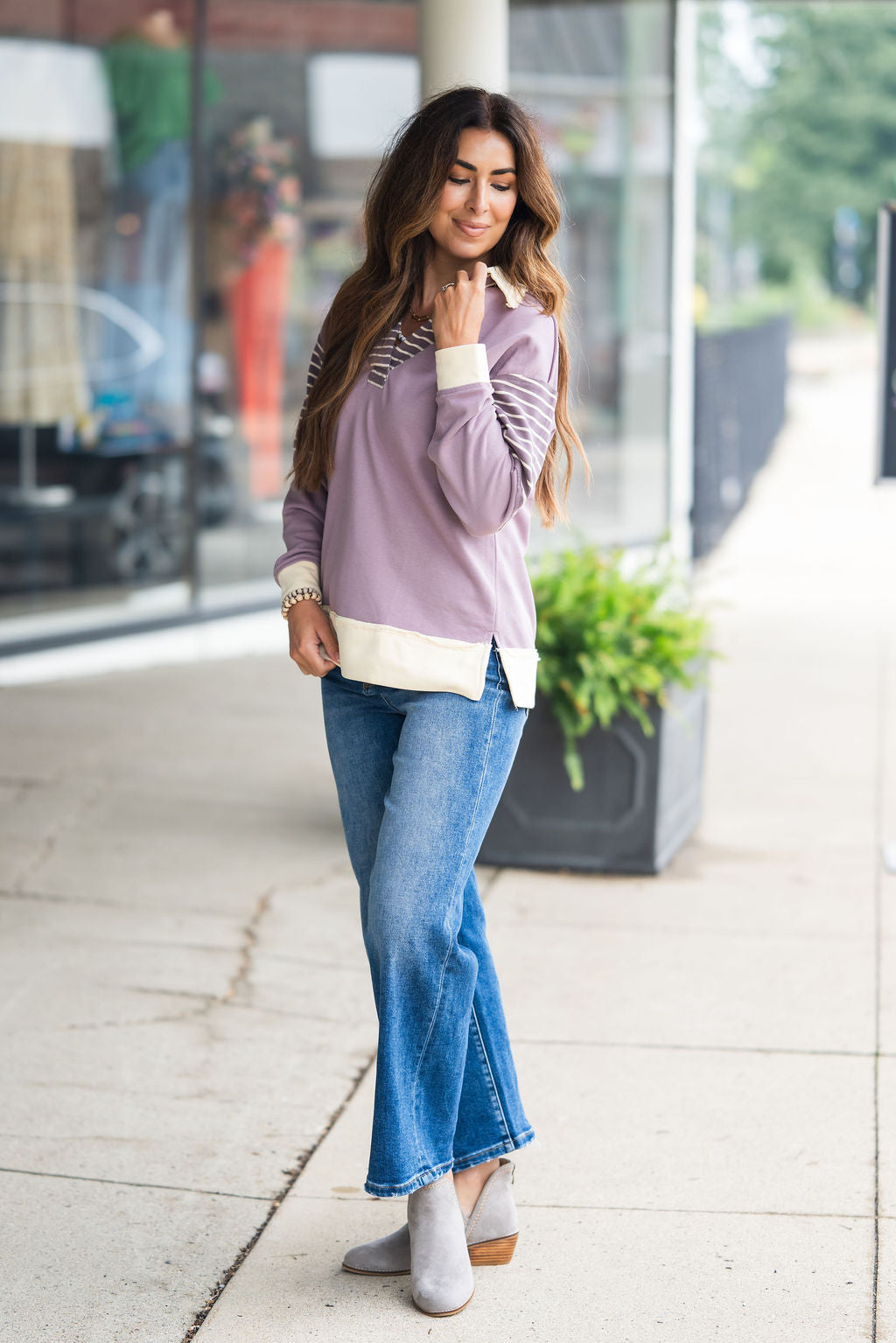 This is such a fun and unique sweatshirt! The raw stitched accents with the pop of stripes and a added collar gives this an edgy look! Pair with shorts in the warmer months or with your favorite denim, joggers, or leggings in the cooler ones! This can be worn more casually or dressed up with your favorite accessories!