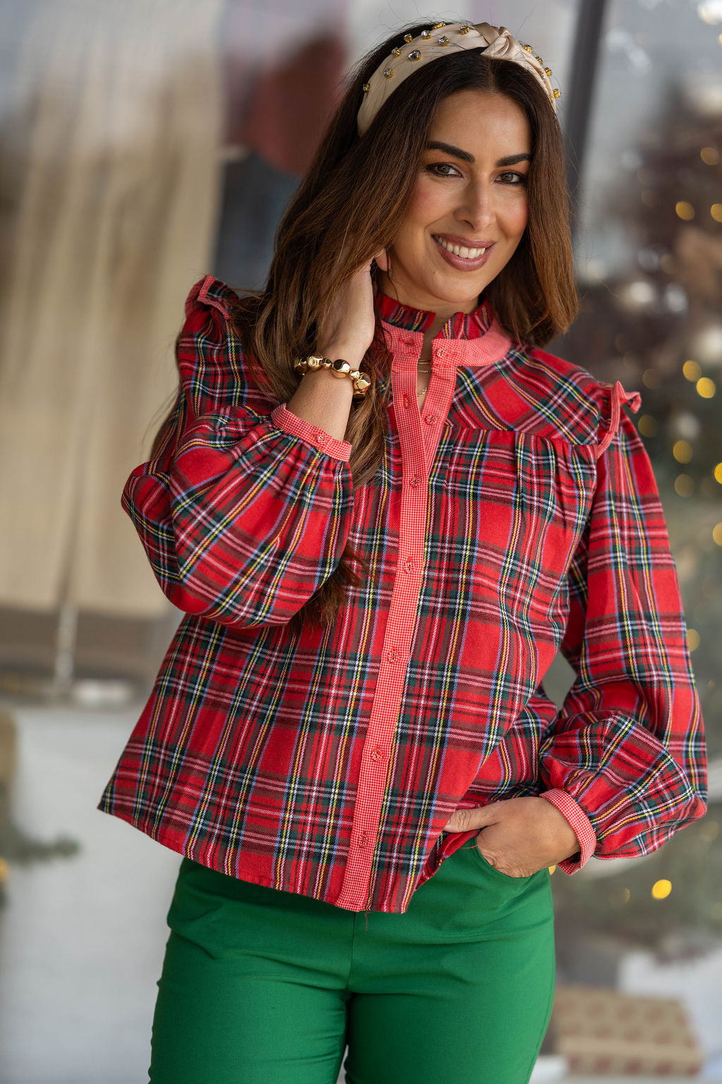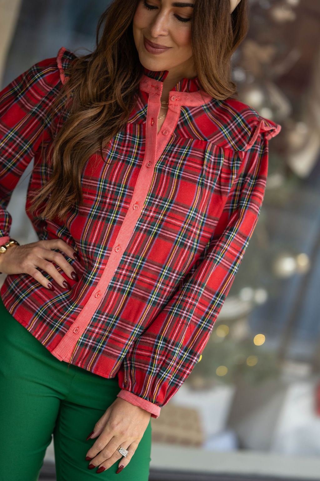 Classic holiday charm meets feminine detail in this adorable plaid button top. Designed with a vibrant red tartan print, it features ruffled shoulders, a contrasting button placket, and soft balloon sleeves gathered at the wrist for a polished finish.