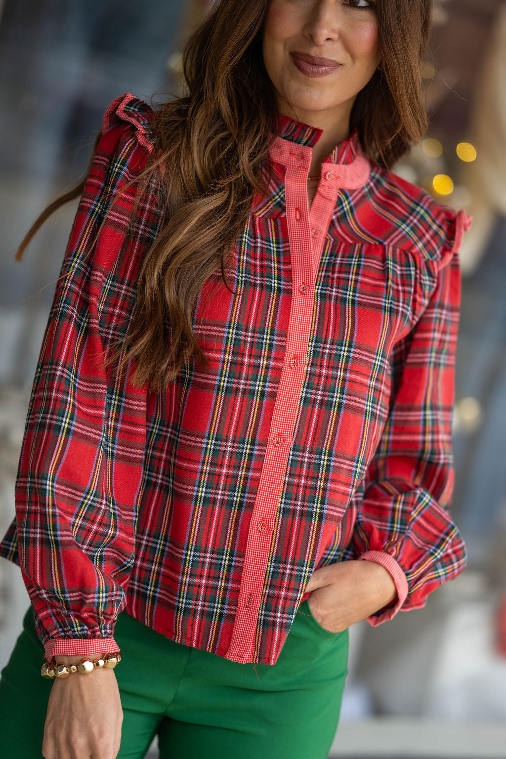 Holly Plaid Ruffle Button Top