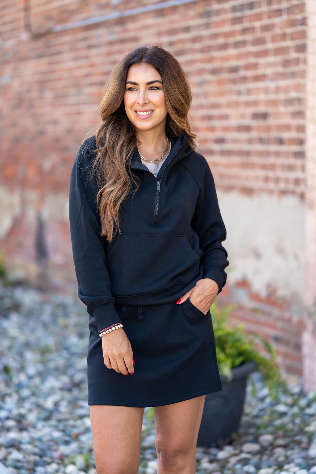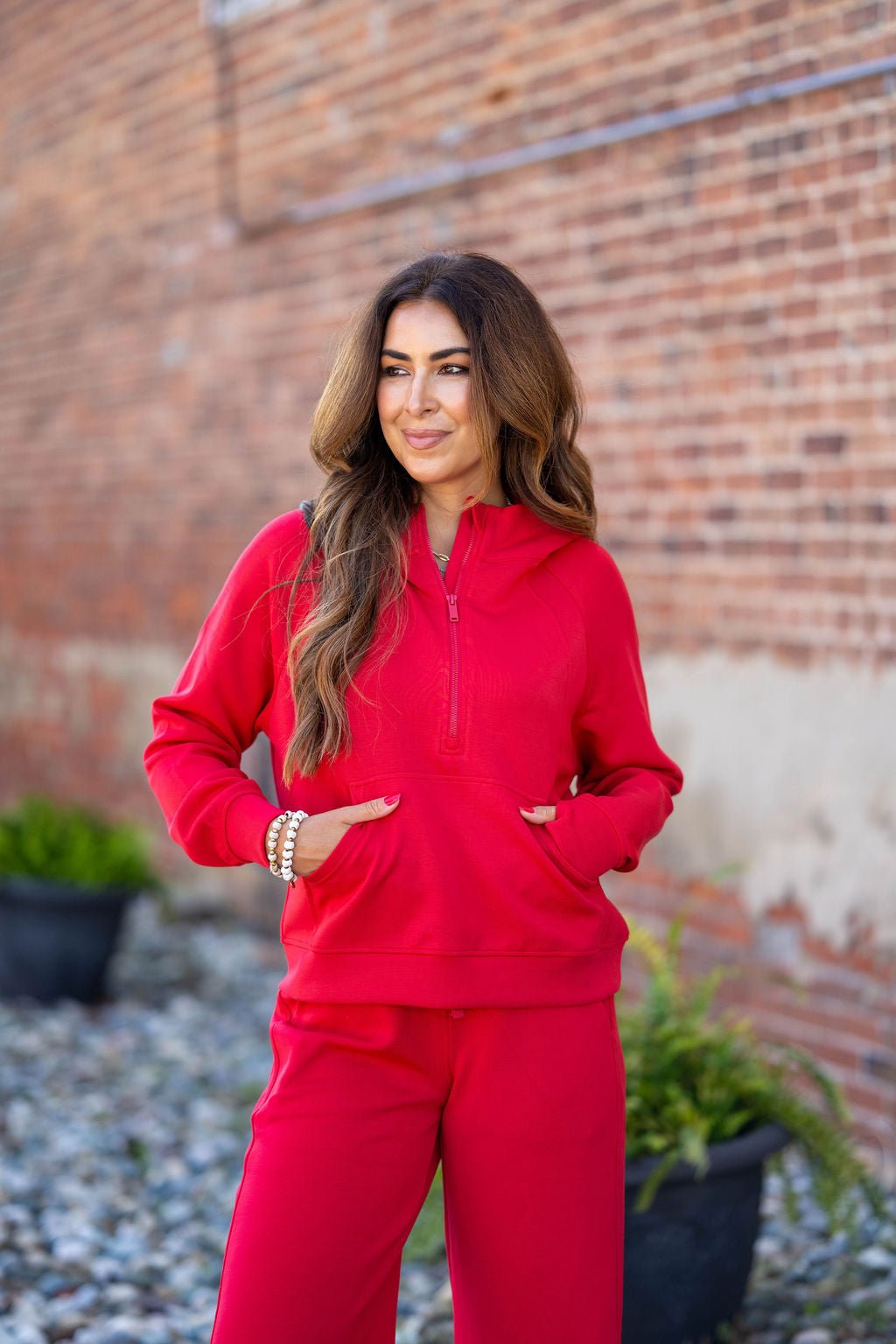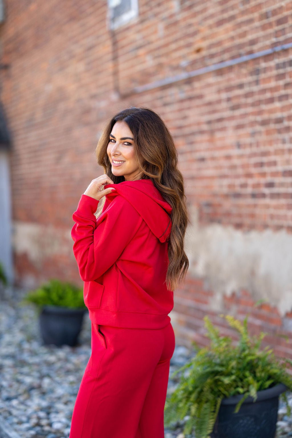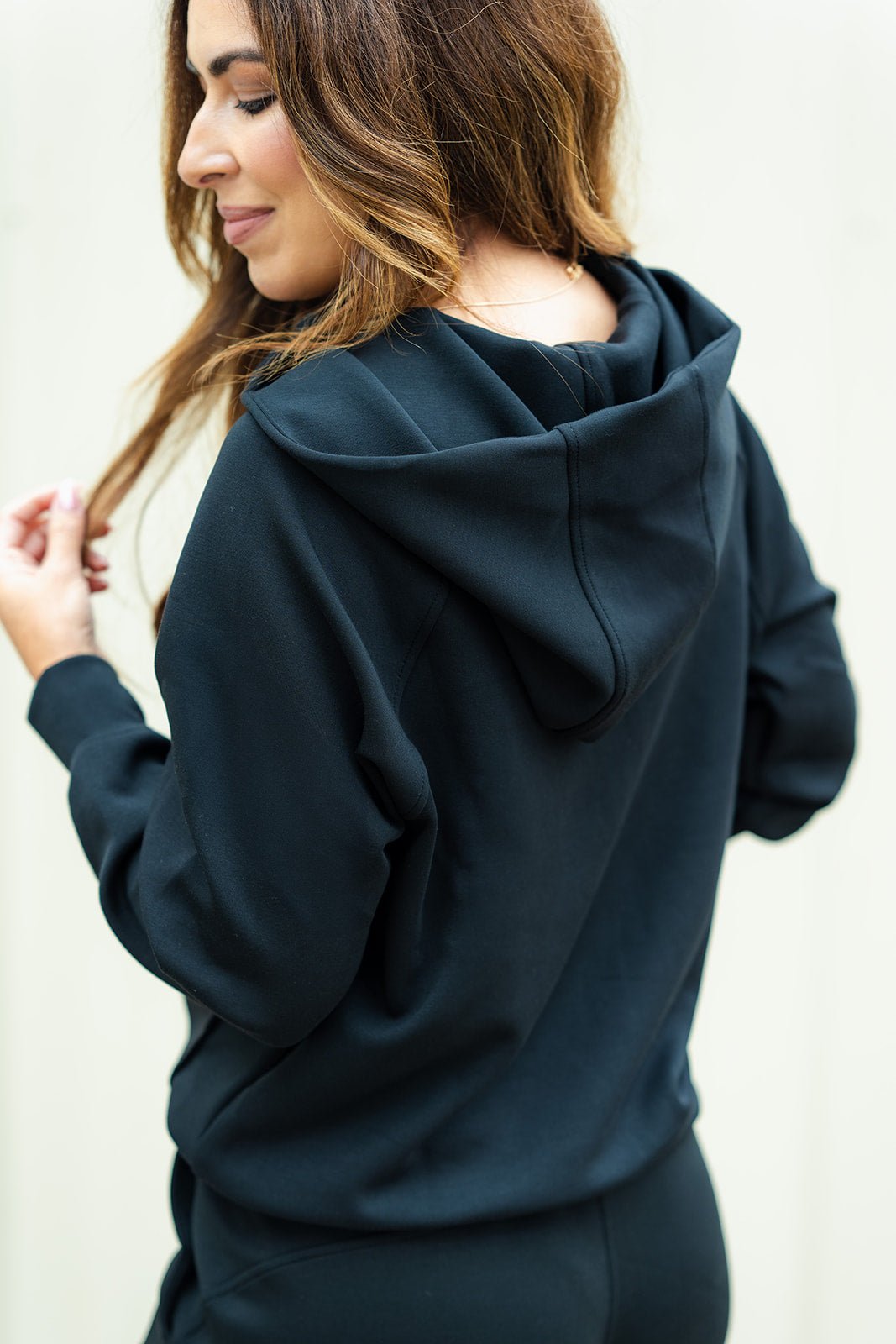 Your new go-to pullover hooded sweatshirt has arrived! Soft and lightweight, this can be worn with shorts in the warmer months or leggings, denim, or joggers in the cooler ones! We love that this can take you from the gym to busy days on-the-go! The scuba material makes this such a comfy piece to have and this pairs perfectly with our Wide Leg Scuba Pants for a complete set!