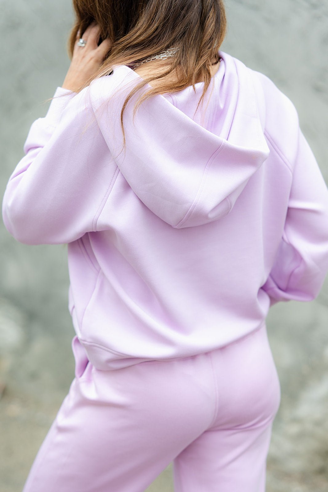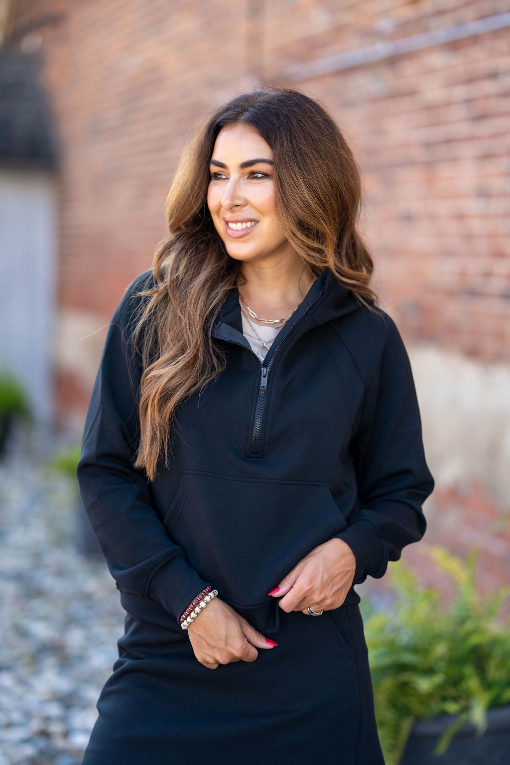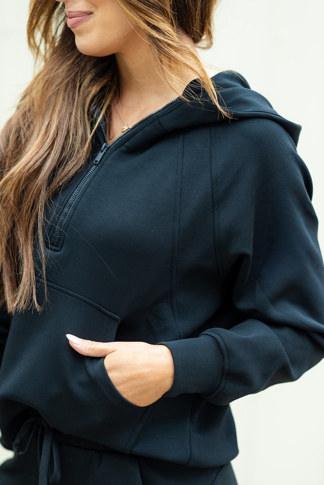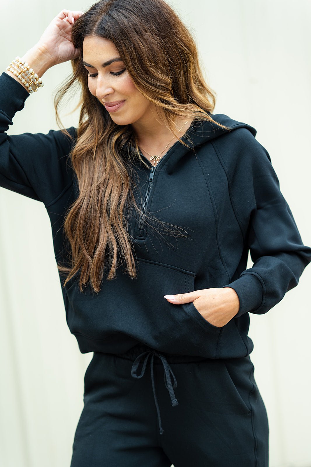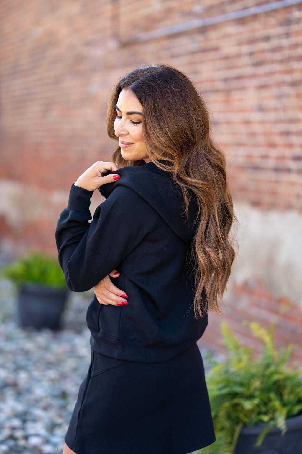 Your new go-to pullover hooded sweatshirt has arrived! Soft and lightweight, this can be worn with shorts in the warmer months or leggings, denim, or joggers in the cooler ones! We love that this can take you from the gym to busy days on-the-go! The scuba material makes this such a comfy piece to have and this pairs perfectly with our Wide Leg Scuba Pants for a complete set!