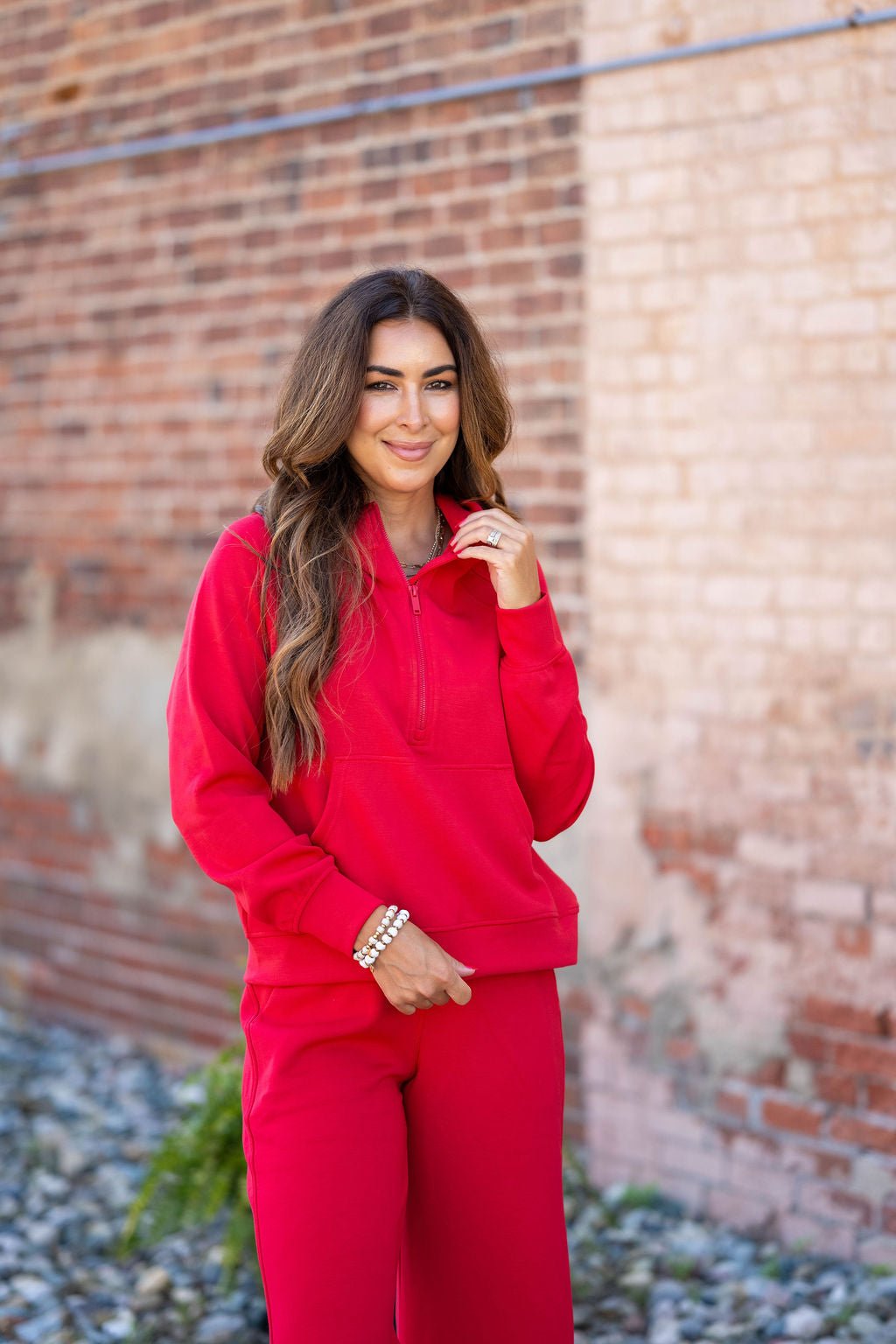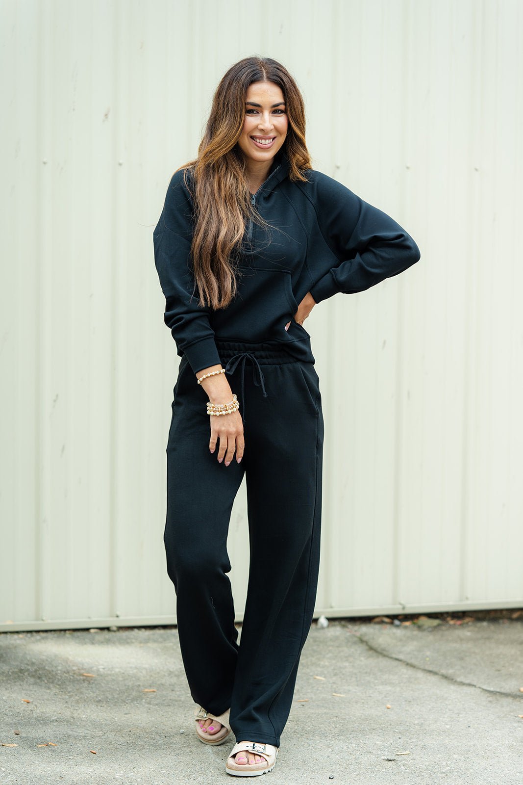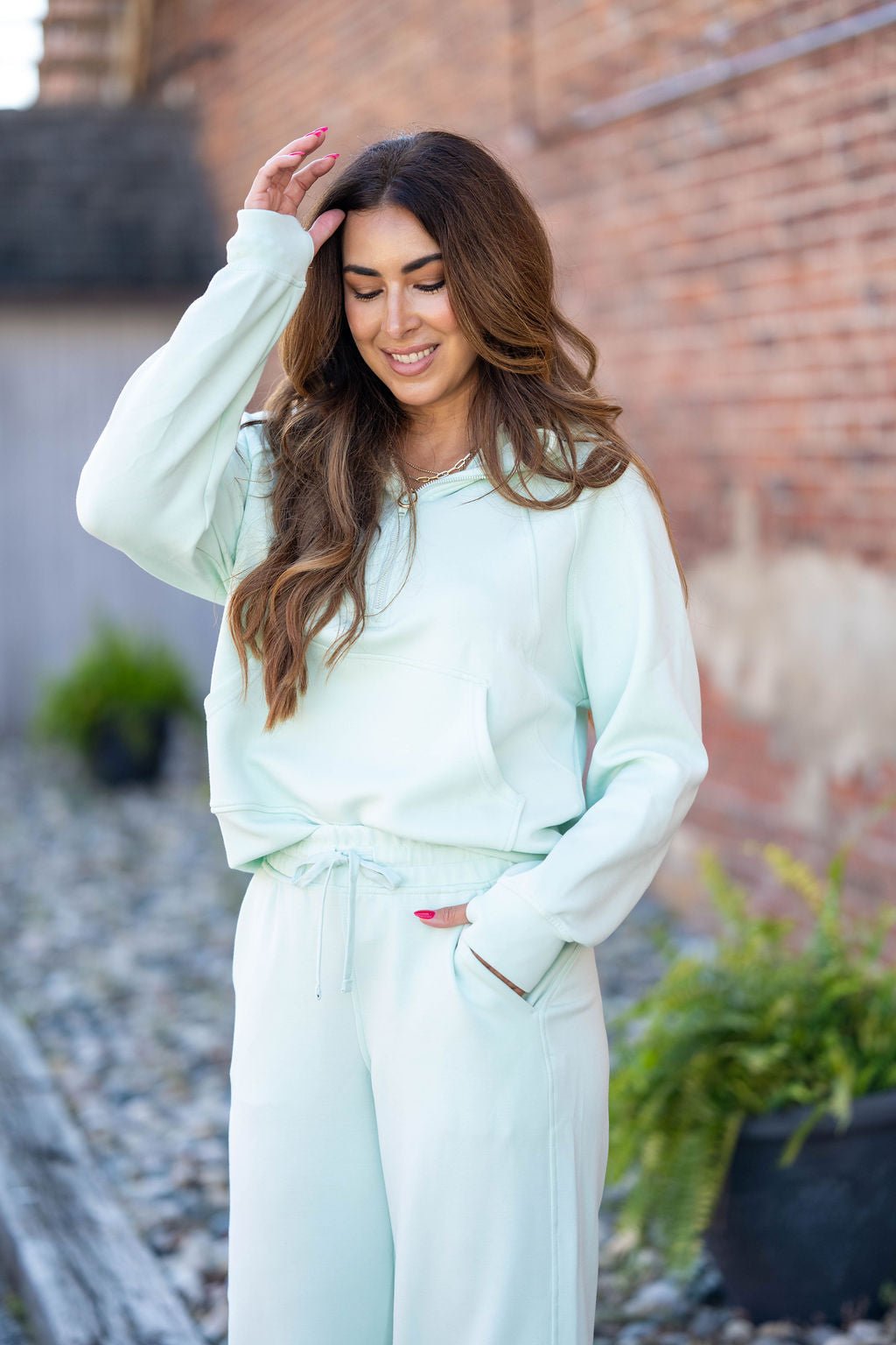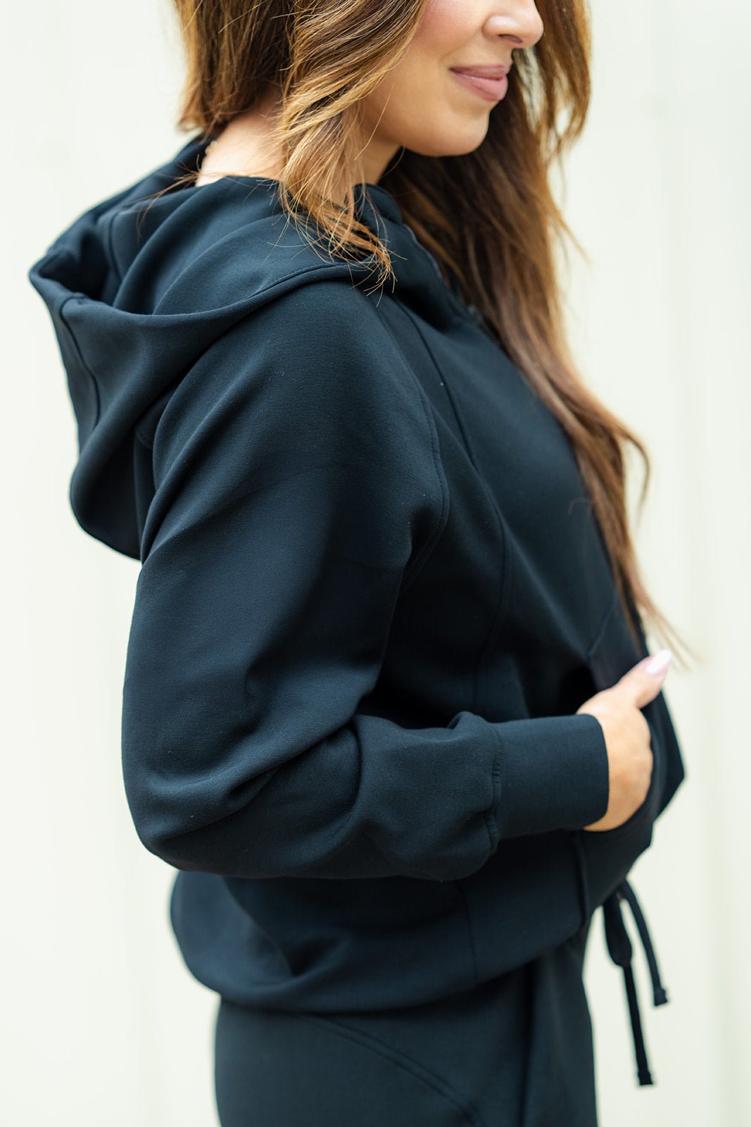 Your new go-to pullover hooded sweatshirt has arrived! Soft and lightweight, this can be worn with shorts in the warmer months or leggings, denim, or joggers in the cooler ones! We love that this can take you from the gym to busy days on-the-go! The scuba material makes this such a comfy piece to have and this pairs perfectly with our Wide Leg Scuba Pants for a complete set!
