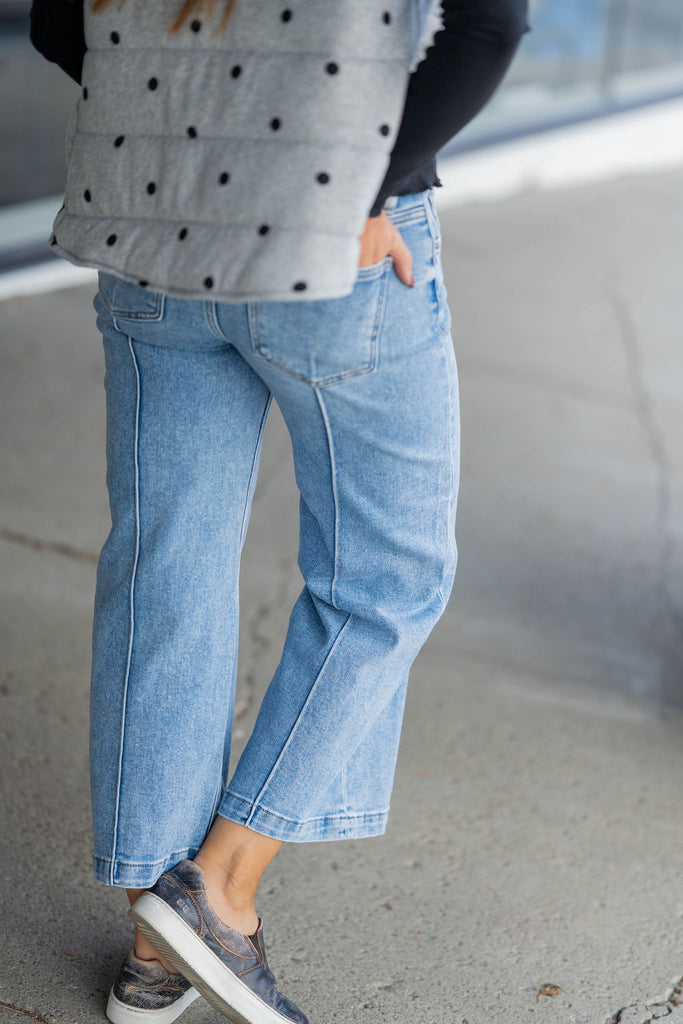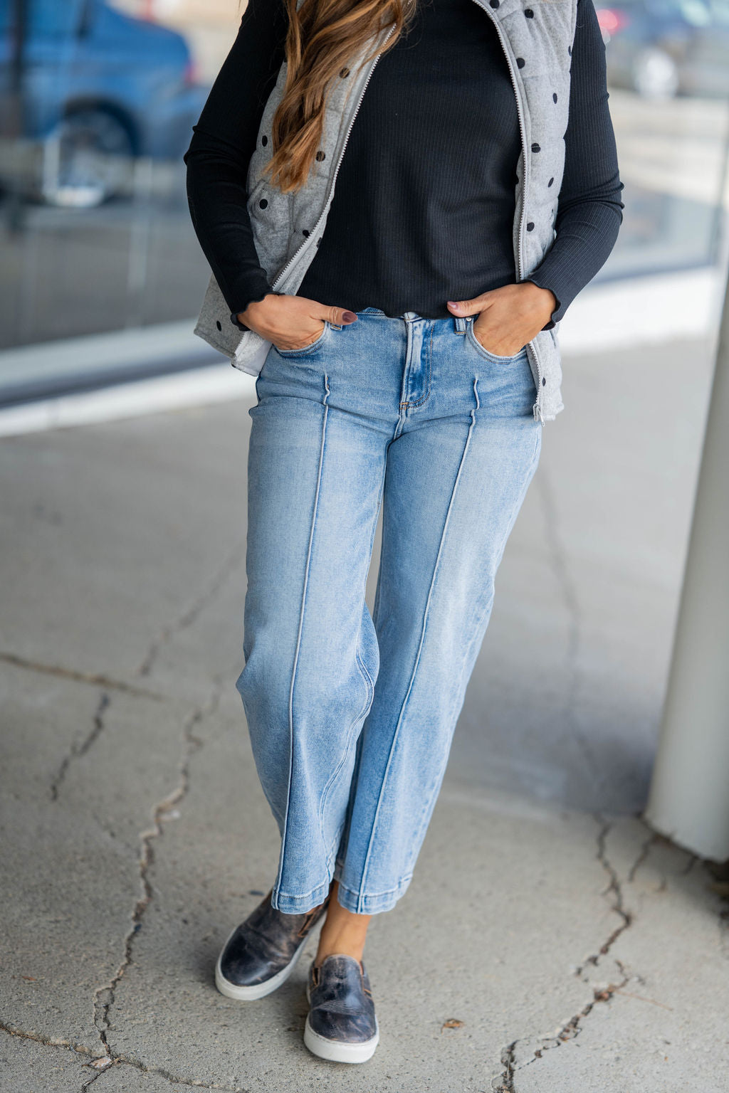 A modern twist on classic denim, these jeans feature a front seam detail that gives a sleek, elongated look. Easy to style with casual tops or dressier layers, they’ll be a go-to in your closet.
