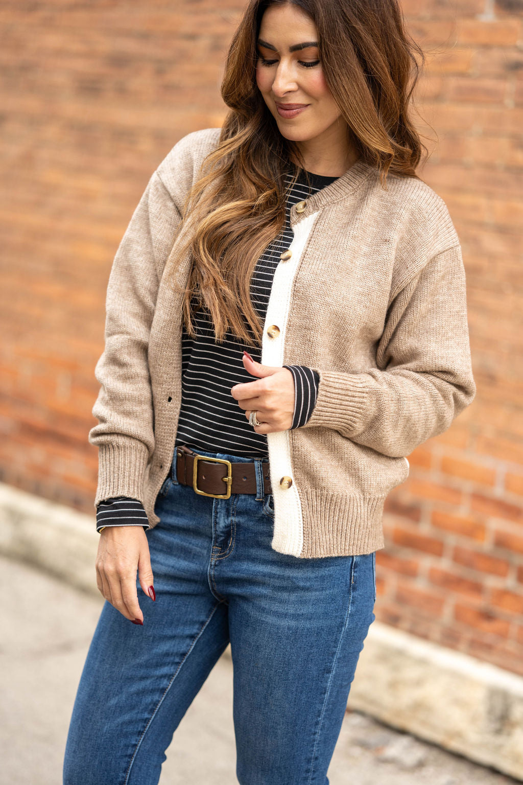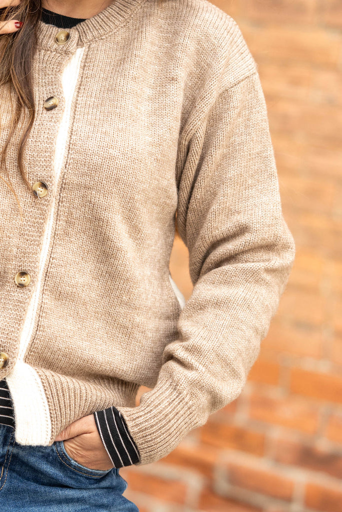 This button-front cardigan brings an effortless, cozy charm with its soft knit texture and relaxed silhouette. The contrasting trim and classic buttons add a touch of polish, making it easy to dress up or keep casual.