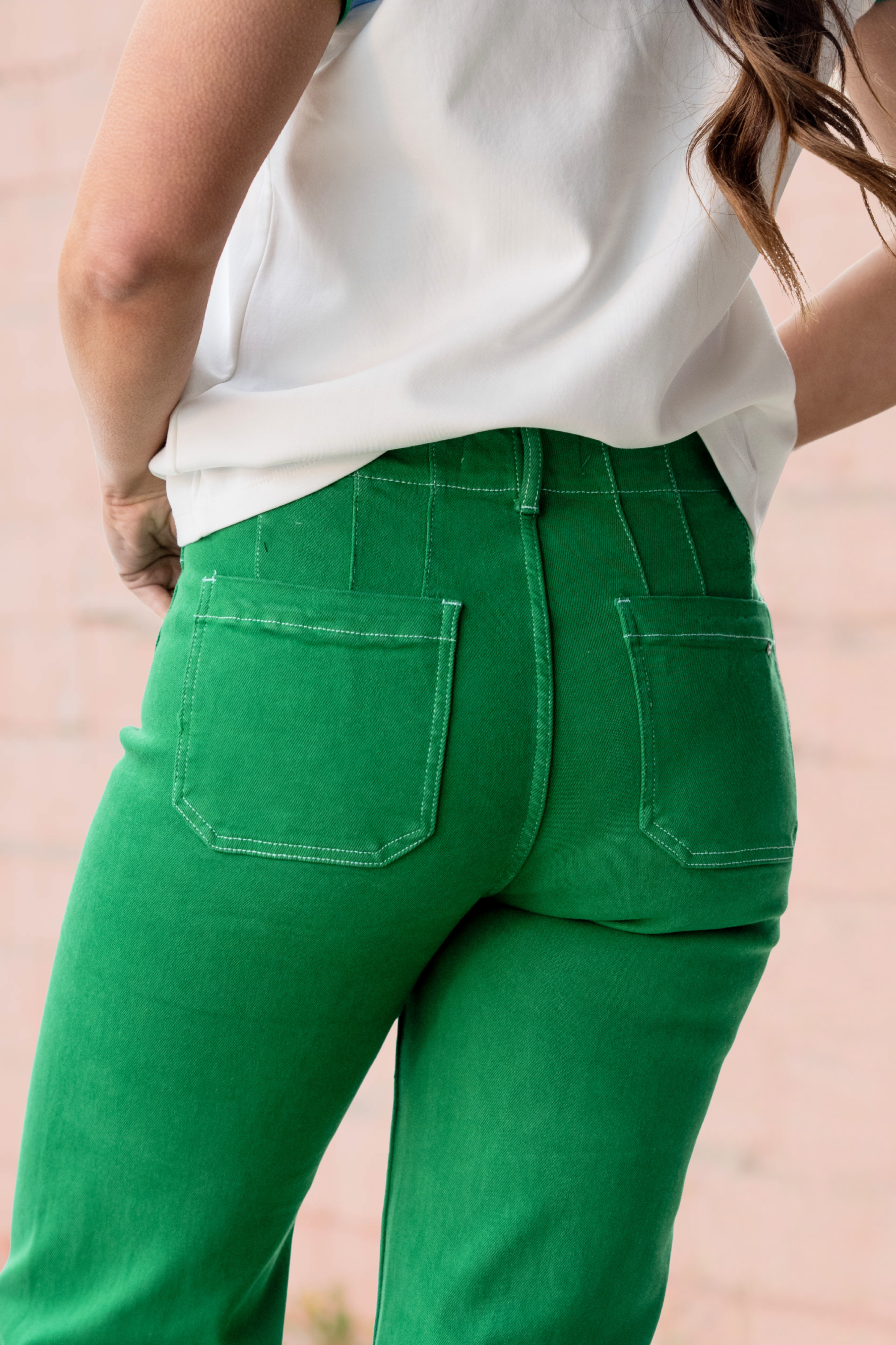 Bold, flattering, and made to stand out — these high-rise cropped pants bring the perfect pop to your everyday wardrobe. Designed with a structured waistband and statement front patch pockets, they create a sleek, elongating silhouette while keeping things fun and fresh.