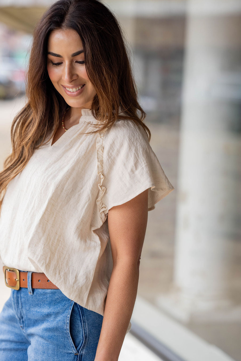 Easy, feminine, and effortlessly polished — this top is the kind of piece you'll reach for again and again. Designed with delicate ruffle details along the neckline and shoulders, it adds a soft touch of charm while keeping a relaxed, flattering silhouette.