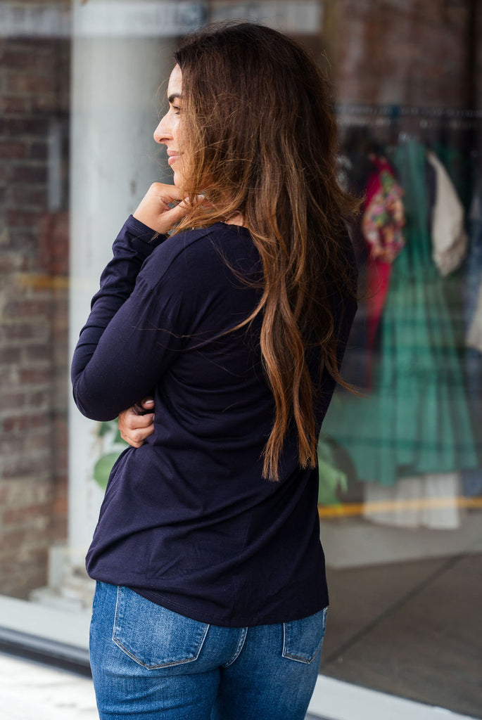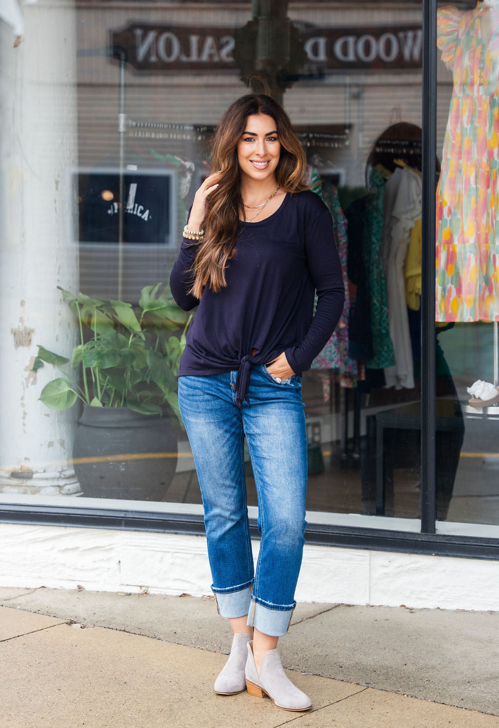 A lightweight long-sleeve tee elevated with a tie bottom detailing! Wear this alone or use as a layering piece with your vests, cardigans, or shackets! We love that this can be dressed up or down for wherever the day takes you!