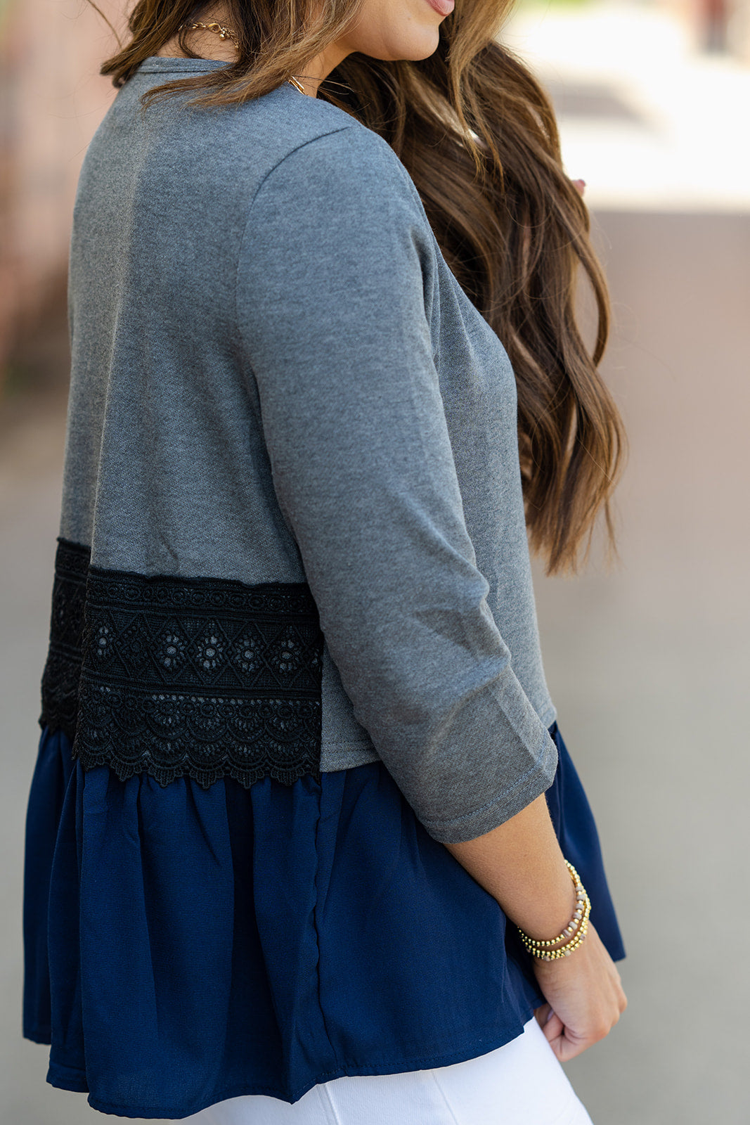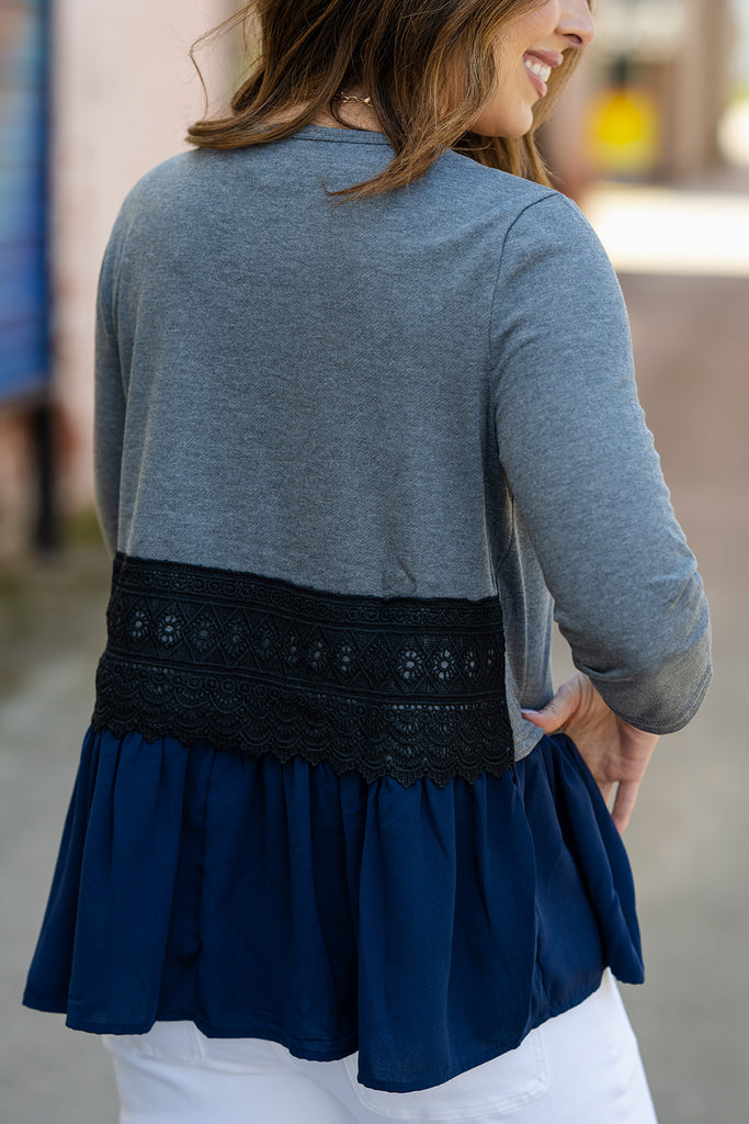 This 3/4 sleeve tee is one-of-a-kind! The top is made of soft t-shirt material and has a blouse-like bottom for a fun faux-layered look! The lace accent on the back truly ties this whole tee together. Pair with shorts in the warmer months or your favorite denim, joggers, or our Betsey's Jeggings for the cooler ones! This can be dressed up or down with ease for everyday wear.