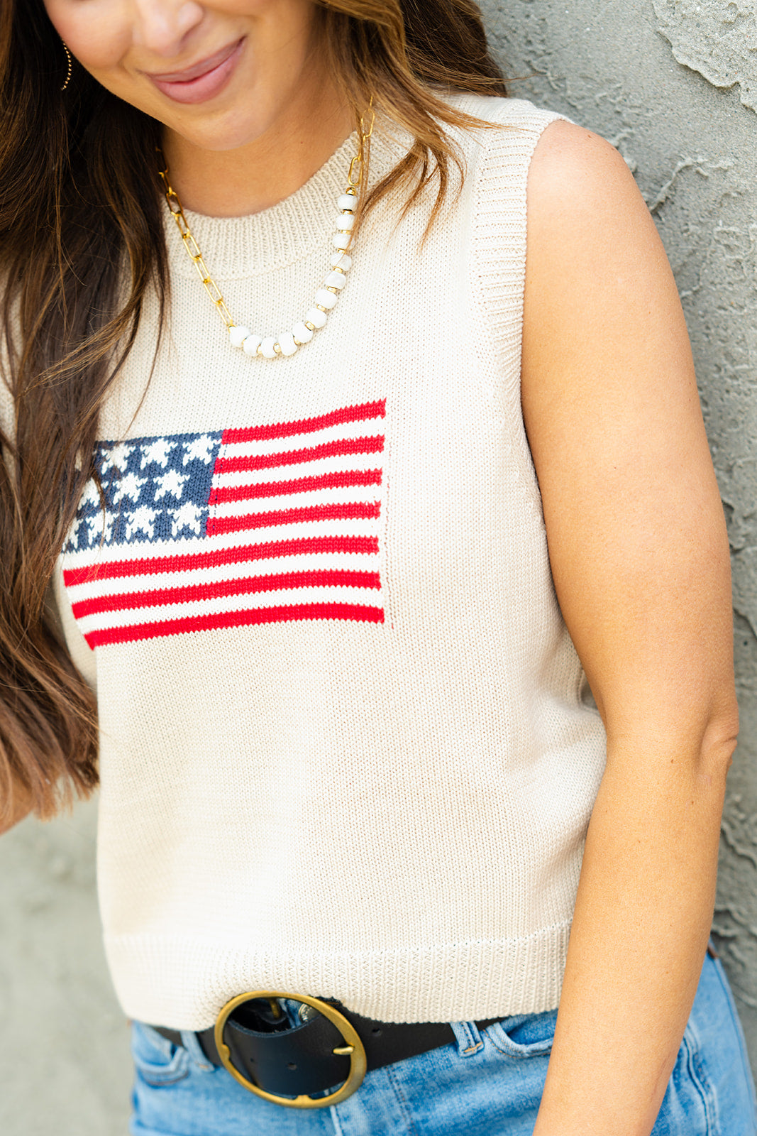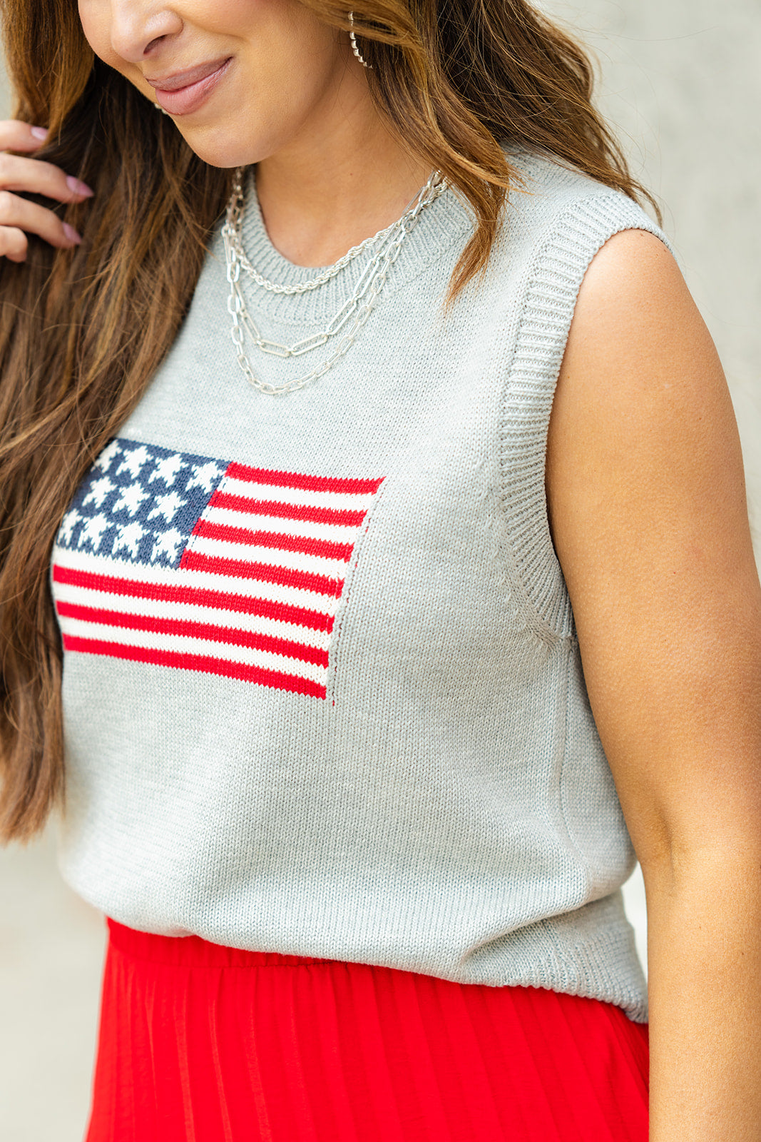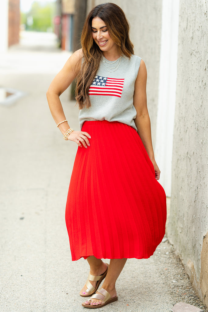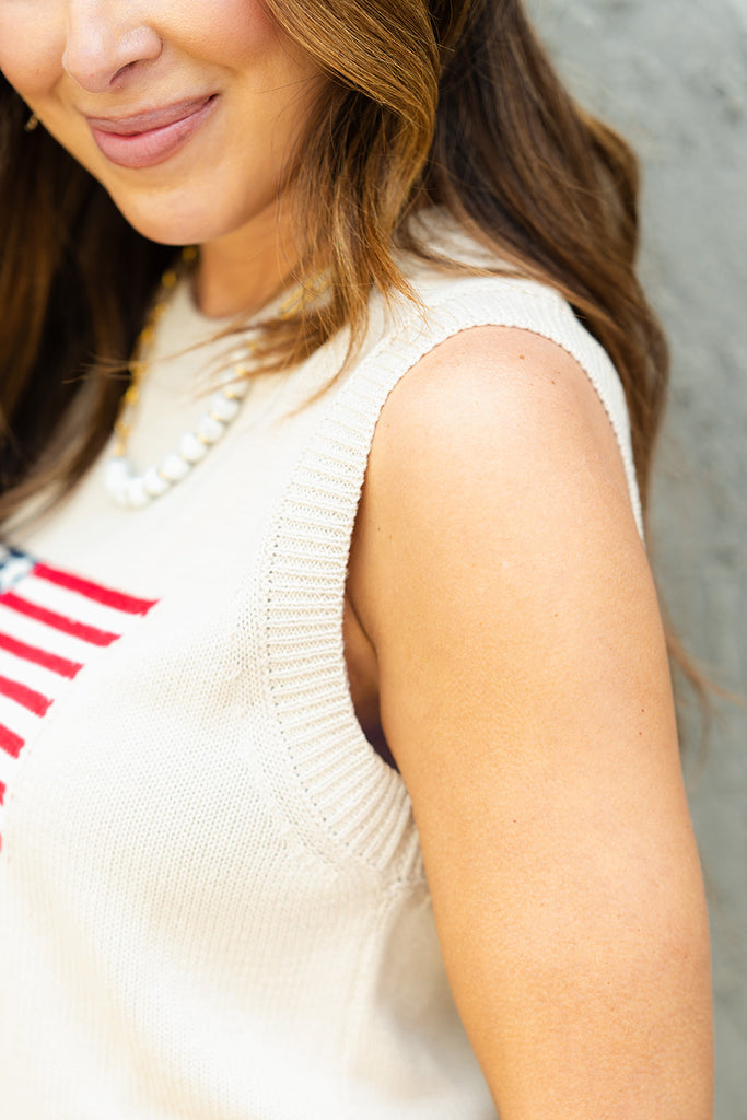 Feel patriotic in this tank! With the knit feel and ribbed trim detailing, this tank is unlike all the rest! Pair with a skirt or shorts in the warmer months or use as a base for your blazers, cardigans, or jackets for the cooler ones! This can be dressed up or down with ease, making it a staple piece for your wardrobe!
