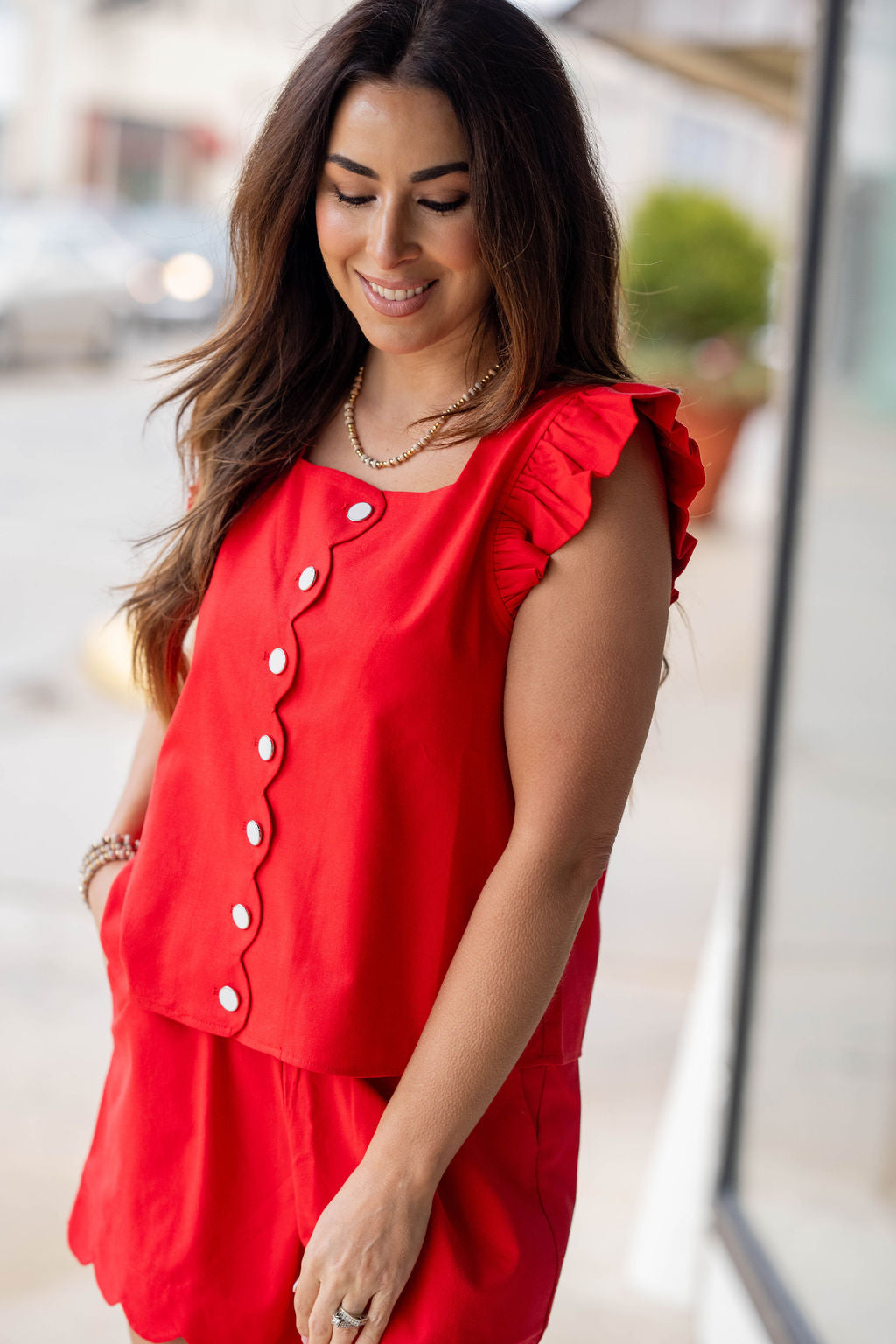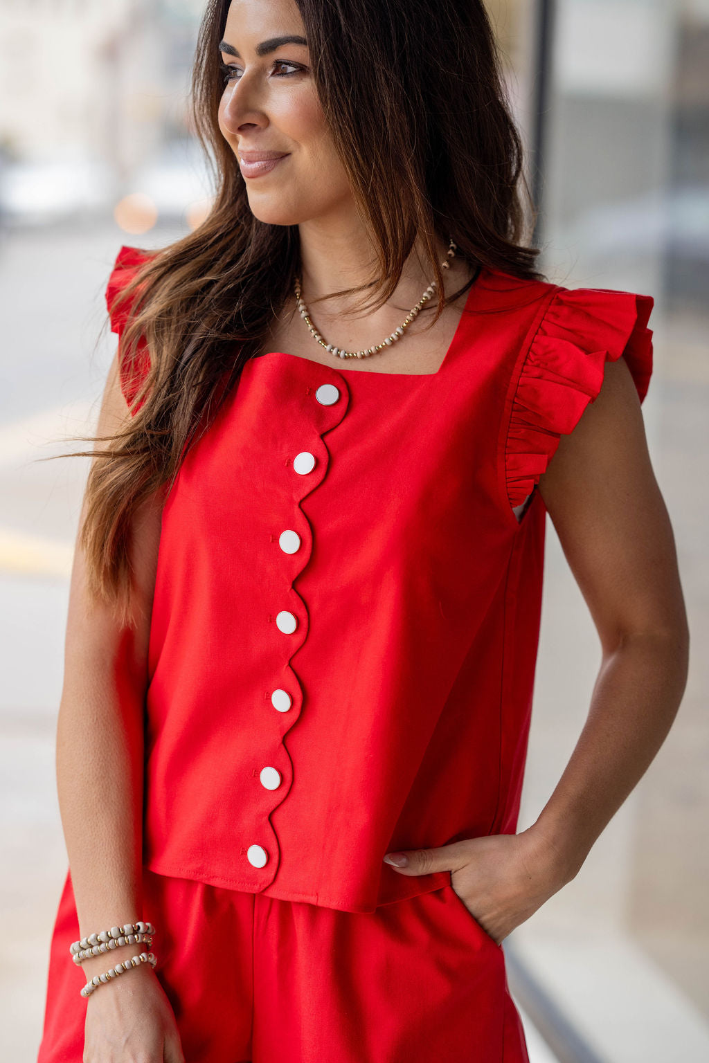 Feminine details meet effortless style in this charming statement top. Designed with delicate ruffle sleeves and a playful scalloped button-front detail, this piece adds the perfect touch of personality to your everyday wardrobe.