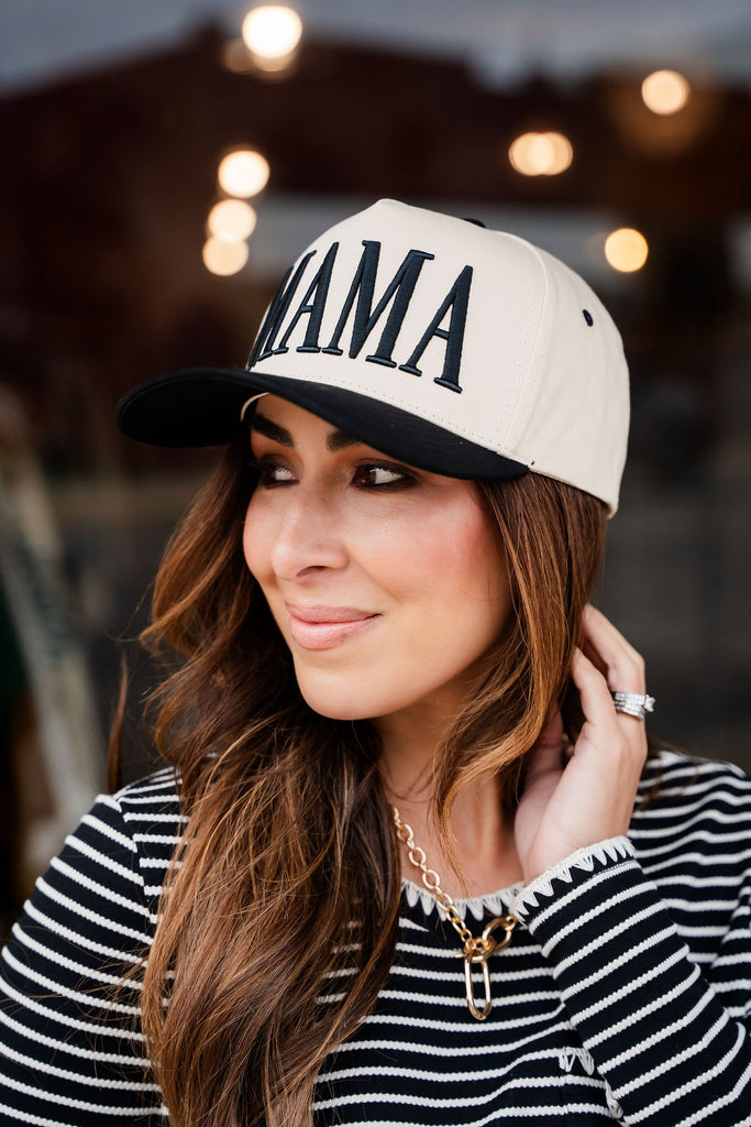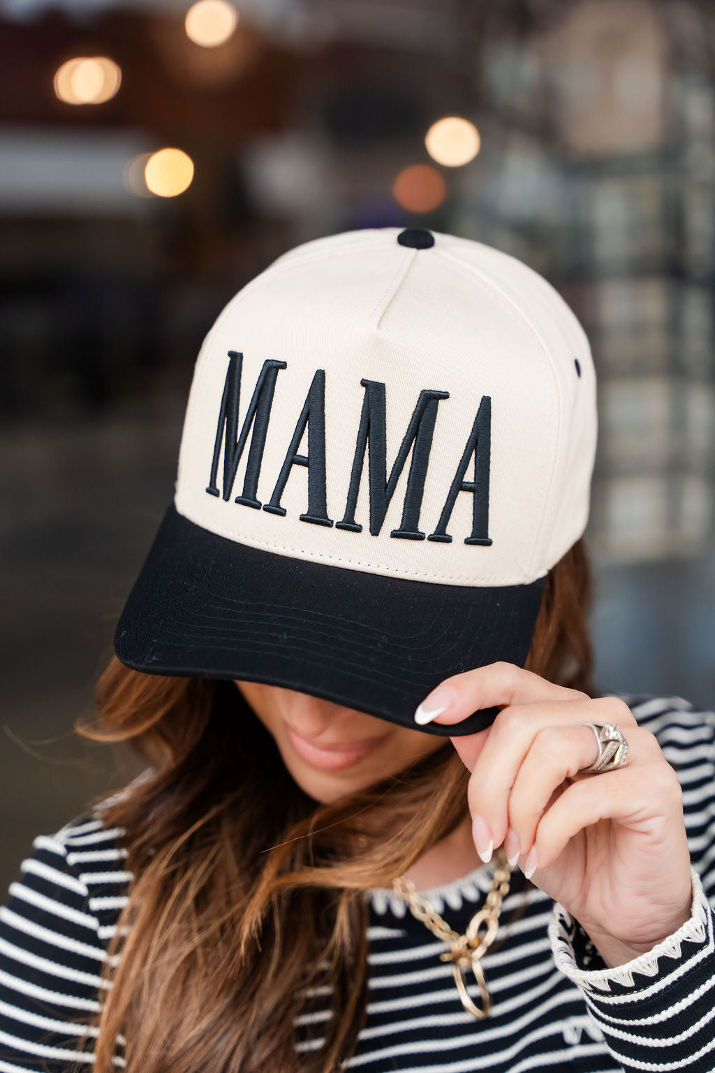 A laid-back essential for every on-the-go mama. This two-tone cap brings a modern edge to casual days with its bold embroidered “MAMA” detail and structured fit — perfect for errands, school drop-offs, or coffee runs.