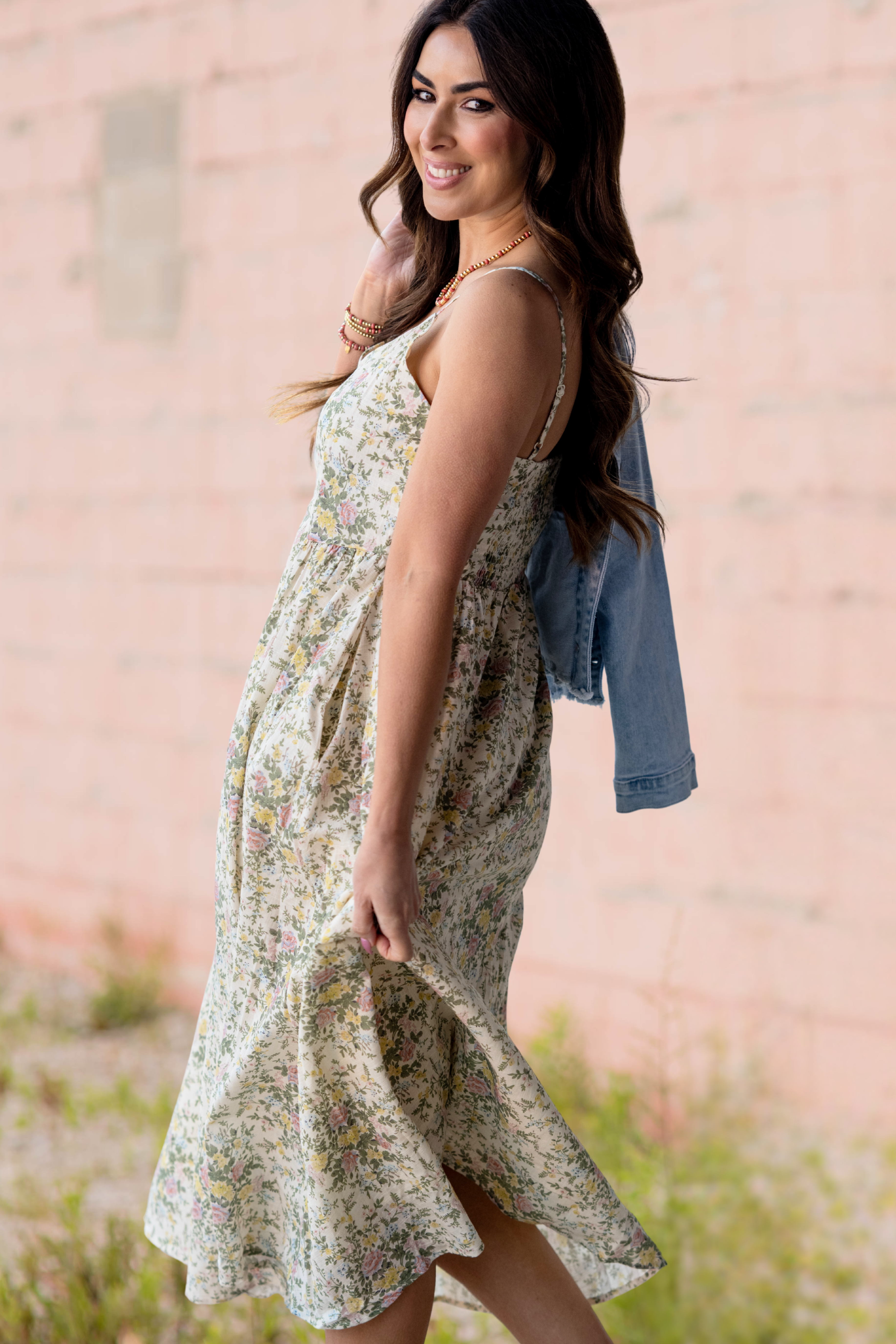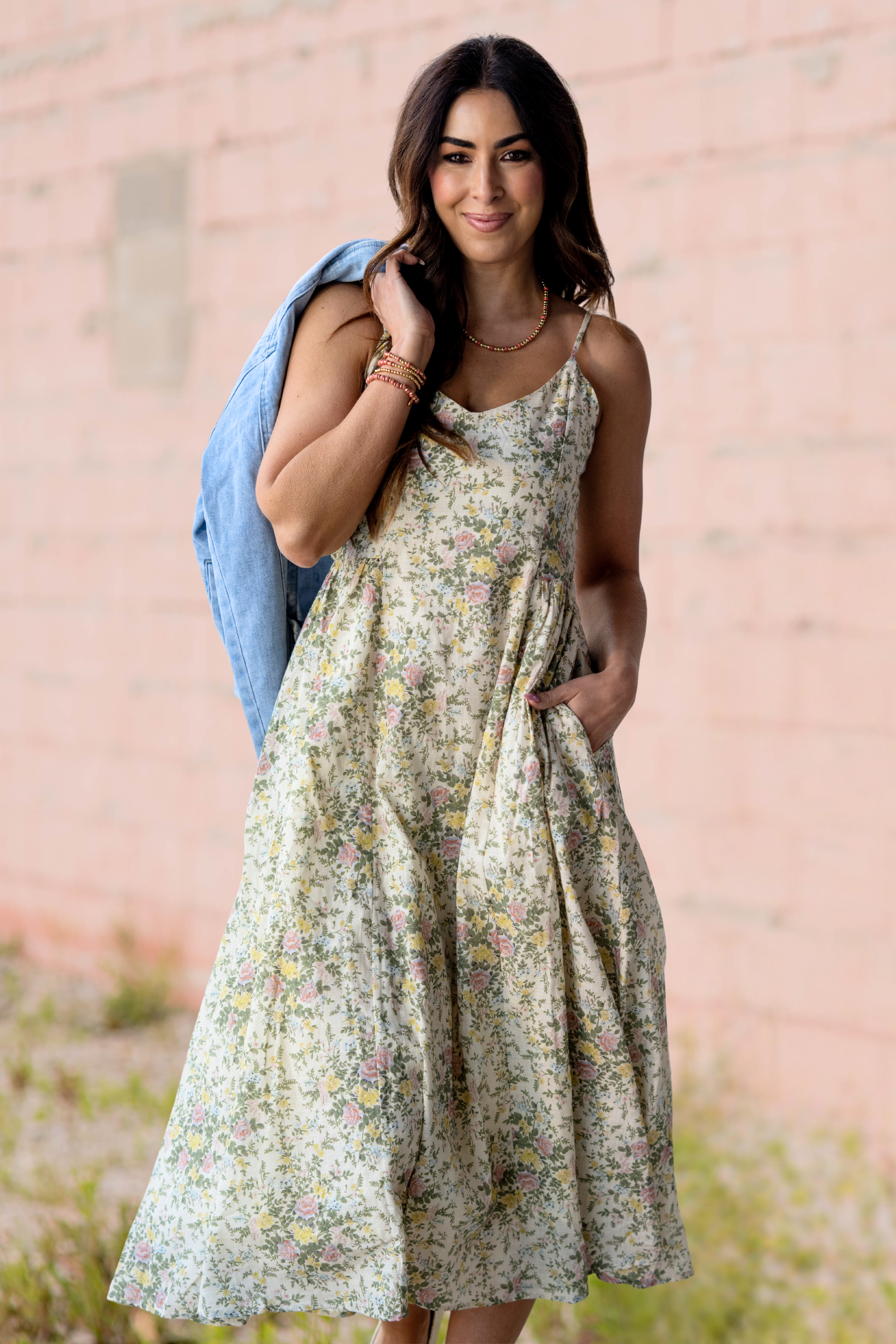 Soft, romantic, and effortlessly graceful — this floral midi is made for slow mornings, sunshine strolls, and everything in between. Designed with a flattering fitted bodice and flowy skirt, it moves beautifully with every step while keeping you comfortable all day long.