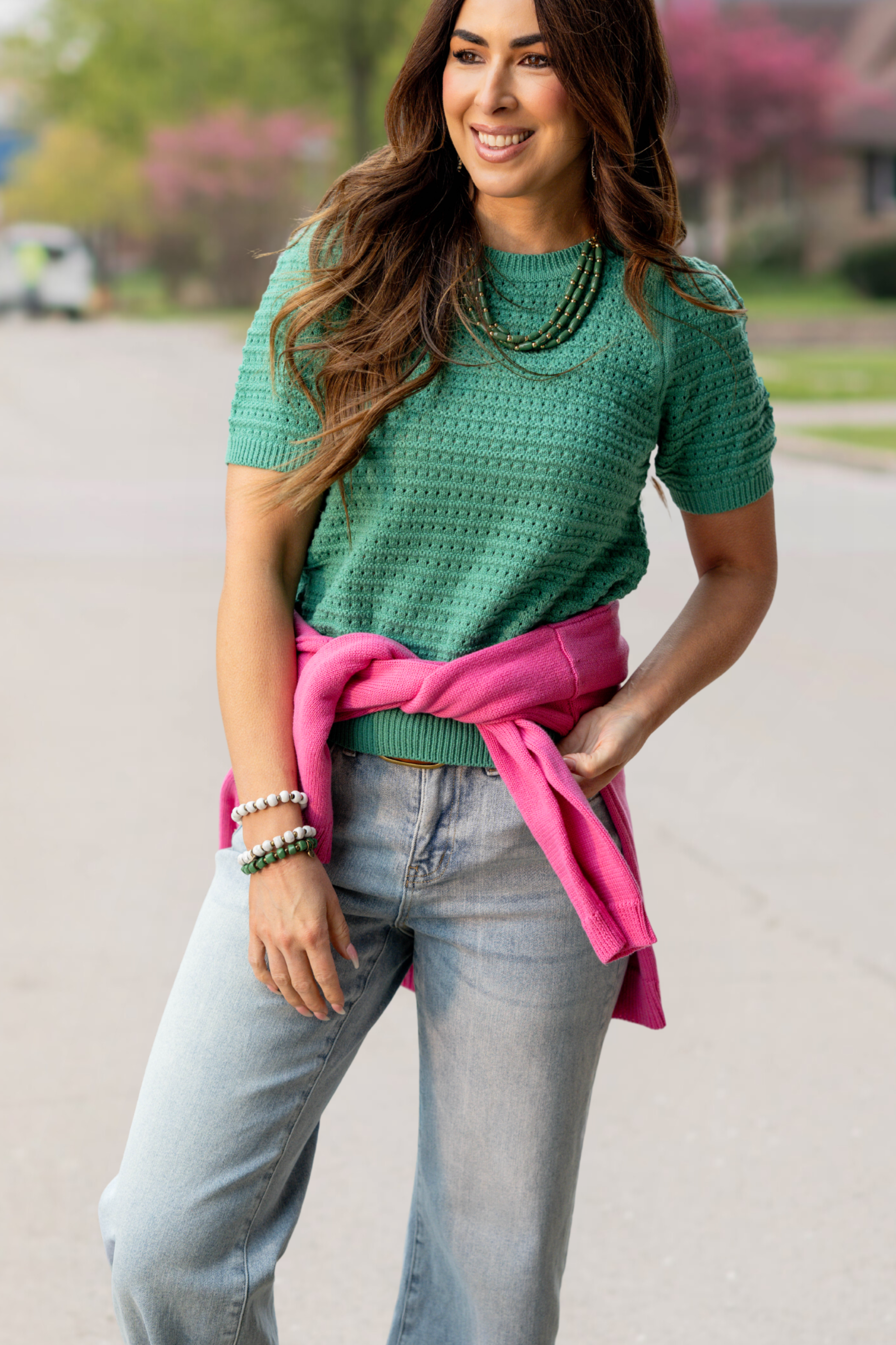 A textured short-sleeve knit that brings easy charm and everyday style together. Soft, breathable, and full of subtle detail — it’s the perfect top for spring transitions and casual dressing.