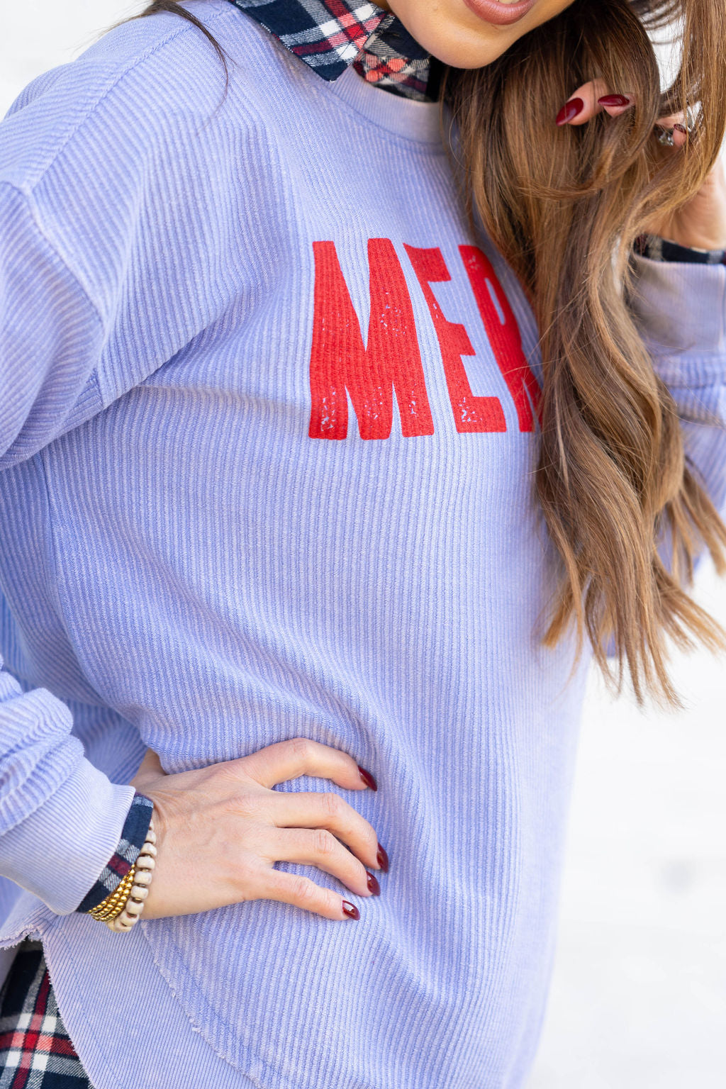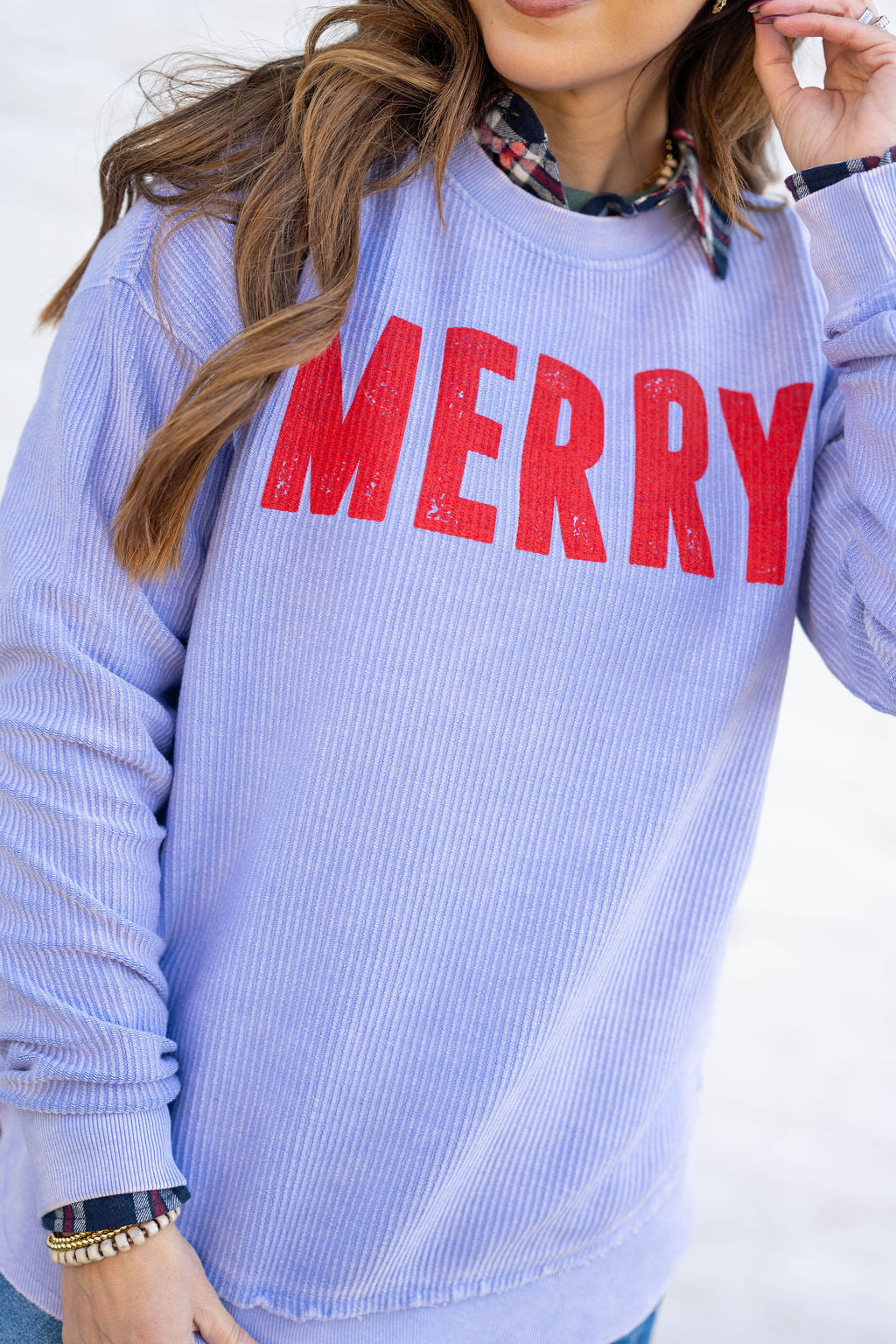 Spread cheer in the coziest way with this MERRY Corded Sweatshirt. Made from a soft, ribbed corded knit with a lived-in vintage wash, it features bold red “MERRY” lettering that pops beautifully against the pastel base.