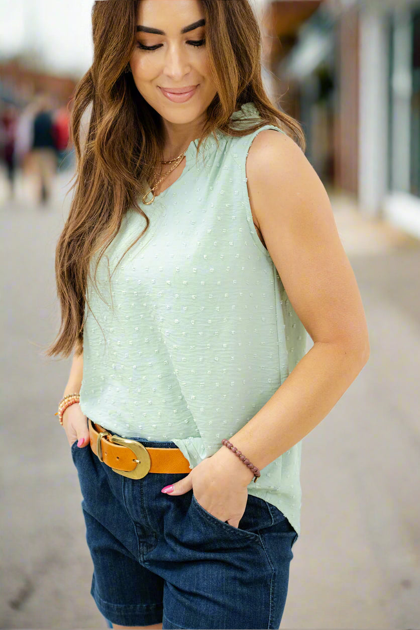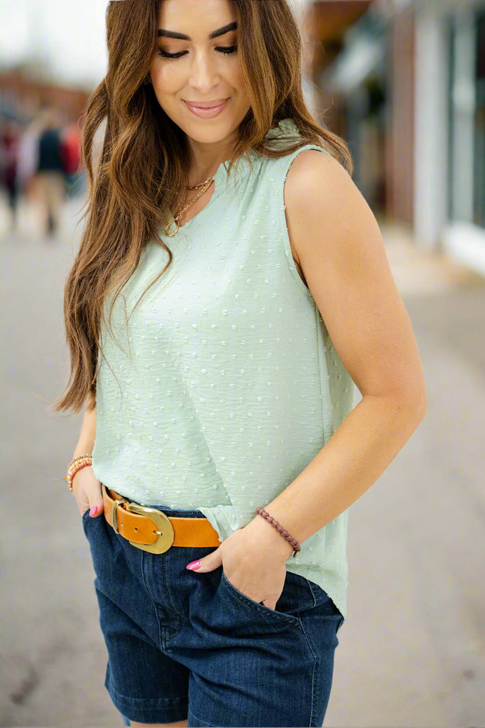 A little texture takes this tank to the next level and we're loving the ruffle trimmed v-neck style! This tank is lightweight and breathable making it ideal for those hot summer days but can just as easily be layered for any other season! We love how it can be dressed up or down for wherever the day takes you!