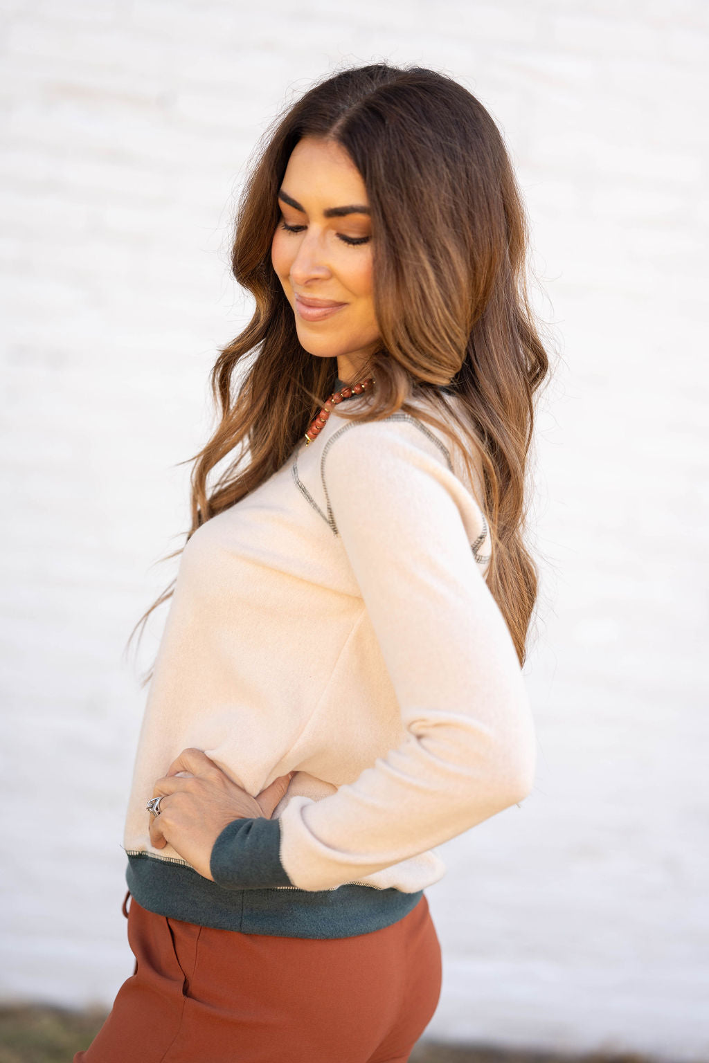 A soft contrast-trim pullover that feels as easy as your first cup of coffee. Designed with subtle stitching and a relaxed shape, it’s perfect for cozy mornings or casual days out.