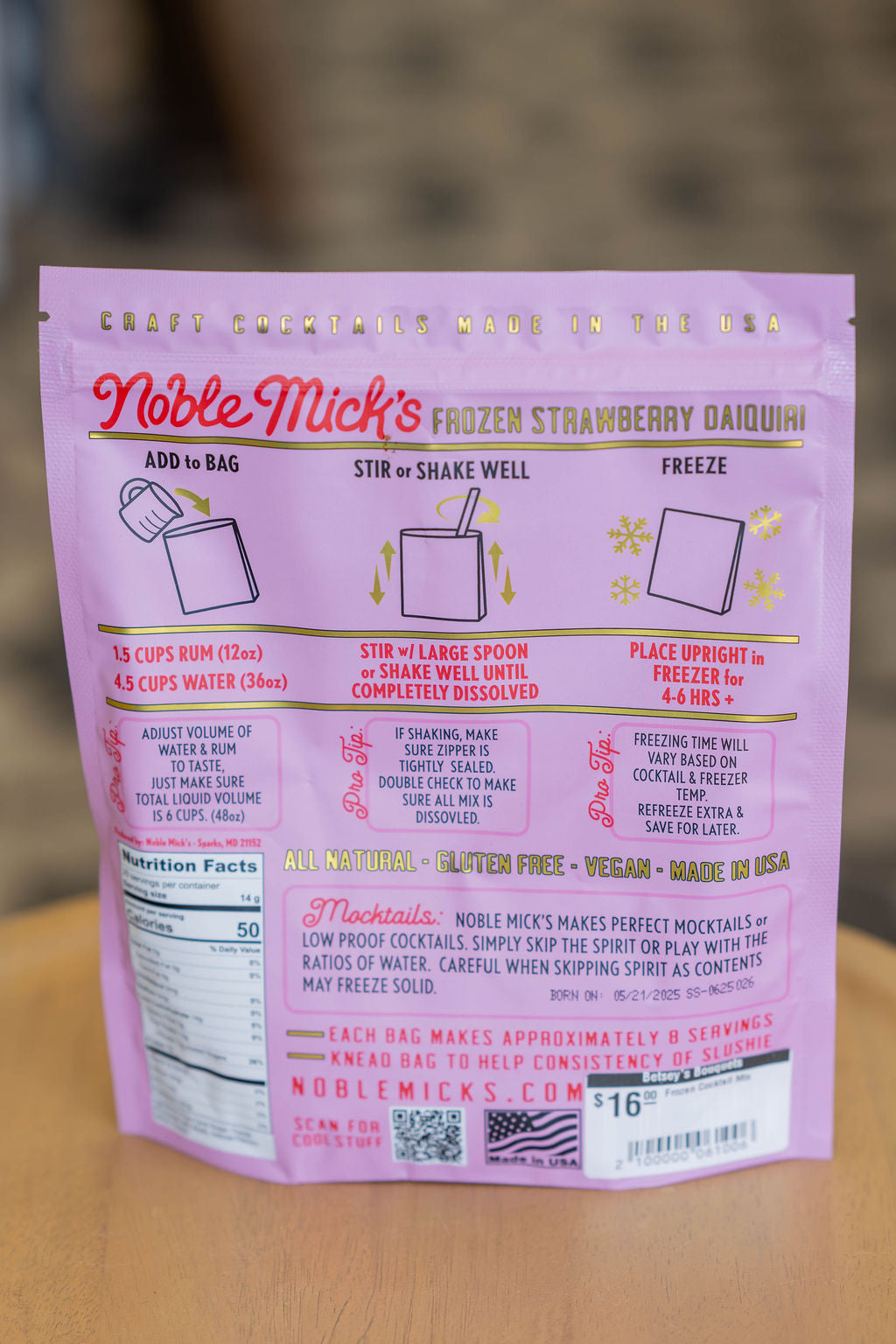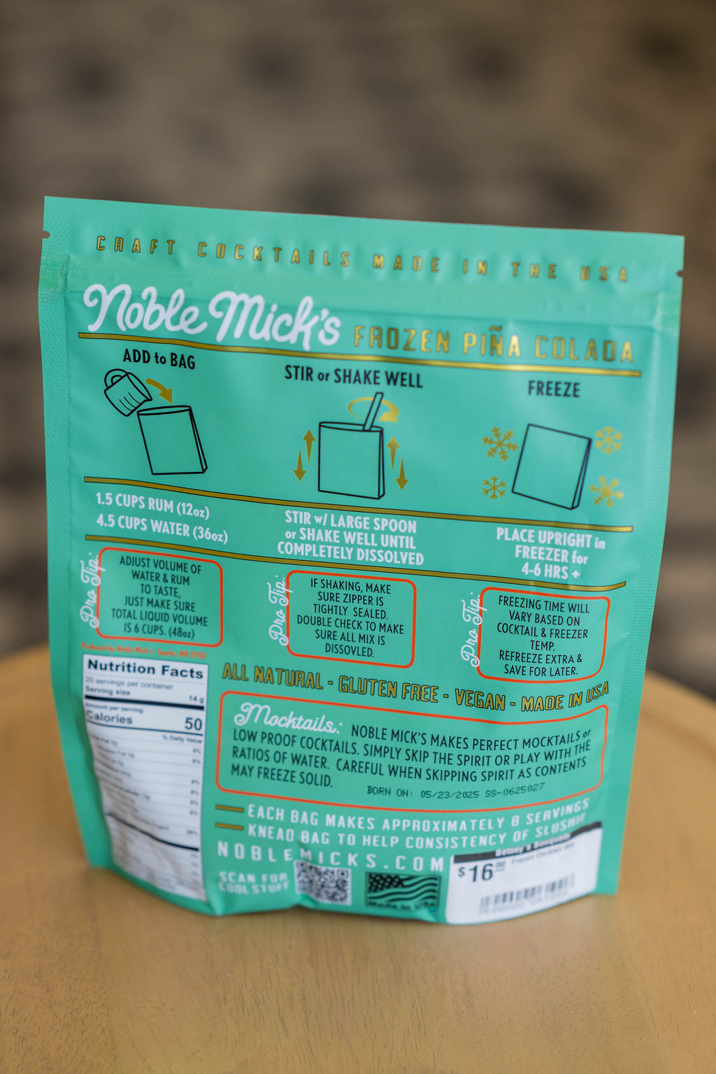 No blender required for the Noble Micks Frozen Cocktail Mixes! Just add water and your liquor of choice and stir or shake and then place in the freezer for 4-6 hours. Serves 8 Cocktails.