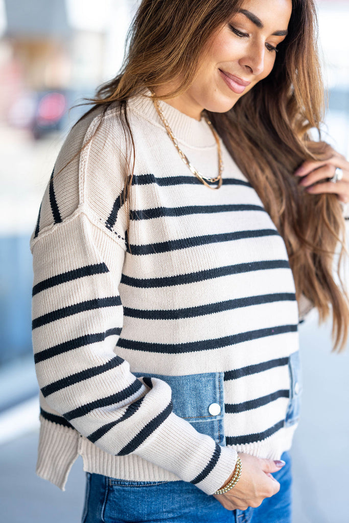 Classic stripes meet modern details in this playful knit. The denim-trimmed pockets add an unexpected twist, making this sweater both chic and functional. It’s the kind of piece that feels timeless yet fresh, ready to elevate your everyday looks.