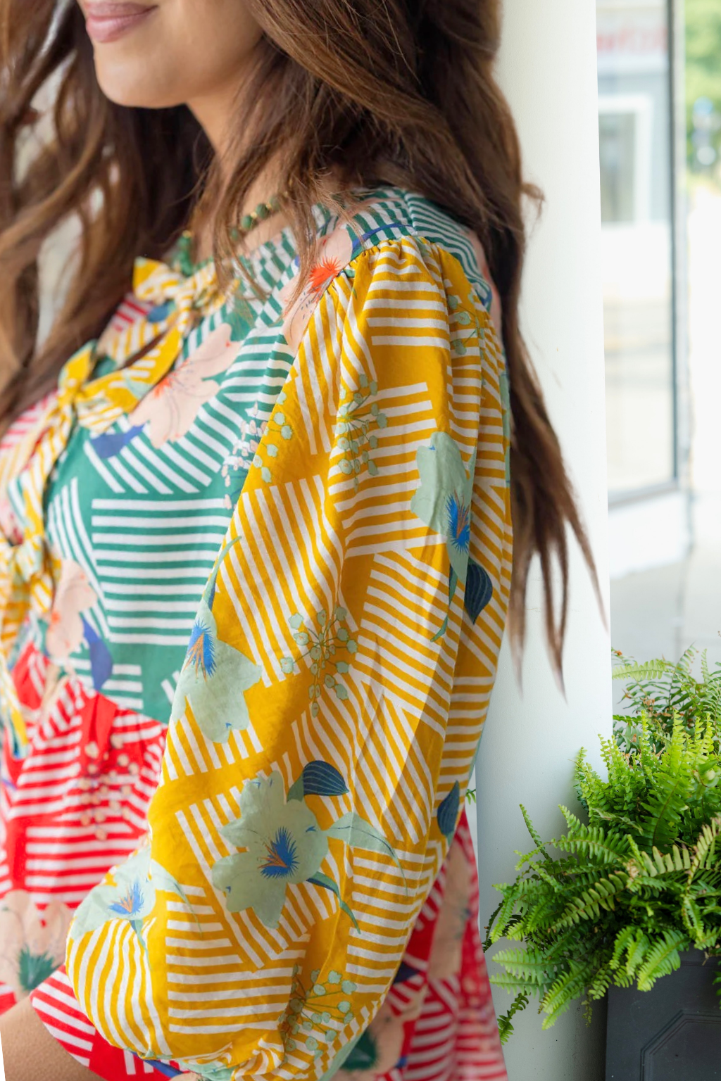Turn up the color and the charm in this vibrant mixed-print top! A lively blend of bold florals and playful stripes gives this piece its standout personality, while the tie-front neckline and billowy sleeves add a fun, feminine finish.