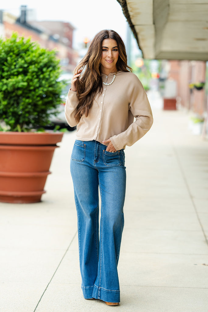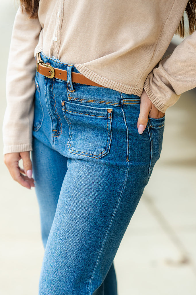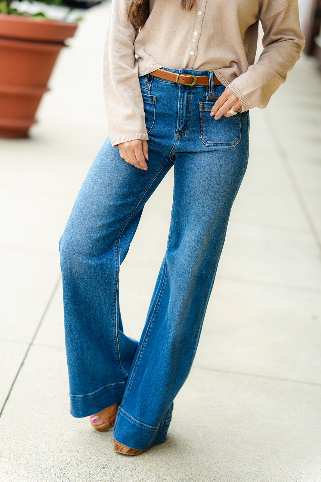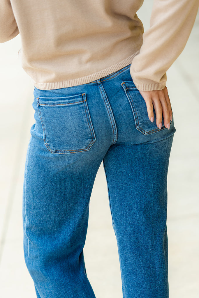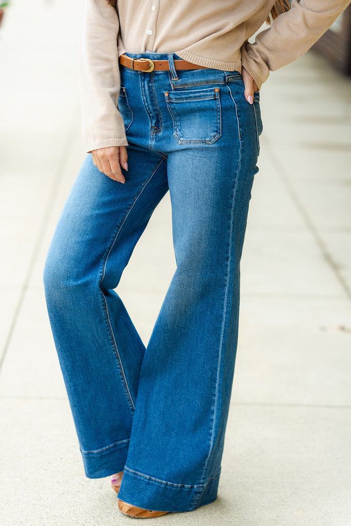 Nothing beats a good-fitting pair of jeans! These high-rise jeans feature a wide flare cut and fun patch pockets to give them that extra bit of character! With the perfect amount of stretch to hug every curve and their ease of styling, you're going to find yourself reaching for these daily!